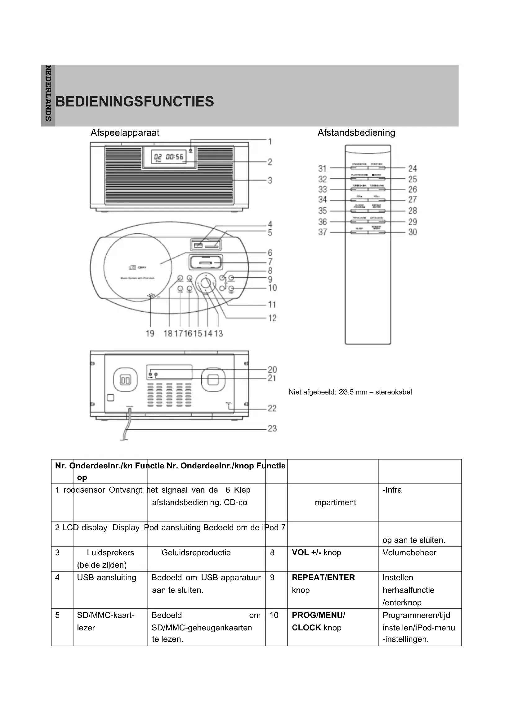 | 5 | SD/MMC-kaart-lezer | Bedoeld om SD/MMC-geheugenkaarten te lezen. | 10 | PROG/MENU/CLOCK knop | Programmeren/tijd instellen/iPod-menu -instelleningen. |