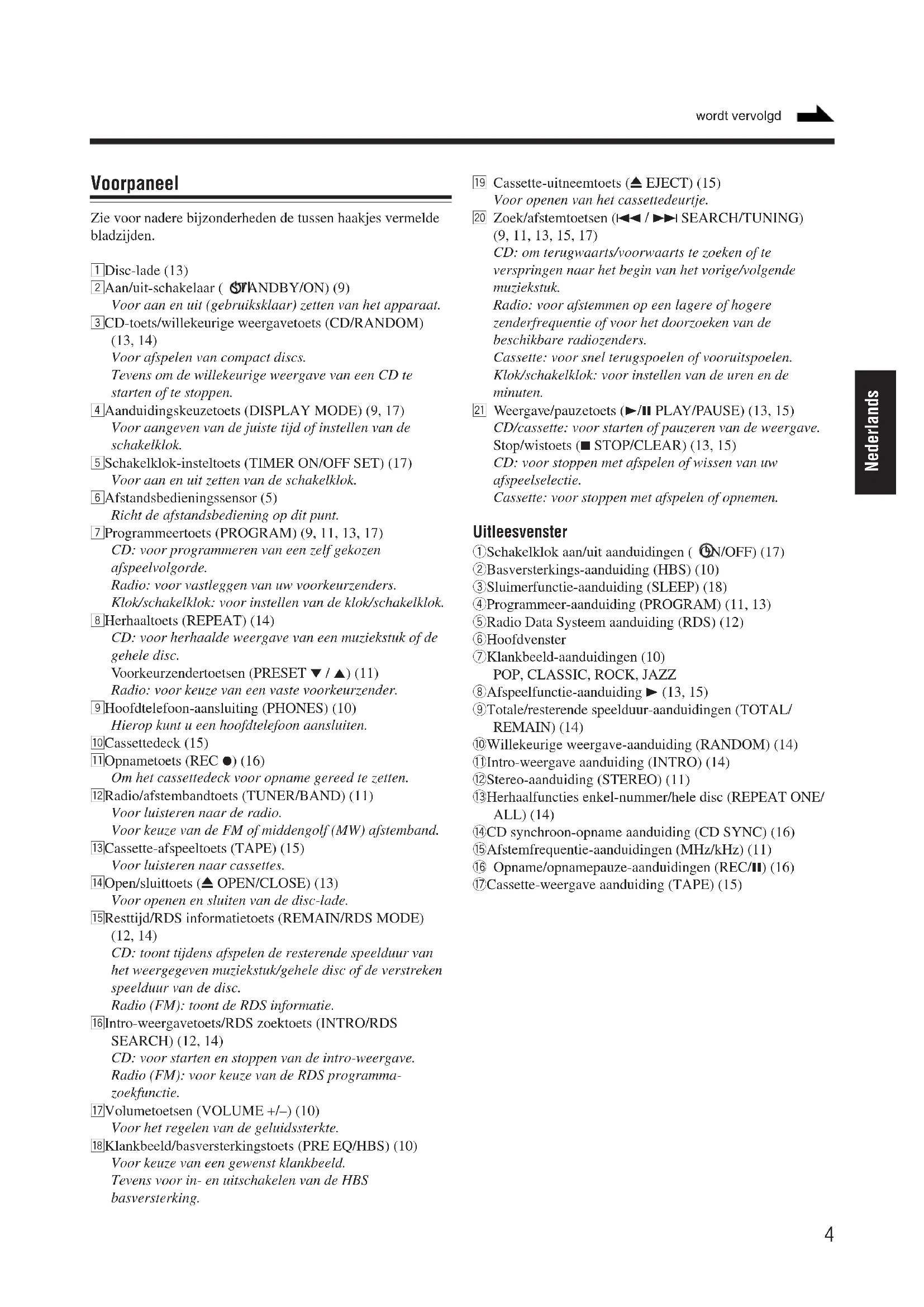 Uitleesvenster 04_01_22_UXM33_E_Nl.p65 9/20/02, 12:06 PM34 Nederlands wordt vervolgd Voorpaneel Zie voor nadere bijzonderheden de tussen haakjes vermelde bladzijden. 1 Disc-lade (13) 2 Aan/uit-schakelaar ( STANDBY/ON) (9) Voor aan en uit (gebruiksklaar) zetten van het apparaat. 3 CD-toets/willekeurige weergavetoets (CD/RANDOM) (13, 14) Voor afspelen van compact discs. Tevens om de willekeurige weergave van een CD te starten of te stoppen. 4 Aanduidingskeuzetoets (DISPLAY MODE) (9, 17) Voor aangeven van de juiste tijd of instellen van de schakelklok. 5 Schakelklok-insteltoets (TIMER ON/OFF SET) (17) Voor aan en uit zetten van de schakelklok. 6 Afstandsbedieningssensor (5) Richt de afstandsbediening op dit punt. 7 Programmeertoets (PROGRAM) (9, 11, 13, 17) CD: voor programmeren van een zelf gekozen afspeelvolgorde. Radio: voor vastleggen van uw voorkeurzenders. Klok/schakelklok: voor instellen van de klok/schakelklok. 8 Herhaaltoets (REPEAT) (14) CD: voor herhaalde weergave van een muziekstuk of de gehele disc. Voorkeurzendertoetsen (PRESET ∞ / 5) (11) Radio: voor keuze van een vaste voorkeurzender. 9 Hoofdtelefoon-aansluiting (PHONES) (10) Hierop kunt u een hoofdtelefoon aansluiten. p Cassettedeck (15) q Opnametoets (REC ¶) (16) Om het cassettedeck voor opname gereed te zetten. w Radio/afstembandtoets (TUNER/BAND) (11) Voor luisteren naar de radio. Voor keuze van de FM of middengolf (MW) afstemband. e Cassette-afspeeltoets (TAPE) (15) Voor luisteren naar cassettes. r Open/sluittoets (0 OPEN/CLOSE) (13) Voor openen en sluiten van de disc-lade. t Resttijd/RDS informatietoets (REMAIN/RDS MODE) (12, 14) CD: toont tijdens afspelen de resterende speelduur van het weergegeven muziekstuk/gehele disc of de verstreken speelduur van de disc. Radio (FM): toont de RDS informatie. y Intro-weergavetoets/RDS zoektoets (INTRO/RDS SEARCH) (12, 14) CD: voor starten en stoppen van de intro-weergave. Radio (FM): voor keuze van de RDS programma- zoekfunctie. u Volumetoetsen (VOLUME +/–) (10) Voor het regelen van de geluidssterkte. i Klankbeeld/basversterkingstoets (PRE EQ/HBS) (10) Voor keuze van een gewenst klankbeeld. Tevens voor in- en uitschakelen van de HBS basversterking. o Cassette-uitneemtoets (0 EJECT) (15) Voor openen van het cassettedeurtje. ; Zoek/afstemtoetsen (4 / ¢ SEARCH/TUNING) (9, 11, 13, 15, 17) CD: om terugwaarts/voorwaarts te zoeken of te verspringen naar het begin van het vorige/volgende muziekstuk. Radio: voor afstemmen op een lagere of hogere zenderfrequentie of voor het doorzoeken van de beschikbare radiozenders. Cassette: voor snel terugspoelen of vooruitspoelen. Klok/schakelklok: voor instellen van de uren en de minuten. a Weergave/pauzetoets (3/8 PLAY/PAUSE) (13, 15) CD/cassette: voor starten of pauzeren van de weergave. Stop/wistoets (7 STOP/CLEAR) (13, 15) CD: voor stoppen met afspelen of wissen van uw afspeelselectie. Cassette: voor stoppen met afspelen of opnemen. Uitleesvenster 1 Schakelklok aan/uit aanduidingen ( ON/OFF) (17) 2 Basversterkings-aanduiding (HBS) (10) 3 Sluimerfunctie-aanduiding (SLEEP) (18) 4 Programmeer-aanduiding (PROGRAM) (11, 13) 5 Radio Data Systeem aanduiding (RDS) (12) 6 Hoofdvenster 7 Klankbeeld-aanduidingen (10)