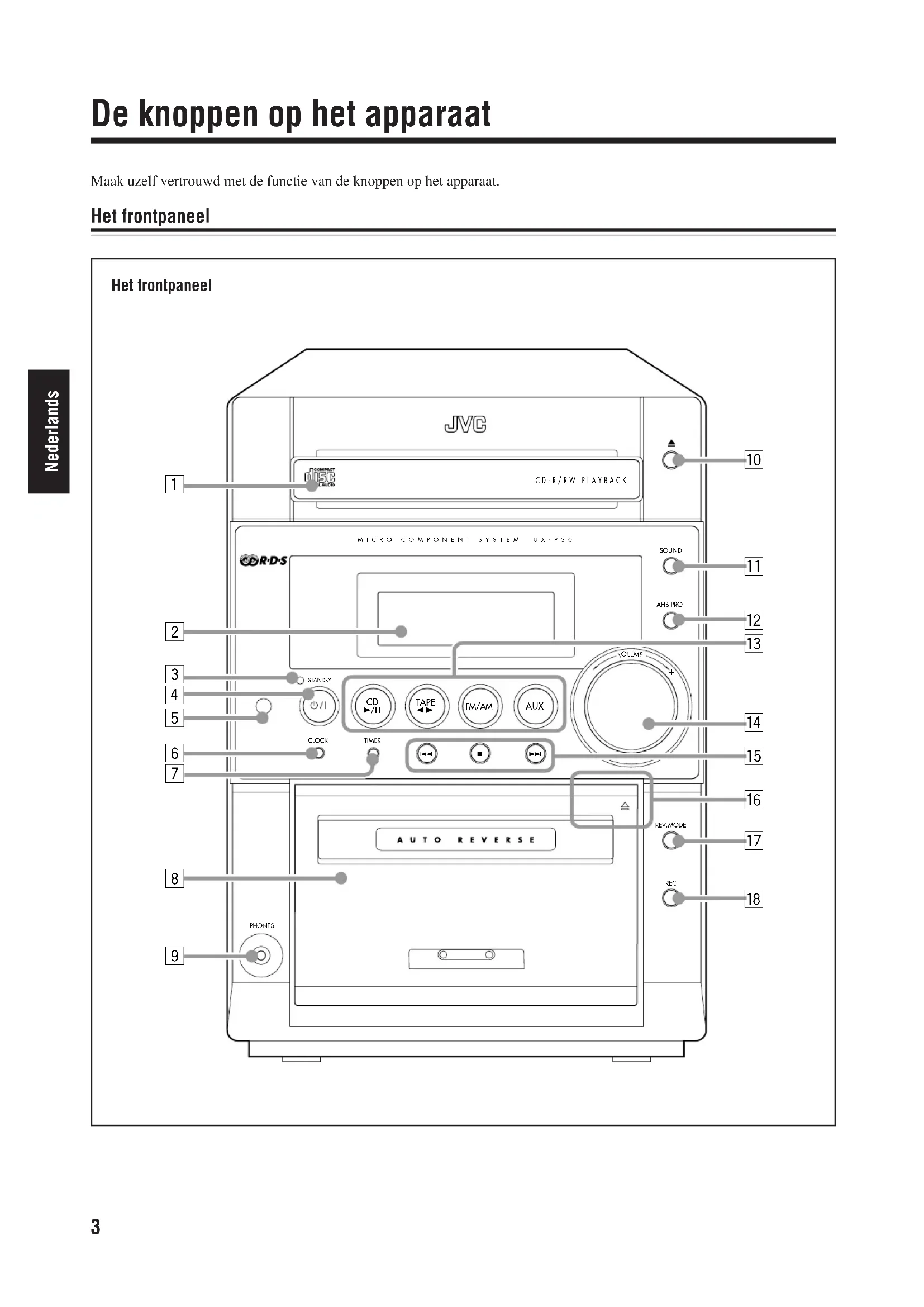 - Mocht een metalen object of vocht in het apparaat terechtkomen, dan dient u de stekker uit het wandcontact te halenen uw leverancier te raadplegen alvorens verder te gaan.• Als u het apparaat langere tijd niet gebruikt, dient u destekker uit het wandcontact te halen.Demonteer het apparaat NOOIT, aangezien hetgeen onderdelen bevat die door uzelf kunnenworden gerepareerd.Als er storingen optreden, haalt u de stekker uit hetwandcontact en neemt u contact op met de leverancier. NL01-08_UX-P30[E]f.pm6 03.4.21, 7:22 PM12 Nederlands Inhoudsopgave De knoppen op het apparaat ..................................... 3 Het frontpaneel ........................................................... 3 De afstandsbediening ................................................. 5 Aan de slag .................................................................. 6 Meegeleverde accessoires .......................................... 6 De batterijen in de afstandsbediening plaatsen .......... 6 De antennes aansluiten ............................................... 6 De luidsprekers aansluiten ......................................... 7 Overige apparatuur aansluiten .................................... 8 Algemene functies ....................................................... 9 De stroomtoevoer inschakelen ................................... 9 De klok instellen ........................................................ 9 Afspeelbronnen selecteren en afspelen ...................... 9 Het volume bijstellen ............................................... 10 De bassen versterken ................................................ 10 De geluidsmodi selecteren ....................................... 10 Luisteren naar FM- en AM (MG) -uitzendingen ... 11 Zenders opzoeken ..................................................... 11 Zenders programmeren ............................................ 11 Voorkeuzezenders opzoeken .................................... 12 FM-zenders ontvangen met RDS ............................ 13 De RDS-informatie wijzigen .................................... 13 Programma’s zoeken op PTY-codes (PTY-zoekopdracht) ........................................... 13 Tijdelijk naar een programma van uw keuze overschakelen ..................................................... 14 CD’s afspelen (CD/CD-R/CD-RW) ......................... 15 CD’s helemaal afspelen—Normal Play ................... 15 Basisfuncties CD ...................................................... 16 De afspeelvolgorde van de nummers programmeren—Program Play ........................... 16 In willekeurige volgorde afspelen —Random Play .................................................. 17 Tracks herhaald afspelen—Repeat Play ................... 17 CD-lade vergrendelen—Tray Lock .......................... 17 Cassettes afspelen ..................................................... 18 Een cassette afspelen ................................................ 18 Opnemen ................................................................... 19 Opnames op cassette maken..................................... 19 Rechtstreeks opnemen van CD ................................ 20 Eén nummer opnemen.............................................. 20 De tijdfuncties gebruiken ......................................... 21 De Daily Timer en Recording Timer gebruiken ....... 21 De Sleep Timer gebruiken ........................................ 22 Problemen oplossen .................................................. 23 Onderhoud ................................................................ 24 Aanvullende informatie ............................................ 25 Specificaties ............................................................... 26 NL01-08_UX-P30[E]f.pm6 03.4.21, 7:22 PM23 Nederlands