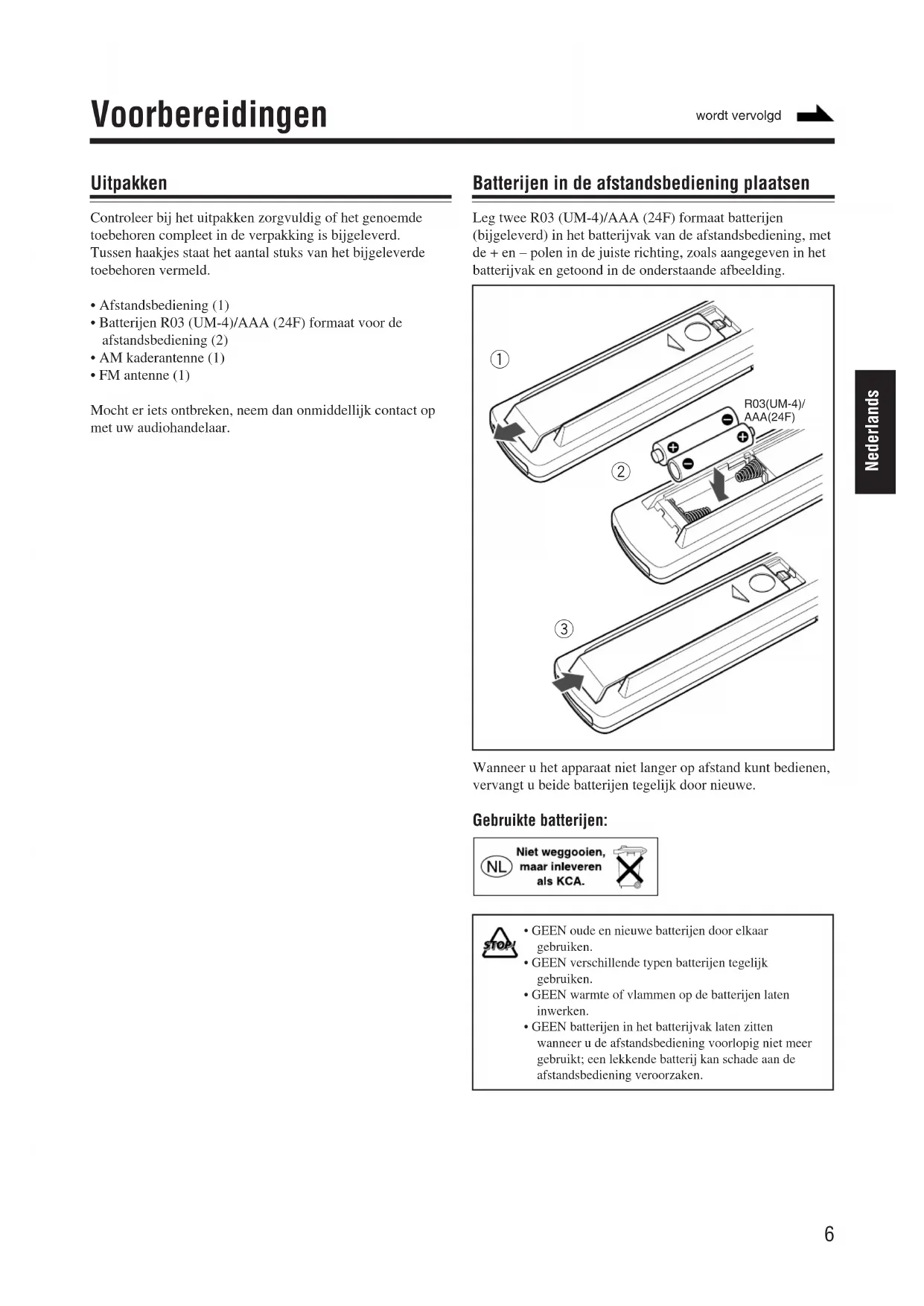 - GEEN oude en nieuwe batterijen door elkaargebruiken.• GEEN verschillende typen batterijen tegelijkgebruiken.• GEEN warmte of vlammen op de batterijen lateninwerken.• GEEN batterijen in het batterijvak laten zittenwanneer u de afstandsbediening voorlopig niet meergebruikt; een lekkende batterij kan schade aan deafstandsbediening veroorzaken. Voorbereidingen Uitpakken Controleer bij het uitpakken zorgvuldig of het genoemdetoebehoren compleet in de verpakking is bijgeleverd.Tussen haakjes staat het aantal stuks van het bijgeleverdetoebehoren vermeld.• Afstandsbediening (1)• Batterijen R03 (UM-4)/AAA (24F) formaat voor deafstandsbediening (2)• AM kaderantenne (1)• FM antenne (1)Mocht er iets ontbreken, neem dan onmiddellijk contact opmet uw audiohandelaar.