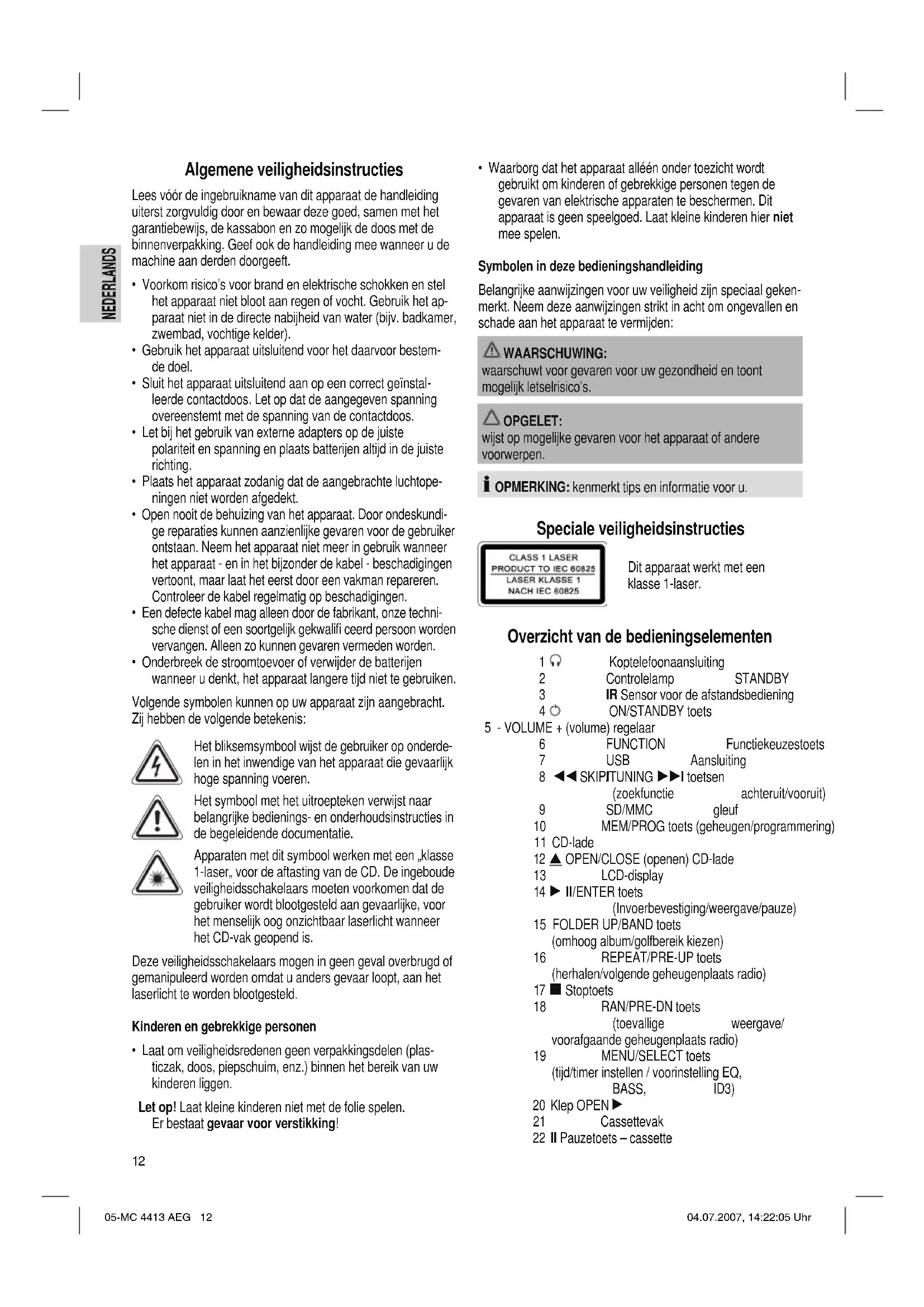 - Vlekken aan de buitenkant van het apparaat kunt u met een iets vochtige doek, zonder reinigingsmiddelen, afwegen. Technische gegevens Model: ........................................................... MC 4413 CD/MP3 Spanningstoevoer:................................................. 230 V, 50 Hz Uitgangsvermogen: .............................................. 100 W PMPO Beschermingsklasse:............................................................... ΙΙ Radio-element: Fequentiebereiken:..................UKW / FM 87,5 ~ 108,0 MHz .......................MW / AM 522 ~ 1620 kHz Dit apparaat is gekeurd conform de op dit moment van toepas- sing zijnde CE-richtlijnen zoals bijvoorbeeld elektromagnetische compatibiliteit en laagspanningsvoorschriften en is gecon- strueerd volgens de nieuwste veiligheidstechnische voorschrif- ten. Technische wijzigingen voorbehouden! Garantie Voor het door ons geleverde apparaat verlenen wij een garantie van 24 maanden vanaf koopdatum (kassabon). Eventuele gebreken aan het apparaat of aan het toebehoren die zijn ontstaan door productie- of materiaalfouten verhelpen wij binnen deze periode kosteloos door middel van reparatie of, naar ons oordeel, door vervanging. Eventuele garantiegevallen verlengen noch de geldigheidsduur van de garantie, noch begint daardoor een nieuwe garantieperiode! Het koopbewijs geldt als garantiebewijs. Zonder dit bewijs kan geen kosteloze reparatie of vervanging plaatsvinden. Geef in garantiegevallen het complete apparaat in de originele verpakking samen met de kassabon af bij uw handelaar. Niet alleen defecten aan de hulpstukken of aan de slijtende onderdelen, maar ook reiniging, onderhoud of de vervanging van slijtende delen vallen niet onder de garantie en geschieden altijd tegen berekening! Bij ingrepen door derden komt de garantieverlening te vervallen. 05-MC 4413 AEG 18 04.07.2007, 14:22:16 UhrNEDERLANDS