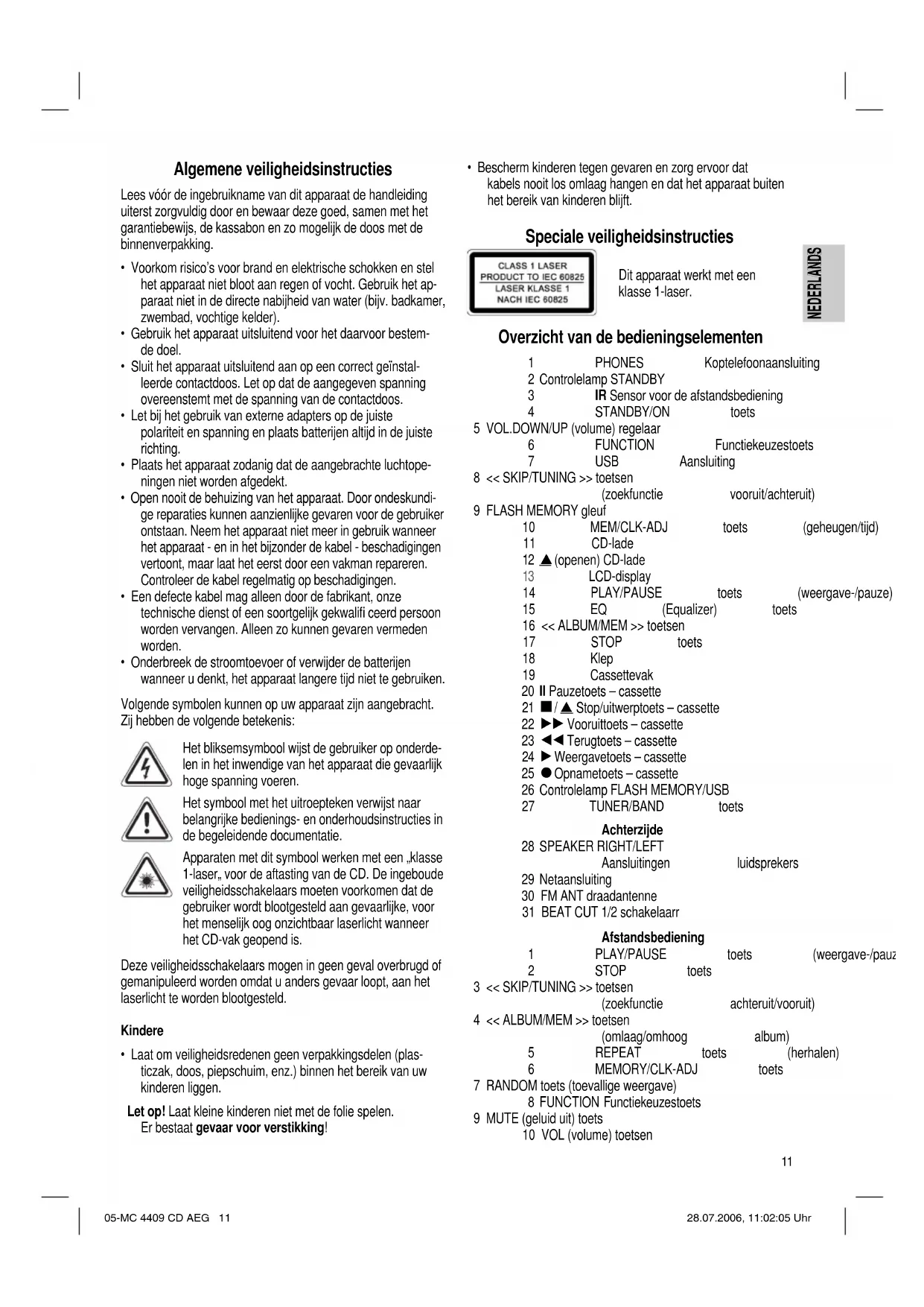 Aansluitingen luidsprekers 29 Netaansluiting 30 FM ANT draadantenne 31 BEAT CUT 1/2 schakelaarr Afstandsbediening 1 PLAY/PAUSE toets (weergave-/pauze) 2 STOP toets 3 << SKIP/TUNING >> toetsen (zoekfunctie achteruit/vooruit) 4 << ALBUM/MEM >> toetsen (omlaag/omhoog album) 5 REPEAT toets (herhalen) 6 MEMORY/CLK-ADJ toets 7 RANDOM toets (toevallige weergave) 8 FUNCTION Functiekeuzestoets 9 MUTE (geluid uit) toets 10 VOL (volume) toetsen 05-MC 4409 CD AEG 11 28.07.2006, 11:02:05 Uhr12 NEDERLANDS NEDERLANDS 11 ID3/FIND/ST./ESP toets 12 STANDBY/ON toets 13 TUNER/BAND toets 14 SLEEP toets 15 TIMER toets 16 EQ toets 17 TAPE toets Ingebruikname van de installatie/Inleiding