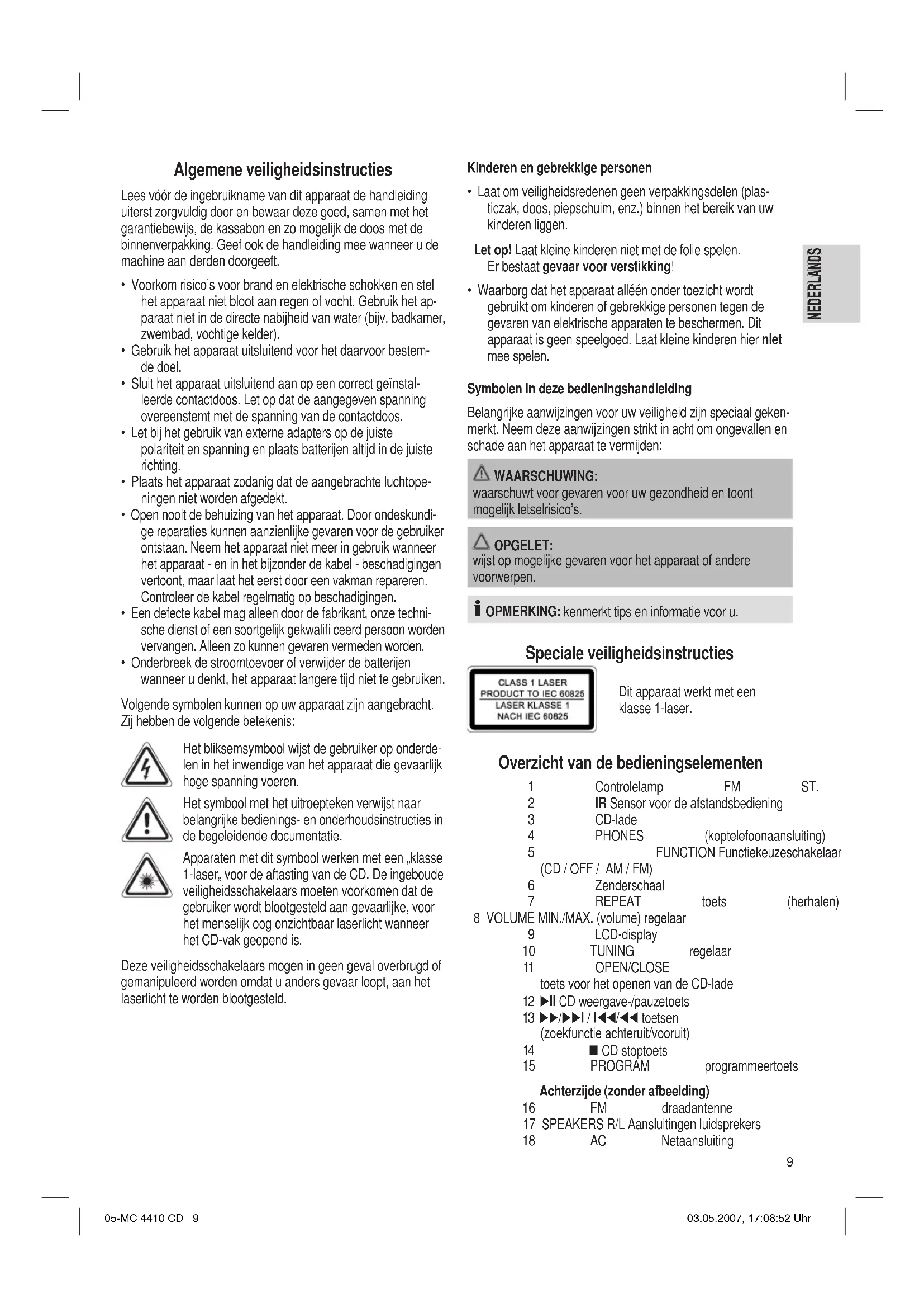 - Waarborg dat het apparaat alléén onder toezicht wordt gebruikt om kinderen of gebrekkige personen tegen de gevaren van elektrische apparaten te beschermen. Dit apparaat is geen speelgoed. Laat kleine kinderen hier niet mee spelen. Symbolen in deze bedieningshandleiding Belangrijke aanwijzingen voor uw veiligheid zijn speciaal geken- merkt. Neem deze aanwijzingen strikt in acht om ongevallen en schade aan het apparaat te vermijden: WAARSCHUWING: waarschuwt voor gevaren voor uw gezondheid en toont mogelijk letselrisico’s. OPGELET: wijst op mogelijke gevaren voor het apparaat of andere voorwerpen. OPMERKING: kenmerkt tips en informatie voor u. Speciale veiligheidsinstructies Dit apparaat werkt met een klasse 1-laser. Overzicht van de bedieningselementen 1 Controlelamp FM ST. 2 IR Sensor voor de afstandsbediening 3 CD-lade 4 PHONES (koptelefoonaansluiting) 5 FUNCTION Functiekeuzeschakelaar (CD / OFF / AM / FM) 6 Zenderschaal 7 REPEAT toets (herhalen) 8 VOLUME MIN./MAX. (volume) regelaar 9 LCD-display 10 TUNING regelaar 11 OPEN/CLOSE toets voor het openen van de CD-lade 12 II CD weergave-/pauzetoets 13 /I / I/ toetsen (zoekfunctie achteruit/vooruit) 14 CD stoptoets 15 PROGRAM programmeertoets Achterzijde (zonder afbeelding) 16 FM draadantenne 17 SPEAKERS R/L Aansluitingen luidsprekers 18 AC Netaansluiting 05-MC 4410 CD 9 03.05.2007, 17:08:52 Uhr10 NEDERLANDS NEDERLANDS Afstandsbediening A II weergave-/pauzetoets B STOP toets C INTRO toets D PROGRAM toets E I/ / /I SKIP/SEARCH toetsen (zoekfunctie achteruit/vooruit) F REPEAT toets (herhalen) Ingebruikname van de installatie/Inleiding