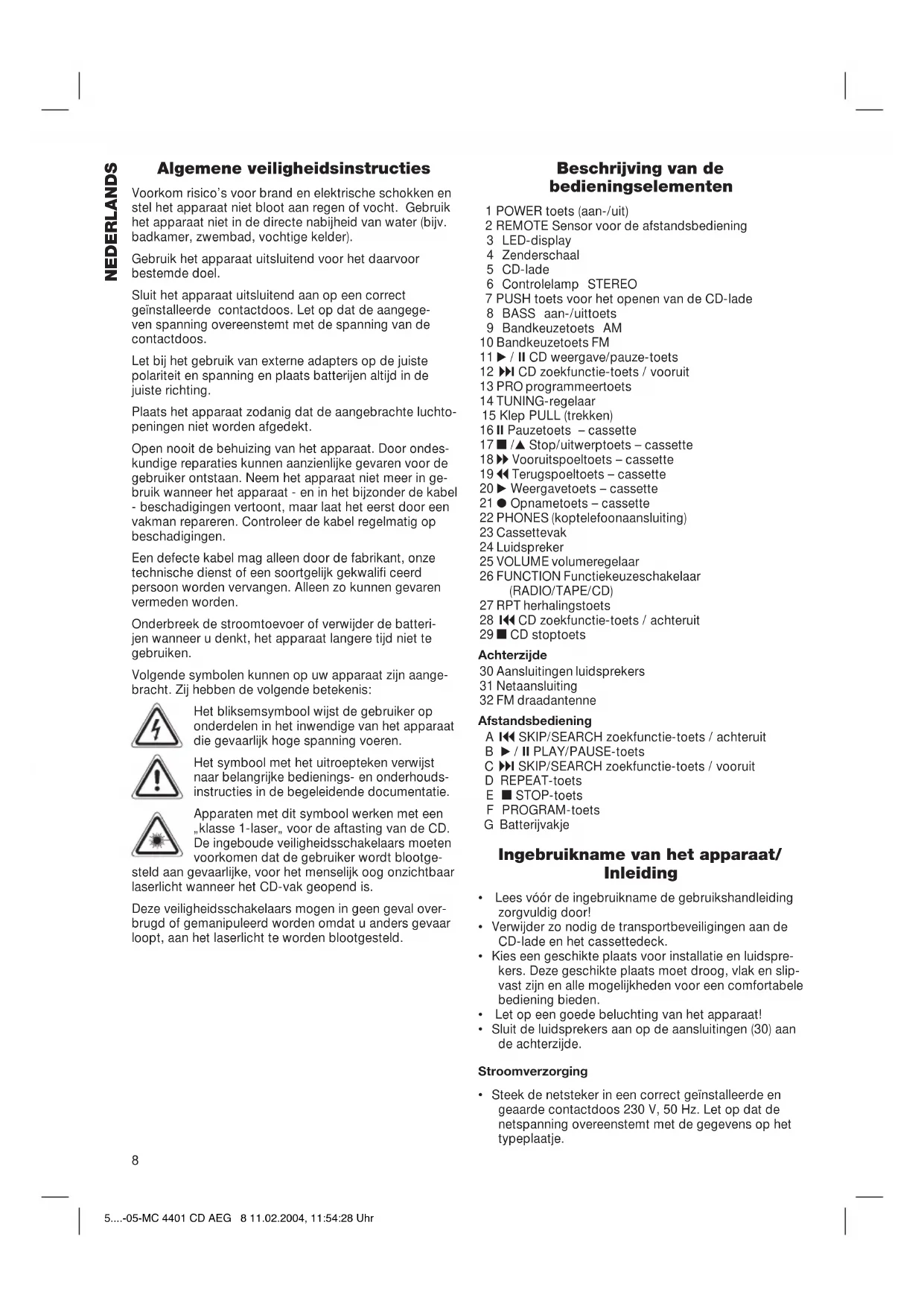 - Keine Reinigungsmittel oder Antistatik-Sprays wie bei Phonographen aufsprühen. Garantie Wir übernehmen für das von uns vertriebene Gerät eine Garantie von 24 Monaten ab Kaufdatum (Kassenbon). Innerhalb der Garantiezeit beseitigen wir unentgeltlich die Mängel des Gerätes oder des Zubehörs*), die auf Material- oder Herstellungsfehler beruhen, durch Repa- ratur oder, nach unserem Ermessen, durch Umtausch. Garantieleistungen bewirken weder eine Verlängerung der Garantiefrist, noch beginnt dadurch ein Anspruch auf eine neue Garantie! Als Garantienachweis gilt der Kaufbeleg. Ohne diesen Nachweis kann ein kostenloser Austausch oder eine kostenlose Reparatur nicht erfolgen. Im Garantiefall geben Sie bitte das Grundgerät in der Originalverpackung zusammen mit dem Kassenbon an Ihren Händler. *) Schäden an Zubehörteilen führen nicht automatisch zum kostenlosen Umtausch des kompletten Gerätes. Wenden Sie sich in desem Fall bitte an unsere Hotline! Glasbruchschäden bzw. Brüche von Kunststoffteilen sind grundsätzlich kostenpfl ichtig! Sowohl Defekte an Verbrauchszubehör bzw. Verschleiß- teilen (z.B. Motorkohlen, Knethaken, Antriebsriemen, Ersatzfernbedienung, Ersatzzahnbürsten, Sägeblättern usw.), als auch Reinigung, Wartung oder der Austausch von Verschleißteilen, fallen nicht unter die Garantie und sind deshalb kostenpfl ichtig! Die Garantie erlischt bei Fremdeingriff. 5....-05-MC 4401 CD AEG 6 11.02.2004, 11:54:27 Uhr7 DEUTSCH Nach der Garantie Nach Ablauf der Garantiezeit können Reparaturen kostenpfl ichtig vom entsprechenden Fachhandel oder Reparaturservice ausgeführt werden. 5....-05-MC 4401 CD AEG 7 11.02.2004, 11:54:28 Uhr8 NEDERLANDS Algemene veiligheidsinstructies Voorkom risico’s voor brand en elektrische schokken en stel het apparaat niet bloot aan regen of vocht. Gebruik het apparaat niet in de directe nabijheid van water (bijv. badkamer, zwembad, vochtige kelder). Gebruik het apparaat uitsluitend voor het daarvoor bestemde doel. Sluit het apparaat uitsluitend aan op een correct geïnstalleerde contactdoos. Let op dat de aangege- ven spanning overeenstemt met de spanning van de contactdoos. Let bij het gebruik van externe adapters op de juiste polariteit en spanning en plaats batterijen altijd in de juiste richting. Plaats het apparaat zodanig dat de aangebrachte luchto- peningen niet worden afgedekt. Open nooit de behuizing van het apparaat. Door ondes- kundige reparaties kunnen aanzienlijke gevaren voor de gebruiker ontstaan. Neem het apparaat niet meer in ge- bruik wanneer het apparaat - en in het bijzonder de kabel - beschadigingen vertoont, maar laat het eerst door een vakman repareren. Controleer de kabel regelmatig op beschadigingen. Een defecte kabel mag alleen door de fabrikant, onze technische dienst of een soortgelijk gekwalifi ceerd persoon worden vervangen. Alleen zo kunnen gevaren vermeden worden. Onderbreek de stroomtoevoer of verwijder de batteri- jen wanneer u denkt, het apparaat langere tijd niet te gebruiken. Volgende symbolen kunnen op uw apparaat zijn aange- bracht. Zij hebben de volgende betekenis: Het bliksemsymbool wijst de gebruiker op onderdelen in het inwendige van het apparaat die gevaarlijk hoge spanning voeren. Het symbool met het uitroepteken verwijst naar belangrijke bedienings- en onderhouds- instructies in de begeleidende documentatie. Apparaten met dit symbool werken met een „klasse 1-laser„ voor de aftasting van de CD. De ingeboude veiligheidsschakelaars moeten voorkomen dat de gebruiker wordt blootge- steld aan gevaarlijke, voor het menselijk oog onzichtbaar laserlicht wanneer het CD-vak geopend is. Deze veiligheidsschakelaars mogen in geen geval over- brugd of gemanipuleerd worden omdat u anders gevaar loopt, aan het laserlicht te worden blootgesteld. Beschrijving van de bedieningselementen 1 POWER toets (aan-/uit) 2 REMOTE Sensor voor de afstandsbediening 3 LED-display 4 Zenderschaal 5 CD-lade 6 Controlelamp STEREO 7 PUSH toets voor het openen van de CD-lade 8 BASS aan-/uittoets 9 Bandkeuzetoets AM 10 Bandkeuzetoets FM 11 / II CD weergave/pauze-toets 12 I CD zoekfunctie-toets / vooruit 13 PRO programmeertoets 14 TUNING-regelaar 15 Klep PULL (trekken) 16 II Pauzetoets – cassette 17 / Stop/uitwerptoets – cassette 18 Vooruitspoeltoets – cassette 19 Terugspoeltoets – cassette 20 Weergavetoets – cassette 21 Opnametoets – cassette 22 PHONES (koptelefoonaansluiting) 23 Cassettevak 24 Luidspreker 25 VOLUME volumeregelaar 26 FUNCTION Functiekeuzeschakelaar (RADIO/TAPE/CD) 27 RPT herhalingstoets 28 I CD zoekfunctie-toets / achteruit 29 CD stoptoets Achterzijde 30 Aansluitingen luidsprekers 31 Netaansluiting 32 FM draadantenne Afstandsbediening A I SKIP/SEARCH zoekfunctie-toets / achteruit B / II PLAY/PAUSE-toets C I SKIP/SEARCH zoekfunctie-toets / vooruit D REPEAT-toets E STOP-toets F PROGRAM-toets G Batterijvakje Ingebruikname van het apparaat/ Inleiding