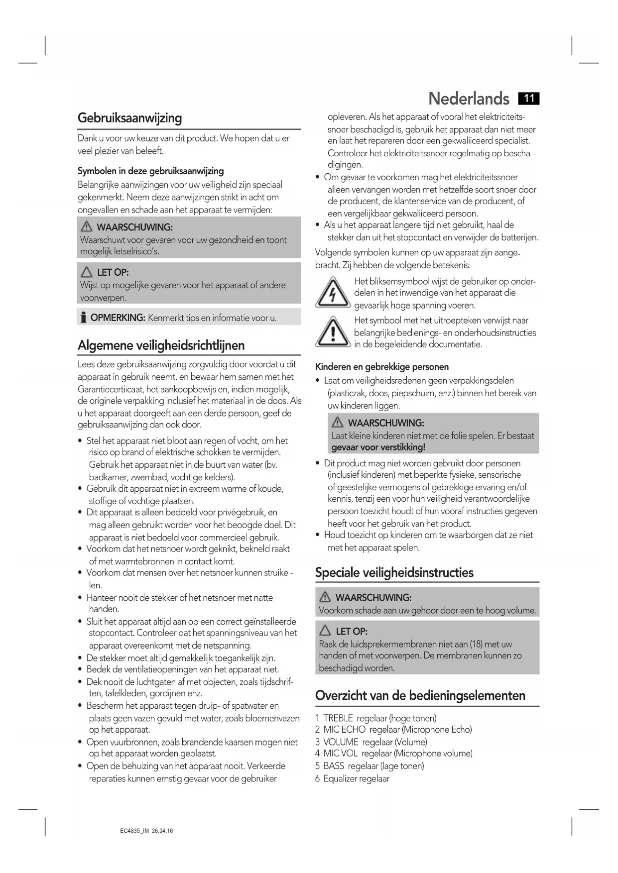 - Houd toezicht op kinderen om te waarborgen dat ze niet met het apparaat spelen. Speciale veiligheidsinstructies WAARSCHUWING: Voorkom schade aan uw gehoor door een te hoog volume. LET OP: Raak de luidsprekermembranen niet aan (18) met uw handen of met voorwerpen. De membranen kunnen zo beschadigd worden. Overzicht van de bedieningselementen 1 TREBLE regelaar (hoge tonen) 2 MIC ECHO regelaar (Microphone Echo) 3 VOLUME regelaar (Volume) 4 MIC VOL regelaar (Microphone volume) 5 BASS regelaar (lage tonen) 6 Equalizer regelaar12 Nederlands
