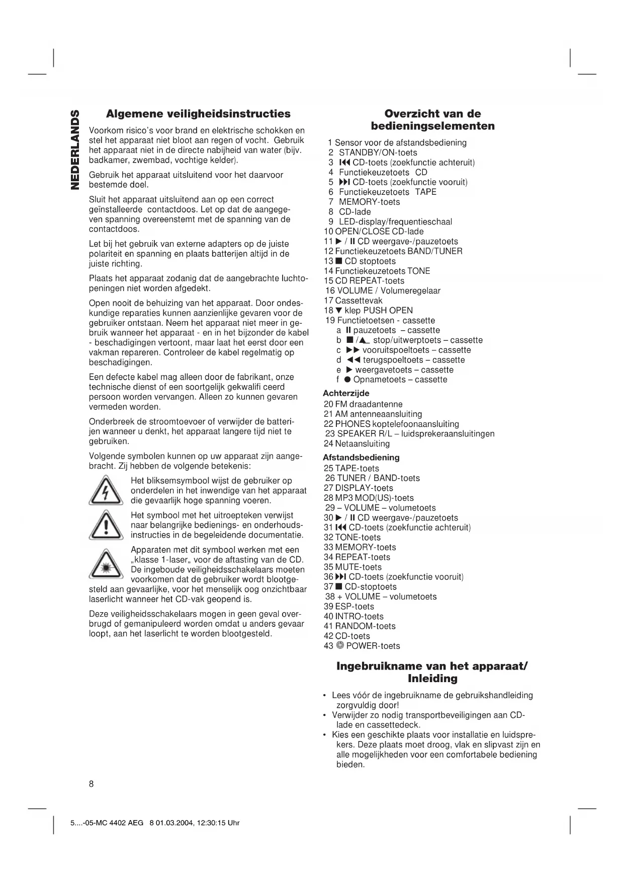 - Kies een geschikte plaats voor installatie en luidspre- kers. Deze plaats moet droog, vlak en slipvast zijn en alle mogelijkheden voor een comfortabele bediening bieden. 5....-05-MC 4402 AEG 8 01.03.2004, 12:30:15 Uhr9 NEDERLANDS