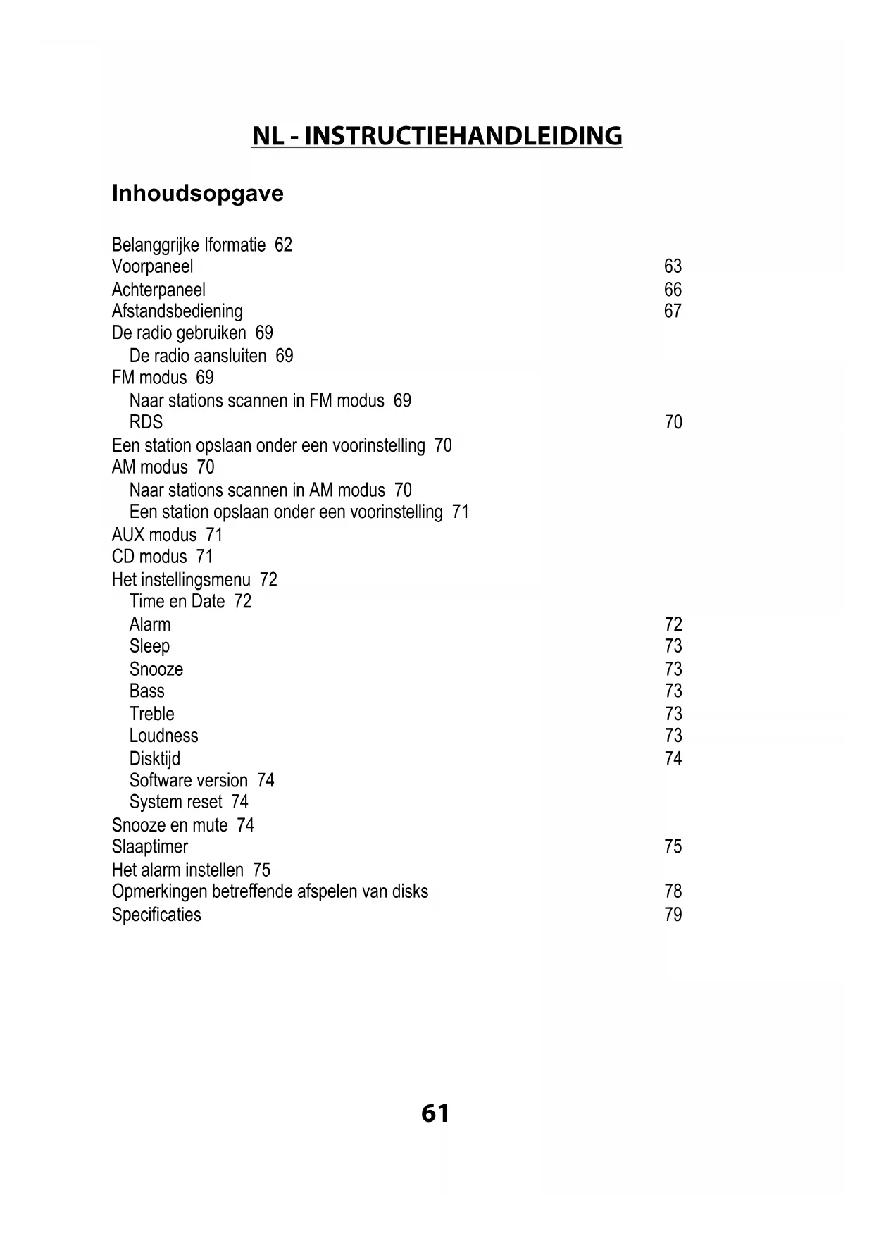 Inhoudsopgave Belanggrijke Iformatie 62 Voorpaneel 63 Achterpaneel 66 Afstandsbediening 67 De radio gebruiken 69 De radio aansluiten 69 FM modus 69 Naar stations scannen in FM modus 69 RDS 70 Een station opslaan onder een voorinstelling 70 AM modus 70 Naar stations scannen in AM modus 70 Een station opslaan onder een voorinstelling 71 AUX modus 71 CD modus 71 Het instellingsmenu 72 Time en Date 72 Alarm 72 Sleep 73 Snooze 73 Bass 73 Treble 73 Loudness 73 Disktijd 74 Software version 74 System reset 74 Snooze en mute 74 Slaaptimer 75 Het alarm instellen 75 Opmerkingen betreffende afspelen van disks 78 Specificaties 7962 Belanggrijke Iformatie Gefeliciteerd met uw nieuwe apparaat! Lees deze handleiding zorgvuldig door om te vermijden dat het apparaat verkeerd werkt en beschadigt wordt. Dan zult u heel lang plezier van uw apparaat hebben.