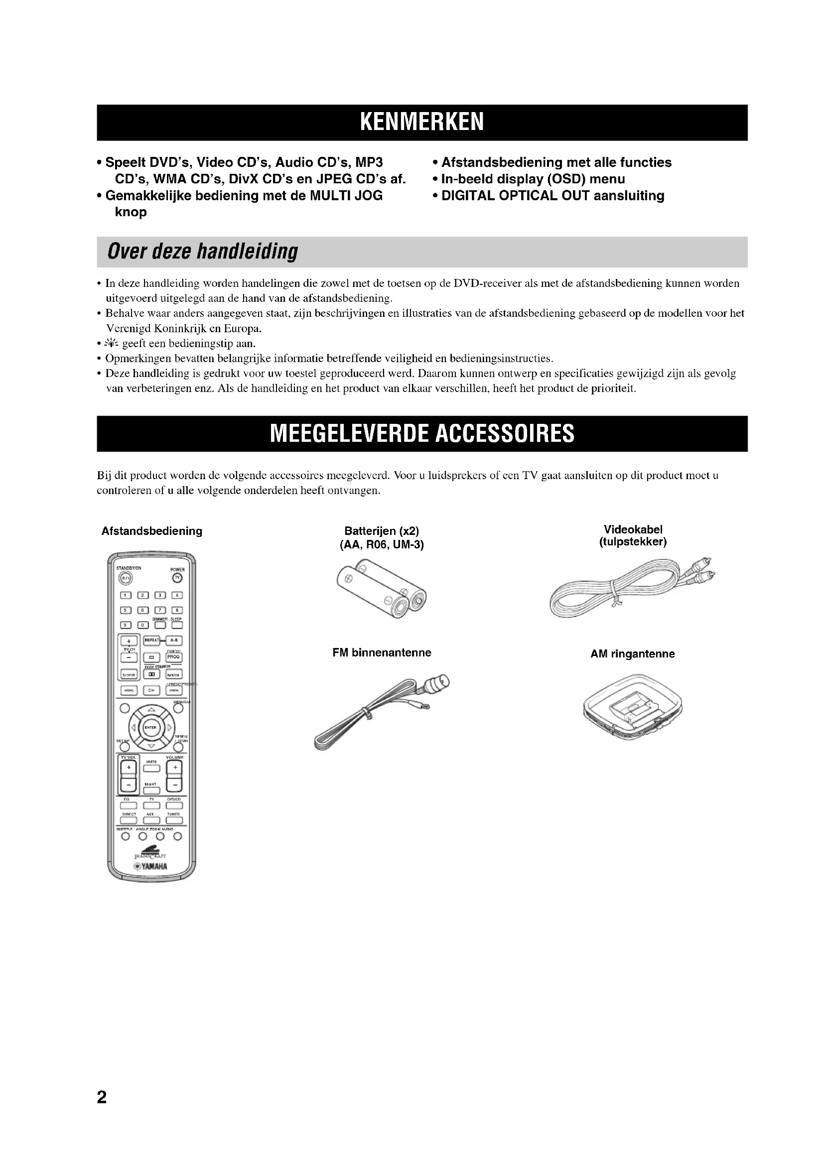 - Deze handleiding is gedrukt voor uw toestel geproduceerd werd. Daarom kunnen ontwerp en specificaties gewijzigd zijn als gevolg van verbeteringen enz. Als de handleiding en het product van elkaar verschillen, heeft het product de prioriteit. Bij dit product worden de volgende accessoires meegeleverd. Voor u luidsprekers of een TV gaat aansluiten op dit product moet u controleren of u alle volgende onderdelen heeft ontvangen. KENMERKEN Over deze handleiding MEEGELEVERDE ACCESSOIRES POWER STANDBY/ON
