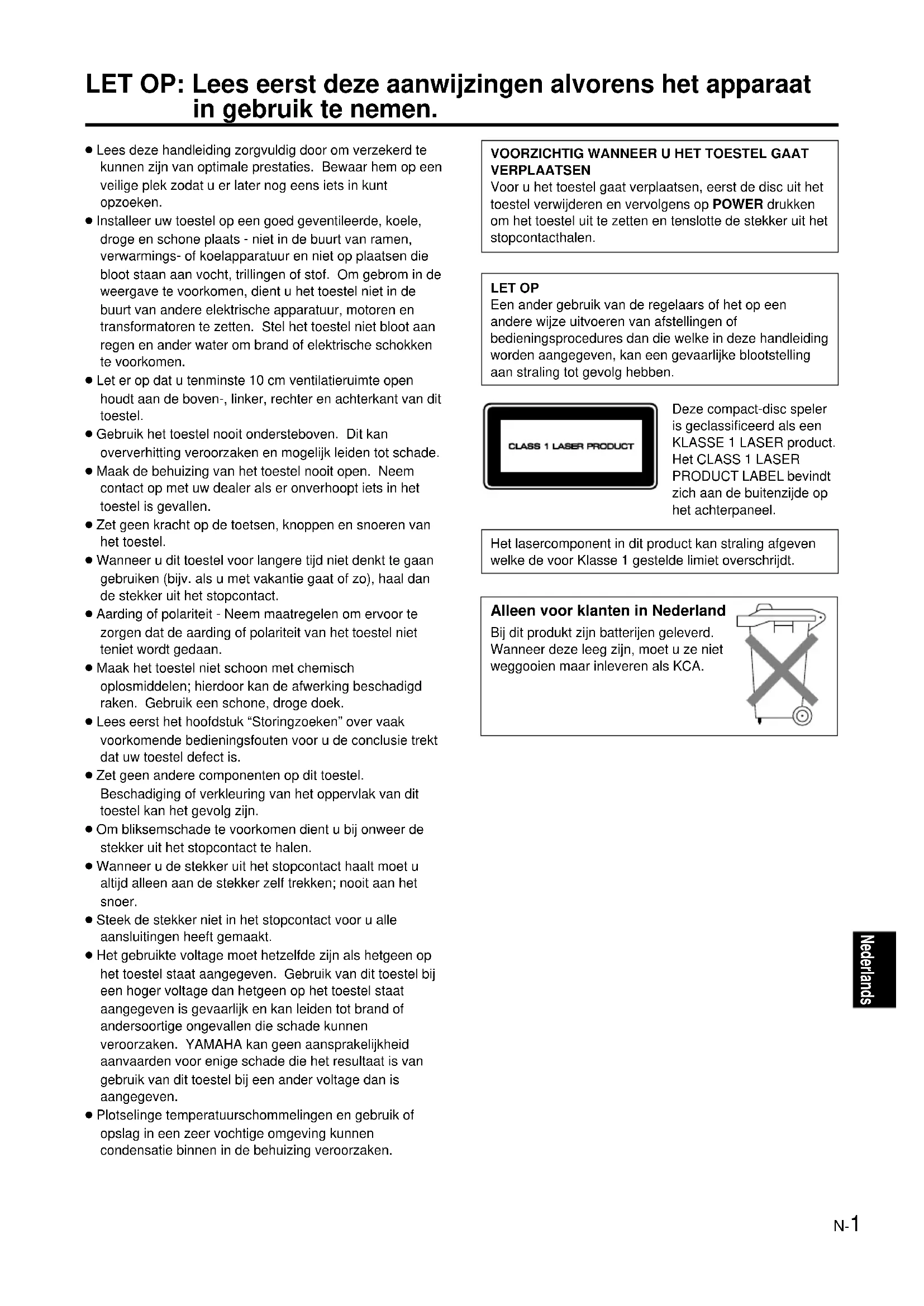 VERPLAATSEN Voor u het toestel gaat verplaatsen, eerst de disc uit het toestel verwijderen en vervolgens op POWER drukken om het toestel uit te zetten en tenslotte de stekker uit het stopcontacthalen. LET OP Een ander gebruik van de regelaars of het op een andere wijze uitvoeren van afstellingen of bedieningsprocedures dan die welke in deze handleiding worden aangegeven, kan een gevaarlijke blootstelling aan straling tot gevolg hebben. Deze compact-disc speler is geclassificeerd als een KLASSE 1 LASER product. Het CLASS 1 LASER PRODUCT LABEL bevindt zich aan de buitenzijde op het achterpaneel. Het lasercomponent in dit product kan straling afgeven welke de voor Klasse 1 gestelde limiet overschrijdt. ● Lees deze handleiding zorgvuldig door om verzekerd te kunnen zijn van optimale prestaties. Bewaar hem op een veilige plek zodat u er later nog eens iets in kunt opzoeken. ● Installeer uw toestel op een goed geventileerde, koele, droge en schone plaats - niet in de buurt van ramen, verwarmings- of koelapparatuur en niet op plaatsen die bloot staan aan vocht, trillingen of stof. Om gebrom in de weergave te voorkomen, dient u het toestel niet in de buurt van andere elektrische apparatuur, motoren en transformatoren te zetten. Stel het toestel niet bloot aan regen en ander water om brand of elektrische schokken te voorkomen. ● Let er op dat u tenminste 10 cm ventilatieruimte open houdt aan de boven-, linker, rechter en achterkant van dit toestel. ● Gebruik het toestel nooit ondersteboven. Dit kan oververhitting veroorzaken en mogelijk leiden tot schade. ● Maak de behuizing van het toestel nooit open. Neem contact op met uw dealer als er onverhoopt iets in het toestel is gevallen. ● Zet geen kracht op de toetsen, knoppen en snoeren van het toestel. ● Wanneer u dit toestel voor langere tijd niet denkt te gaan gebruiken (bijv. als u met vakantie gaat of zo), haal dan de stekker uit het stopcontact. ● Aarding of polariteit - Neem maatregelen om ervoor te zorgen dat de aarding of polariteit van het toestel niet teniet wordt gedaan. ● Maak het toestel niet schoon met chemisch oplosmiddelen; hierdoor kan de afwerking beschadigd raken. Gebruik een schone, droge doek. ● Lees eerst het hoofdstuk “Storingzoeken” over vaak voorkomende bedieningsfouten voor u de conclusie trekt dat uw toestel defect is. ● Zet geen andere componenten op dit toestel. Beschadiging of verkleuring van het oppervlak van dit toestel kan het gevolg zijn. ● Om bliksemschade te voorkomen dient u bij onweer de stekker uit het stopcontact te halen. ● Wanneer u de stekker uit het stopcontact haalt moet u altijd alleen aan de stekker zelf trekken; nooit aan het snoer. ● Steek de stekker niet in het stopcontact voor u alle aansluitingen heeft gemaakt. ● Het gebruikte voltage moet hetzelfde zijn als hetgeen op het toestel staat aangegeven. Gebruik van dit toestel bij een hoger voltage dan hetgeen op het toestel staat aangegeven is gevaarlijk en kan leiden tot brand of andersoortige ongevallen die schade kunnen veroorzaken. YAMAHA kan geen aansprakelijkheid aanvaarden voor enige schade die het resultaat is van gebruik van dit toestel bij een ander voltage dan is aangegeven. ● Plotselinge temperatuurschommelingen en gebruik of opslag in een zeer vochtige omgeving kunnen condensatie binnen in de behuizing veroorzaken. LET OP: Lees eerst deze aanwijzingen alvorens het apparaat in gebruik te nemen. Alleen voor klanten in Nederland Bij dit produkt zijn batterijen geleverd. Wanneer deze leeg zijn, moet u ze niet weggooien maar inleveren als KCA.N-2