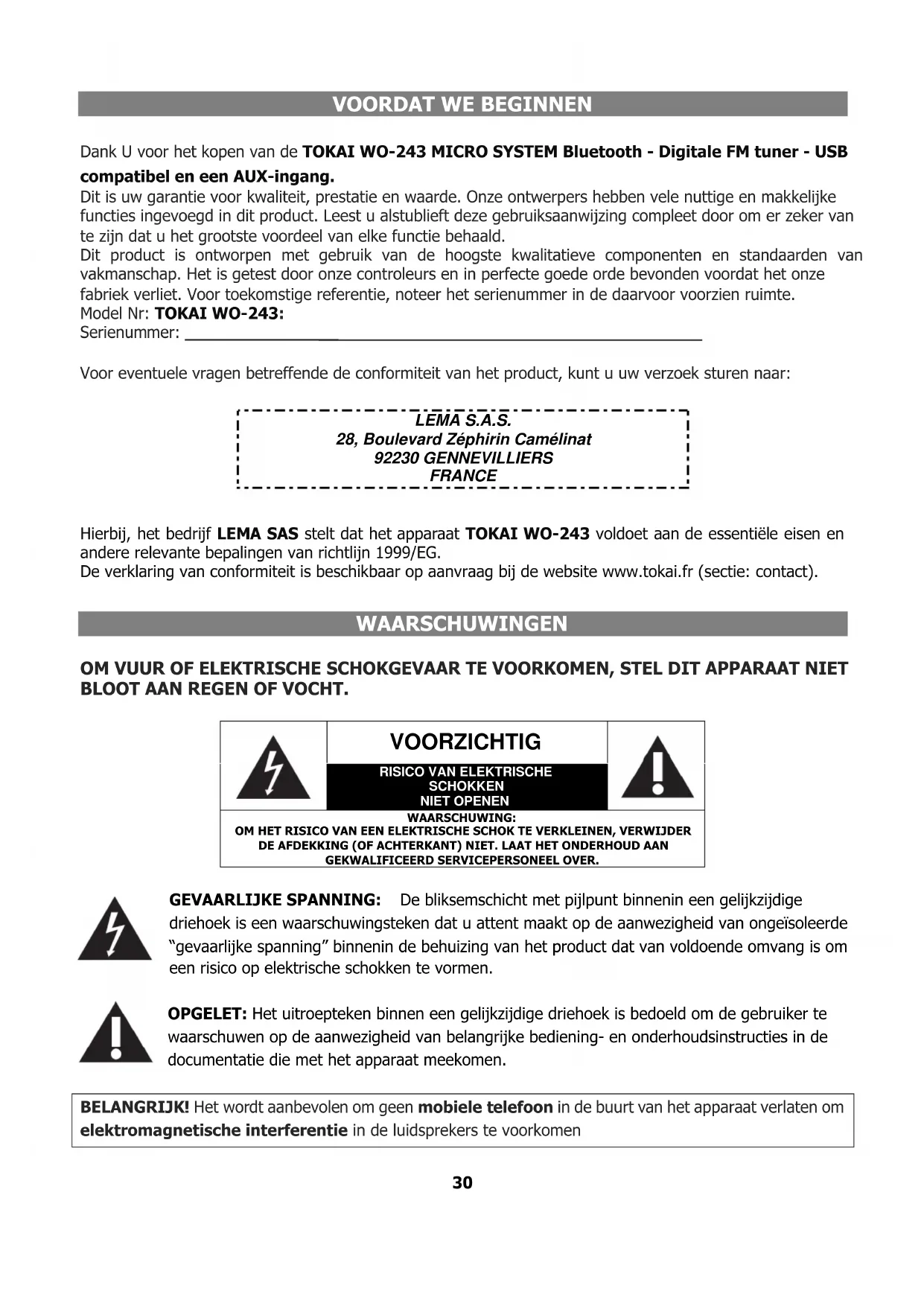 LEMA S.A.S. 28, Boulevard Zéphirin Camélinat 92230 GENNEVILLIERS FRANCE BELANGRIJK Hierbij, het bedrijf LEMA SAS stelt dat het apparaat TOKAI WO-243 voldoet aan de essentiële eisen en andere relevante bepalingen van richtlijn 1999/EG. De verklaring van conformiteit is beschikbaar op aanvraag bij de website www.tokai.fr (sectie: contact). E VEILIGHEIDSINSTRUCTIES WAARSCHUWINGEN OM VUUR OF ELEKTRISCHE SCHOKGEVAAR TE VOORKOMEN, STEL DIT APPARAAT NIET BLOOT AAN REGEN OF VOCHT.