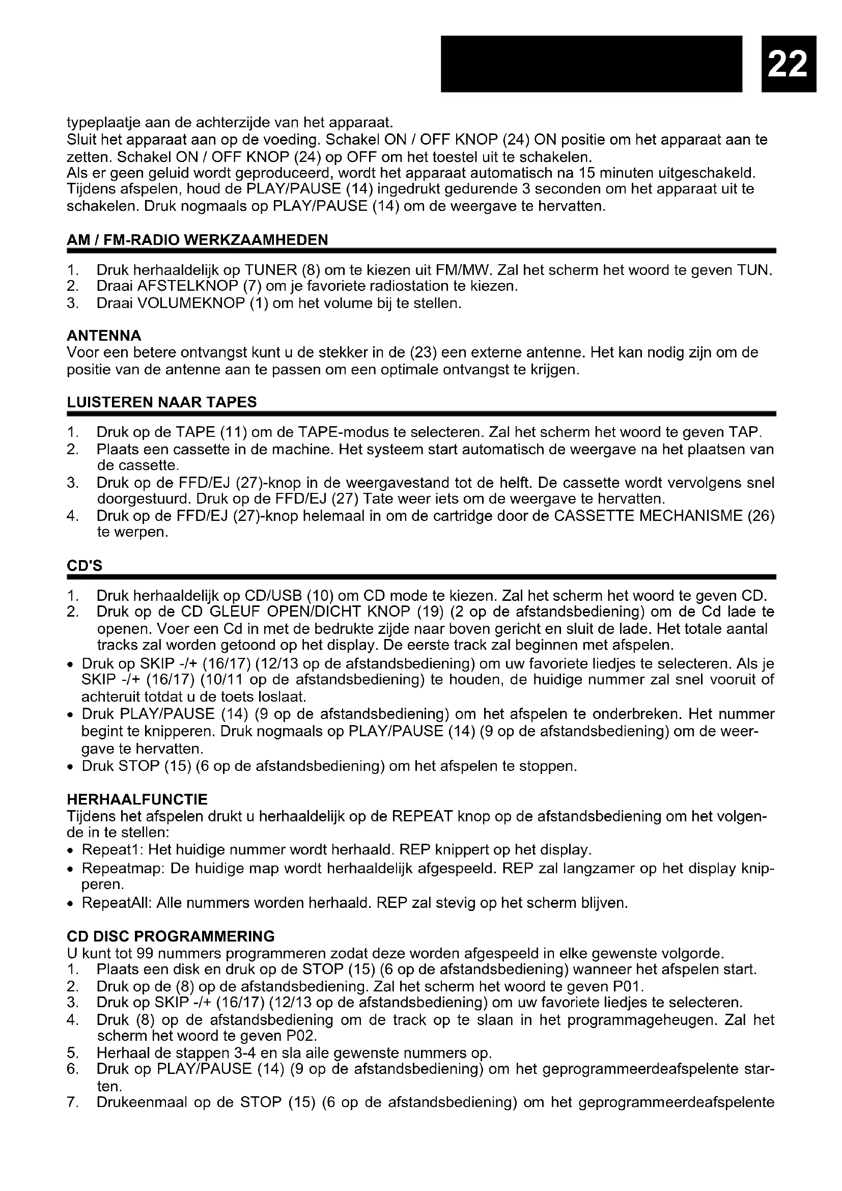 openen. Voer een Cd in met de bedrukte zijde naar boven gericht en sluit de lade. Het totale aantal tracks zal worden getoond op het display. De eerste track zal beginnen met afspelen. Druk op SKIP -/+ (16/17) (12/13 op de afstandsbediening) om uw favoriete liedjes te selecteren. Als je SKIP -/+ (16/17) (10/11 op de afstandsbediening) te houden, de huidige nummer zal snel vooruit of achteruit totdat u de toets loslaat. Druk PLAY/PAUSE (14) (9 op de afstandsbediening) om het afspelen te onderbreken. Het nummer begint te knipperen. Druk nogmaals op PLAY/PAUSE (14) (9 op de afstandsbediening) om de weer- gave te hervatten. Druk STOP (15) (6 op de afstandsbediening) om het afspelen te stoppen. HERHAALFUNCTIE Tijdens het afspelen drukt u herhaaldelijk op de REPEAT knop op de afstandsbediening om het volgen- de in te stellen: Repeat1: Het huidige nummer wordt herhaald. REP knippert op het display. Repeatmap: De huidige map wordt herhaaldelijk afgespeeld. REP zal langzamer op het display knip- peren. RepeatAll: Alle nummers worden herhaald. REP zal stevig op het scherm blijven.