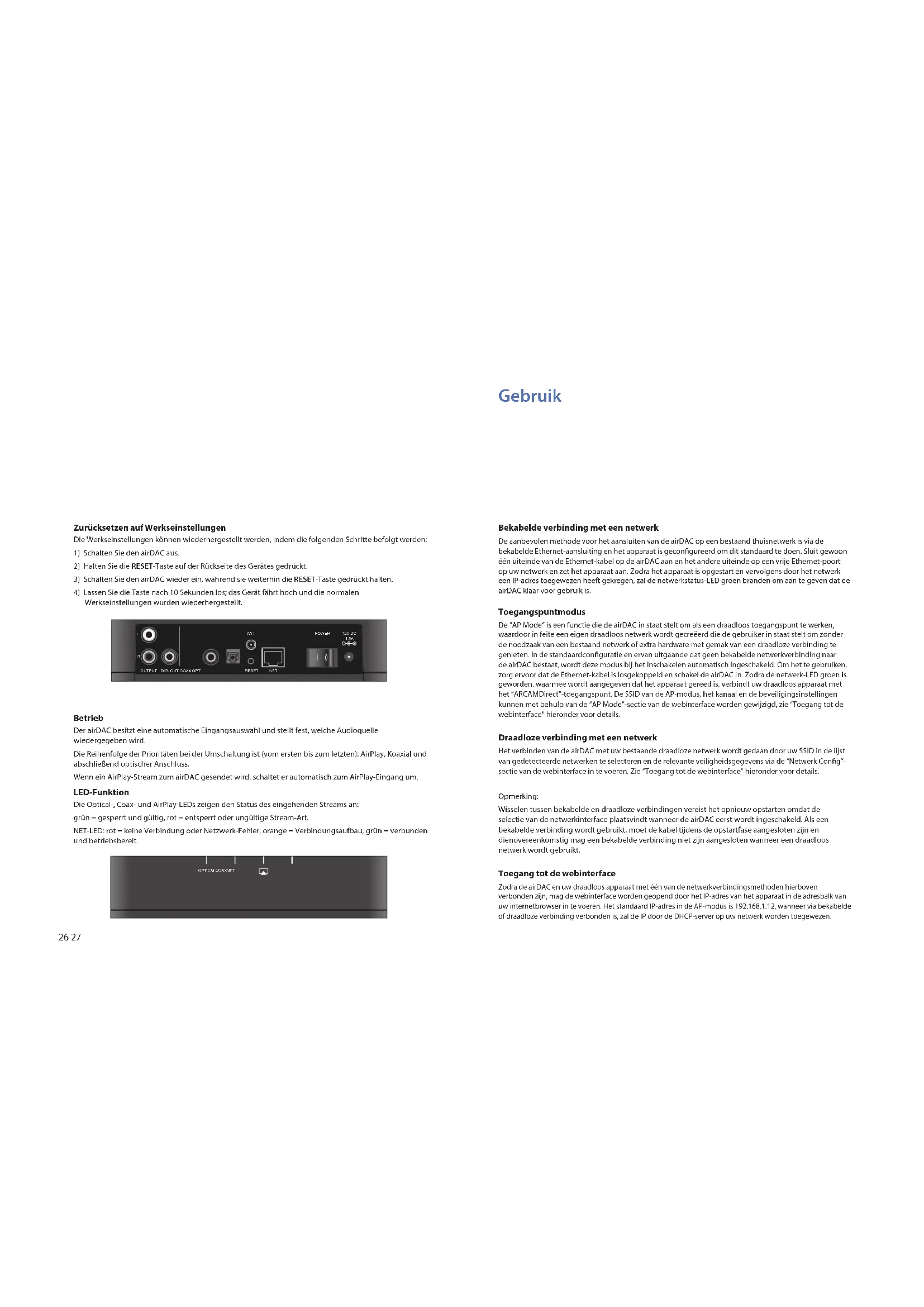 volledig hersteld. Gebruik De airDAC maakt van een automatische ingangselectie gebruik die afhankelijk is van de bron die wordt afgespeeld. De volgorde van prioriteit (vanaf de eerste naar de laatste) is AirPlay, Coaxiaal en als laatste Optisch. Wanneer een AirPlay-stream naar de airDAC wordt gestart zal het automatisch naar de AirPlay-ingang overschakelen. Functie van de LED De Optisch-, Coax- en AirPlay-LED geven de status van de inkomende stream aan: groen = vergrendeld en geldig, rood = ontgrendeld of ongeldig stream-type. NET-LED: rood = geen verbinding of netwerkfout, oranje = verbinding aan het maken, groen = verbonden en gereed. POWER