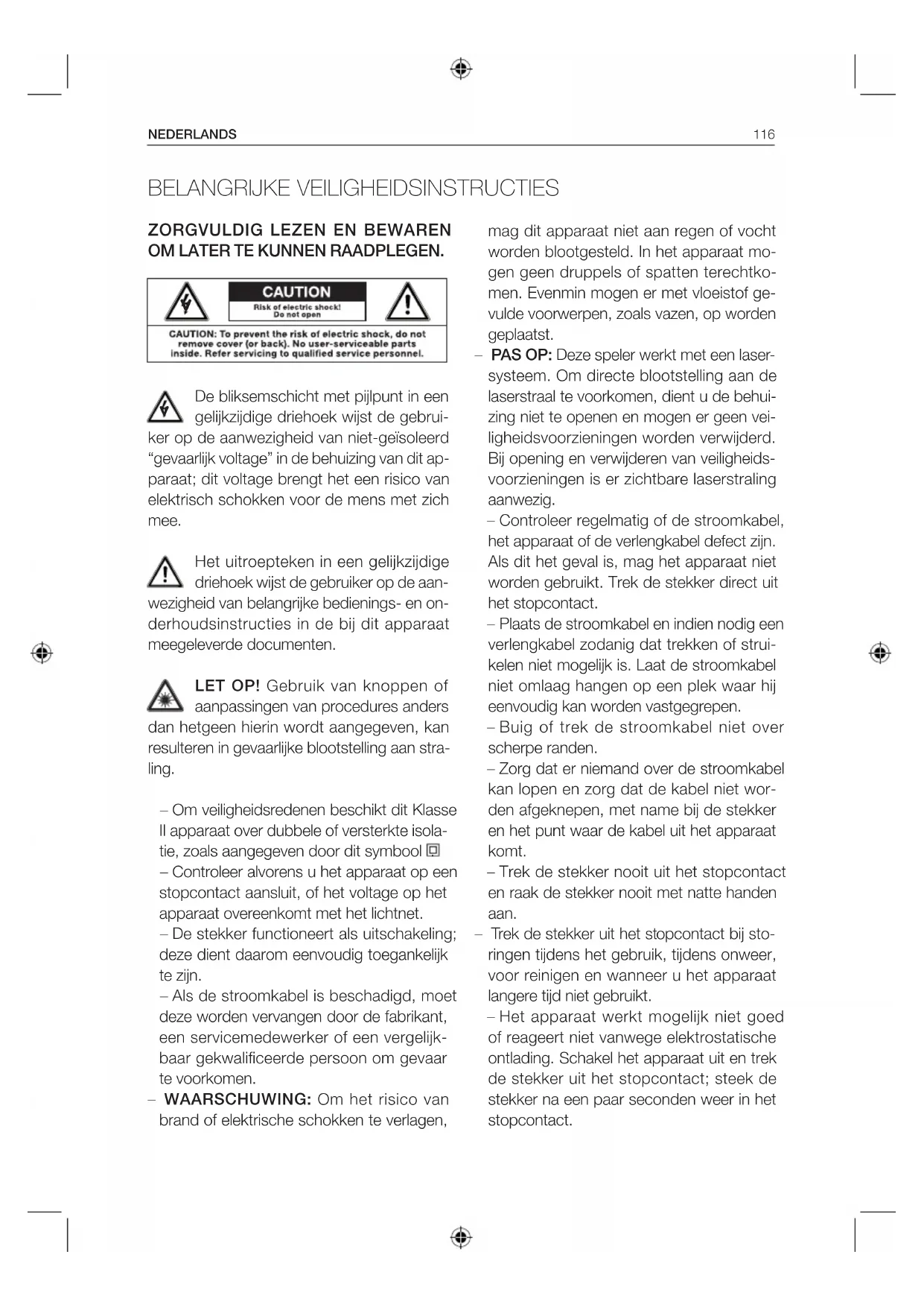 De bliksemschicht met pijlpunt in een gelijkzijdige driehoek wijst de gebrui- ker op de aanwezigheid van niet-geïsoleerd “gevaarlijk voltage” in de behuizing van dit ap- paraat; dit voltage brengt het een risico van elektrisch schokken voor de mens met zich mee. Het uitroepteken in een gelijkzijdige driehoek wijst de gebruiker op de aan- wezigheid van belangrijke bedienings- en on- derhoudsinstructies in de bij dit apparaat meegeleverde documenten. LET OP! Gebruik van knoppen of aanpassingen van procedures anders dan hetgeen hierin wordt aangegeven, kan resulteren in gevaarlijke blootstelling aan stra- ling. – Om veiligheidsredenen beschikt dit Klasse II apparaat over dubbele of versterkte isola- tie, zoals aangegeven door dit symbool . – Controleer alvorens u het apparaat op een stopcontact aansluit, of het voltage op het apparaat overeenkomt met het lichtnet. – De stekker functioneert als uitschakeling; deze dient daarom eenvoudig toegankelijk te zijn. – Als de stroomkabel is beschadigd, moet deze worden vervangen door de fabrikant, een servicemedewerker of een vergelijk- baar gekwalificeerde persoon om gevaar te voorkomen. – WAARSCHUWING: Om het risico van brand of elektrische schokken te verlagen,