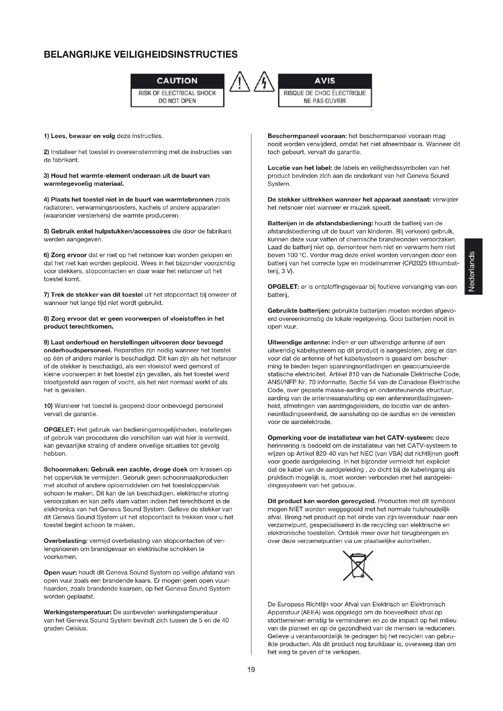 Per specifiche tecniche dettagliate riguardanti il presente prodotto, visitare il nostro sito web www.genevalab.com e selezionare la pagina “supporto”, dove e’ possibile scaricare le specifiche tecniche dettagliate relative a tutti i nostri prodotti. © 2009 G-Lab GmbH. Tutti i diritti riservati. In conformità con le leggi sul copyright, il presente manuale non può essere copiato, in tutto o in parte, senza l’autorizzazione scritta di G-Lab GmbH. Geneva™ e’ un marchio registrato di G-Lab GmbH. iPod e’ un marchio registrato di Apple Computer, Inc. Negli USA e negli altri paesi. Il marchio registrato EmbracingSound™ e il logo Embracing Sound Experi- ence sono detenuti da Embracing Sound Experience AB. Geneva Sound System Model S, Manuale dell’utente, Version v1.0 Fase 1 Fase 2 + 319 Nederlands BELANGRIJKE VEILIGHEIDSINSTRUCTIES Beschermpaneel vooraan: het beschermpaneel vooraan mag nooit worden verwijderd, omdat het niet afneembaar is. Wanneer dit toch gebeurt, vervalt de garantie. Locatie van het label: de labels en veiligheidssymbolen van het product bevinden zich aan de onderkant van het Geneva Sound System. De stekker uittrekken wanneer het apparaat aanstaat: verwijder het netsnoer niet wanneer er muziek speelt. Batterijen in de afstandsbediening: houdt de batterij van de afstandsbediening uit de buurt van kinderen. Bij verkeerd gebruik, kunnen deze vuur vatten of chemische brandwonden veroorzaken. Laad de batterij niet op, demonteer hem niet en verwarm hem niet boven 100 °C. Verder mag deze enkel worden vervangen door een batterij van het correcte type en modelnummer (CR2025 lithiumbat- terij, 3 V). OPGELET: er is ontploffingsgevaar bij foutieve vervanging van een batterij. Gebruikte batterijen: gebruikte batterijen moeten worden afgevo- erd overeenkomstig de lokale regelgeving. Gooi batterijen nooit in open vuur. Uitwendige antenne: indien er een uitwendige antenne of een uitwendig kabelsysteem op dit product is aangesloten, zorg er dan voor dat de antenne of het kabelsysteem is geaard om bescher- ming te bieden tegen spanningsontladingen en geaccumuleerde statische elektriciteit. Artikel 810 van de Nationale Elektrische Code, ANSI/NFP Nr. 70 informatie, Sectie 54 van de Canadese Elektrische Code, over gepaste massa-aarding en ondersteunende structuur, aarding van de antenneaansluiting op een antenneontladingseen- heid, afmetingen van aardingsgeleiders, de locatie van de anten- neontladingseenheid, de aansluiting op de aardlus en de vereisten voor de aardelektrode. Opmerking voor de installateur van het CATV-systeem: deze herinnering is bedoeld om de installateur van het CATV-systeem te wijzen op Artikel 820-40 van het NEC (van VSA) dat richtlijnen geeft voor goede aardgeleiding. In het bijzonder vermeldt het expliciet dat de kabel van de aardgeleiding , zo dicht bij de kabelingang als praktisch mogelijk is, moet worden verbonden met het aardgelei- dingssysteem van het gebouw. Dit product kan worden gerecycled. Producten met dit symbool mogen NIET worden weggegooid met het normale huishoudelijk afval. Breng het product op het einde van zijn levensduur naar een verzamelpunt, gespecialiseerd in de recycling van elektrische en elektronische toestellen. Ontdek meer over het terugbrengen en over deze verzamelpunten via uw plaatselijke autoriteiten. De Europese Richtlijn voor Afval van Elektrisch en Elektronisch Apparatuur (AEEA) was opgelegd om de hoeveelheid afval op stortterreinen ernstig te verminderen en zo de impact op het milieu van de planeet en op de gezondheid van de mensen te reduceren. Gelieve u verantwoordelijk te gedragen bij het recyclen van gebru- ikte producten. Als dit product nog bruikbaar is, overweeg dan om het weg te geven of te verkopen.