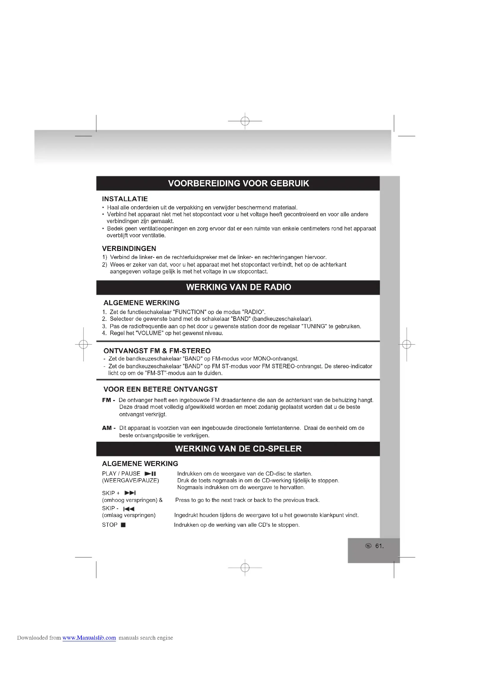 - Haal alle onderdelen uit de verpakking en verwijder beschermend materiaal.• Verbind het apparaat niet met het stopcontact voor u het voltage heeft gecontroleerd en voor alle andere verbindingen zijn gemaakt.• Bedek geen ventilatieopeningen en zorg ervoor dat er een ruimte van enkele centimeters rond het apparaat overblijft voor ventilatie.1) Verbind de linker- en de rechterluidspreker met de linker- en rechteringangen hiervoor.2) Wees er zeker van dat, voor u het apparaat met het stopcontact verbindt, het op de achterkant aangegeven voltage gelijk is met het voltage in uw stopcontact.Indrukken om de weergave van de CD-disc te starten. Downloaded from www.Manualslib.com manuals search engine62.