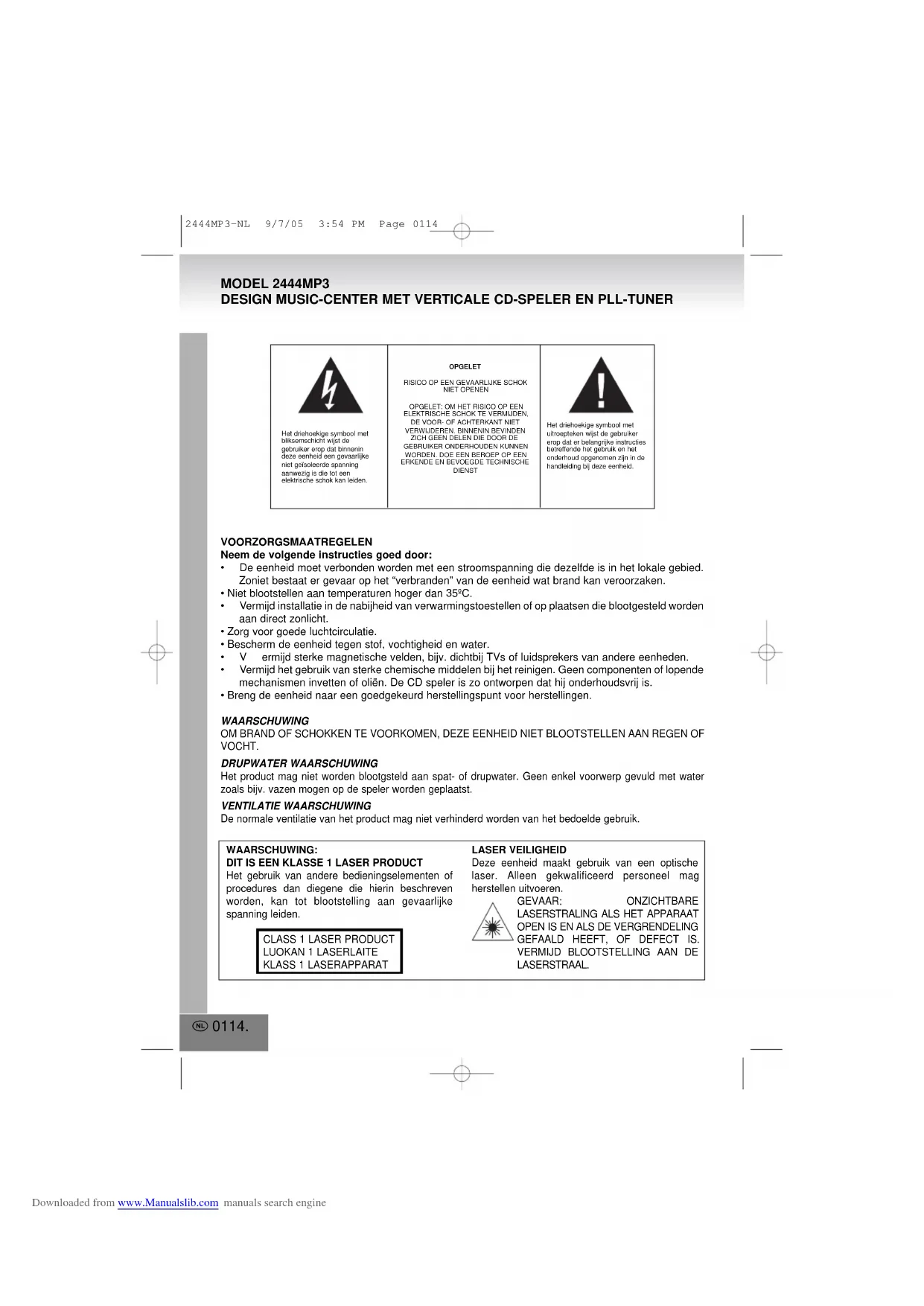 2444MP3 PL 9/7/05 4:19 PM Page 0113 Downloaded from www.Manualslib.com manuals search engineVOORZORGSMAATREGELENNeem de volgende instructies goed door: