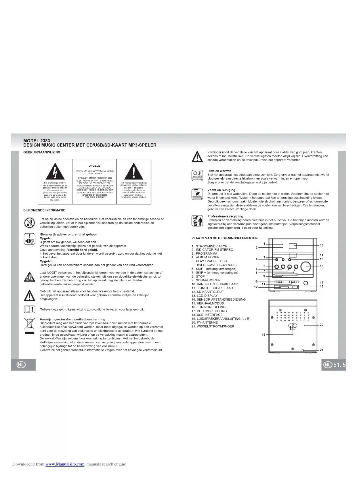 Het driehoekige symbool met bliksemschicht wijst de gebruiker erop dat binnenin deze eenheid een gevaarlijke niet geïsoleerde spanning aanwezig is die tot een elektrische schok kan leiden.Het driehoekige symbool met uitroepteken wijst de gebruiker erop dat er belangrijke instructies betreffende het gebruik en het onderhoud opgenomen zijn in de handleiding bij deze eenheid.OPGELETRISICO OP EEN GEVAARLIJKE SCHOKNIET OPENEN OPGELET: OM HET RISICO OP EEN ELEKTRISCHE SCHOK TE VERMIJDEN, DE VOOR- OF ACHTERKANT NIET VERWIJDEREN. BINNENIN BEVINDEN ZICH GEEN DELEN DIE DOOR DE GEBRUIKER ONDERHOUDEN KUNNEN WORDEN. DOE EEN BEROEP OP EEN ERKENDE EN BEVOEGDE TECHNISCHE DIENST MODEL 2383 DESIGN MUSIC CENTER MET CD/USB/SD-KAART MP3-SPELER Verhinder nooit de ventilatie van het apparaat door middel van gordijnen, kranten, dekens of meubelstukken. De ventilatiegaten moeten altijd vrij zijn. Oververhitting kan schade veroorzaken en de levensduur van het apparaat verkorten.Gebruik het apparaat alleen voor het doel waarvoor het is bestemd.Het apparaat is uitsluitend bedoeld voor gebruik in huishoudelijke en zakelijke omgevingen.Gelieve deze gebruiksaanwijzing zorgvuldig te bewaren voor later gebruik.Aanwijzingen inzake de milieubeschermingDit product mag aan het einde van zijn levensduur niet samen met het normale huishoudelijke afval verwijderd worden, maar moet afgegeven worden op een verzamel-punt voor de recycling van elektrische en elektronische apparatuur. Het symbool op het product, in de gebruiksaanwijzing of op de verpakking maakt u daarop attent.De werkstoffen zijn volgens hun kenmerking herbruikbaar. Met het hergebruik, de stoffelijke verwerking of andere vormen van recycling van oude apparaten levert ueen belangrijke bijdrage tot de bescherming van ons milieu.Gelieve bij het gemeentebestuur informatie te vragen over het bevoegde verzamelpunt.Laat NOOIT personen, in het bijzonder kinderen, voorwerpen in de gaten, schachten of andere openingen van de behuizing steken; dit kan een dodelijke elektrische schok tot gevolg hebben. De behuizing van het apparaat mag slechts door daartoe gekwalificeerde vaklui geopend worden.Hitte en warmteStel het apparaat niet bloot aan direct zonlicht. Zorg ervoor dat het apparaat niet wordt blootgesteld aan directe hittebronnen zoals verwarmingen en open vuur.Zorg ervoor dat de ventilatiegaten niet zijn bedekt.Vocht en reinigingDit product is niet waterdicht! Doop de speler niet in water. Voorkom dat de speler met water in contact komt. Water in het apparaat kan tot ernstige beschadiging leiden. Gebruik geen schoonmaakmiddelen die alcohol, ammoniak, benzeen of schuurmiddel bevatten aangezien deze middelen de speler kunnen beschadigen. Om te reinigen, gebruik een zachte, vochtige doek.Let op bij kleine onderdelen en batterijen, niet doorslikken, dit kan tot ernstige schade of verstikking leiden. Let er in het bijzonder bij kinderen op dat kleine onderdelen en batterijen buiten hun bereik zijn.IBelangrijk advies omtrent het gehoorOpgelet:U geeft om uw gehoor, wij doen dat ook.Wees daarom voorzichtig tijdens het gebruik van dit apparaat.Onze aanbeveling: Vermijd hard geluid.In het geval het apparaat door kinderen wordt gebruikt, zorg ervoor dat het volume niet te hard staat.Opgelet!Hard geluid kan onherstelbare schade aan het gehoor van een kind veroorzaken.Professionele recyclingBatterijen en verpakking horen niet thuis in het huisafval. De batterijen moeten worden ingeleverd bij een verzamelpunt voor gebruikte batterijen. Verpakkingsmateriaal gescheiden deponeren is goed voor het milieu.GEBRUIKSAANWIJZINGBIJKOMENDE INFORMATIEPLAATS VAN DE BEDIENINGSELEMENTEN1. STROOMINDICATOR2. INDICATOR FM-STEREO3. PROGRAMMA4. ALBUM HOGER 5. PLAY / PAUSE / USB(WEERGAVE/PAUZE/USB)6. SKIP - (omlaag verspringen)7. SKIP + (omhoog verspringen)8. STOP9. SCHAALWIJZER10. BANDKEUZESCHAKELAAR11. FUNCTIESCHAKELAAR12. SD-KAARTGLEUF13. LCD-DISPLAY14. SENSOR AFSTANDSBEDIENING15. HERHAALMODUS16. TUNINGREGELING17. VOLUMEREGELING18. USB-INTERFACE19. LUIDSPREKERAANSLUITING (L / R)20. FM-ANTENNE21. WISSELSTROOMSNOER Downloaded from www.Manualslib.com manuals search engine53. 52.