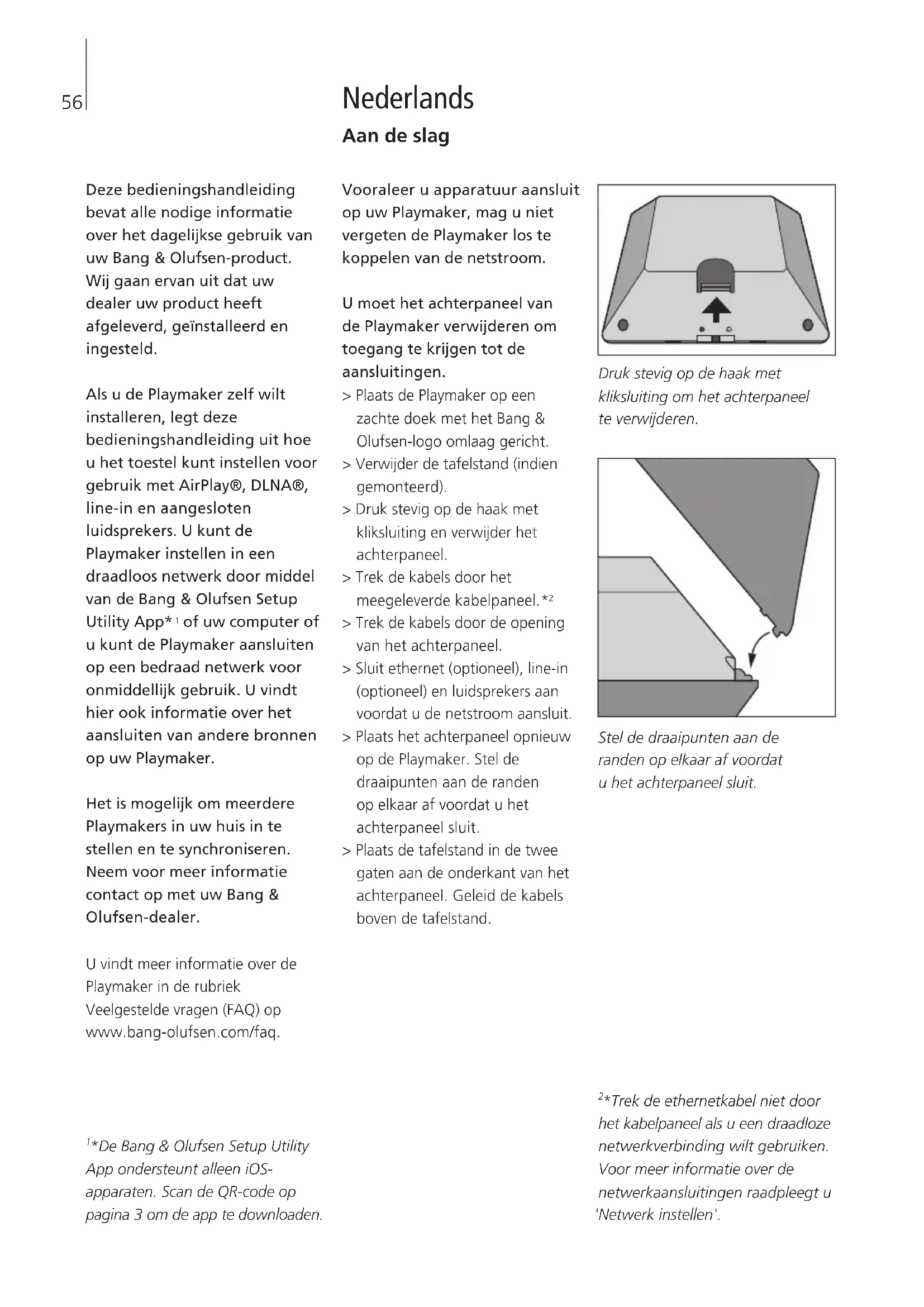 *Voor een overzicht van de knoppen, zie ‘Uw Playmaker bedienen’. Uw Playmaker moet verbonden zn met een netwerk via ofwel een bedrade of een draadloze verbinding. Om de setup uit te voeren, moet de Playmaker verbonden zn met de netstroom en ingeschakeld zn. Kies tussen de volgende instelprocedures: – Bang& Olufsen Setup Utility App voor iOS-apparaten*