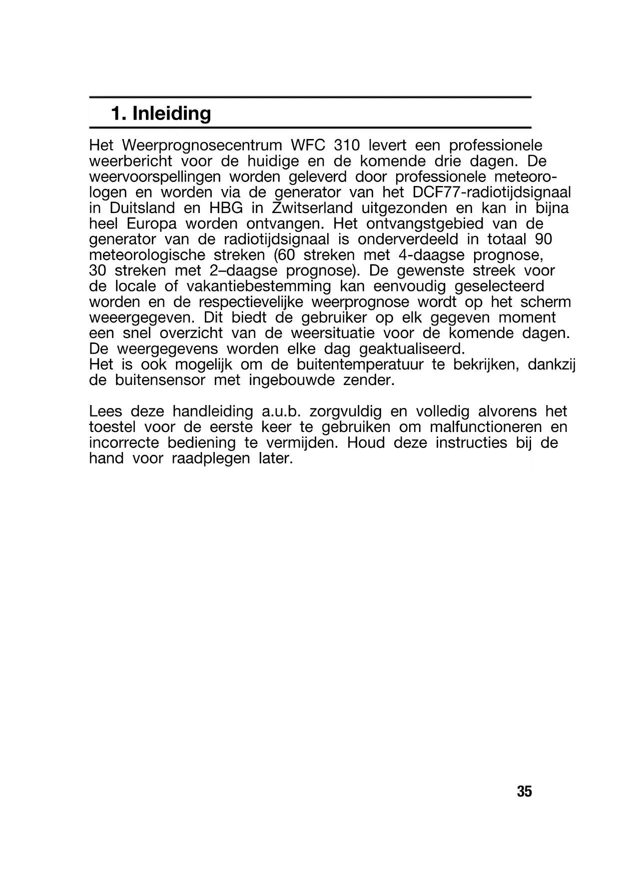 Het Weerprognosecentrum WFC 310 levert een professionele weerbericht voor de huidige en de komende drie dagen. De weervoorspellingen worden geleverd door professionele meteoro- logen en worden via de generator van het DCF77-radiotijdsignaal in Duitsland en HBG in Zwitserland uitgezonden en kan in bijna heel Europa worden ontvangen. Het ontvangstgebied van de generator van de radiotijdsignaal is onderverdeeld in totaal 90 meteorologische streken (60 streken met 4-daagse prognose, 30 streken met 2–daagse prognose). De gewenste streek voor de locale of vakantiebestemming kan eenvoudig geselecteerd worden en de respectievelijke weerprognose wordt op het scherm weeergegeven. Dit biedt de gebruiker op elk gegeven moment een snel overzicht van de weersituatie voor de komende dagen. De weergegevens worden elke dag geaktualiseerd. Het is ook mogelijk om de buitentemperatuur te bekrijken, dankzij de buitensensor met ingebouwde zender. Lees deze handleiding a.u.b. zorgvuldig en volledig alvorens het toestel voor de eerste keer te gebruiken om malfunctioneren en incorrecte bediening te vermijden. Houd deze instructies bij de hand voor raadplegen later.