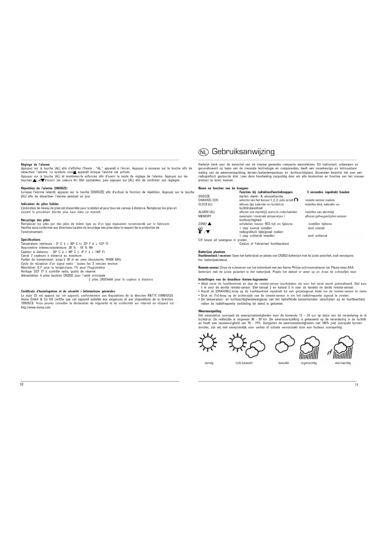Teneinde de luchtdrukmeting te bekijken drukt u bij herhaling op Ω totdat de luchtdrukwaarde in het venster verschijnt. Teneinde wijzigen aan de luchtdrukeenheid uit te voeren houdt u de Ω ingedrukt om naar de instelmodus te gaan. Druk bij herhaling op Ω om de klok- en kalenderinstellingen over te slaan totdat de luchtdrukeenheid knippert. Druk op of voor de instelling. Druk Ω in om te bevestigen en terug te keren. 12/24 uurformaat > Uur > Min > Jaar > D/M of M/D formaat > Maand > Datum > Luchtdrukeenheid > EXIT Radiogestuurde klok De eenheid begint met de synchronisatie van de tijd, nadat de batterijen geplaatst zijn of na een reset. Teneinde direct een radiogestuurd tijdsignaal te zoeken drukt u [ / ] in totdat het symbool verschijnt. Als het symbool naderhand verdwijnt, is het signaal voor de radiotijd momenteel niet beschikbaar. Probeer andere locaties op een later tijdstip. Plaats de eenheid niet in de buurt van mogelijke interferentiebronnen zoals mobiele telefoons, overige apparatuur, een televisietoestel, enz. Indien de ontvangst van de radiogestuurde tijdgegevens in orde is zal het antenne-pictogram met een zgn. vol-signaalontvangst pictogram op het scherm verschijnen. De radiogestuurde klok wordt dagelijks om circa 02:03 en 03:03 gesynchroniseerd. Elke ontvangstcyclus duurt minimaal 2,5 en maximaal 10 minuten. Kamer-/buitentemperatuur en luchtvochtigheid Druk op de [C/F]-knop om een weergave in graden Celsius of Fahrenheit te selecteren. Druk bij herhaling op de [CH] -knop om kanaal 1, kanaal 2, kanaal 3 en auto-kanaal scrolling weergave-modi te selecteren. Maximaal/minimaal geheugen Druk bij herhaling op de [MEM]-knop om de maximale en minimale waarden van de temperatuur en luchtvochtigheid te bekijken. Teneinde het geheugen te wissen houdt u de [MEM]-knop ingedrukt terwijl de betreffende waarden op het display worden weergegeven. Tijd en kalender Druk bij herhaling op de Ω-knop om tussen tijd, kalender, dag van de week en het aflezen van de luchtdruk te wisselen. Houdt de Ω-knop ingedrukt om naar de instellingenmodus voor de tijd te gaan. Gebruik of voor de aanpassing en de Ω-knop ter bevestiging. De volgende waarden kunnen achtereenvolgens ingesteld worden: 12/24 uurformaat > Uur > Min > Jaar > D/M of M/D formaat > Maand > Datum > Luchtdrukeenheid > EXIT Locale tijd, wereld (ZONE) tijd Houdt de [ZONE]-knop ingedrukt om naar de instellingenmodus voor de wereldtijd(-zone) te gaan. Druk op of om de gewenste uurwaarde van -12 tot +12 in te voeren. Druk Ω in om te bevestigen en terug te keren. Druk bij herhaling op de [ZONE]-knop om tussen de locale (radiogestuurde) tijd en de wereldtijdzone te wisselen. Het “ZONE”-pictogram verschijnt indien de wereldtijdzone is geselecteerd. Indien de wereldtijdzone niet wordt gebruikt, laat dan de wereldtijdzone op “0”. Instelling van het alarm Druk op de [AL]-knop om de alarmtijd te bekijken en het “AL”-symbool verschijnt. Druk bij herhaling op de “ALARM” – knop om het alarm in of uit te schakelen. Het belsymbool verschijnt zodra het alarm is geactiveerd. Houdt de [AL]-knop ingedrukt om naar de instellingenmodus voor het alarm te gaan. Druk of in om de gewenste waarden voor uur/min. in te voeren. Druk op [AL] om de instelling te bevestigen. Snooze Druk als het alarm gaat op de knop [SNOOZE] om het snooze-alarm te activeren. Druk op de [AL]-knop om het alarm voor één dag uit te zetten. Indicatie voor bijna lege batterijen De indicatie voor bijna lege batterijen is beschikbaar voor de hoofdeenheid zelf en voor de drie remote-kanalen. Vervang de batterijen en volg de procedure voor het (opnieuw) instellen zoals beschreven in deze handleiding. Afvoer van de batterijen Vervang de batterijen alleen door hetzelfde of een gelijkwaardig type dat aanbevolen wordt door de fabrikant. Zorg er voor dat oude en defecte batterijen op een milieuvriendelijke wijze en in overeenkomst met de geldende voorschriften worden afgevoerd. Specificaties Kamertemperatuur: 0°C tot + 50°C (+32°F tot +122°F) Luchtvochtigheid binnen/buiten: 20% - 99% RH (relative huminity) Remote-sensor: -20°C tot +60°C (-4°F tot +140°F) Kanaal: max. drie remote-sensoren Overdracht: tot max. 30 meter in open terrein bij een radiofrequentie van 434 MHz RF ontvangstcyclus: circa iedere drie minuten Resolutie: 0,1 graad Celcius voor temperatuur, 1% voor luchtvochtigheid Klok: DCF77 radiogestuurd, quartz back-up Voeding: CR2032 x 4 stuks voor de hoofdeenheid 2 stuks AAA-fomaat batterijen voor de remote-sensor Toelatings- en veiligheidsbewijzen / algemene informatie Dit toestel heeft de CE-markering conform de bepalingen van de richtlijn R&TTE (1999/5/EG). Hama GmbH & Co. KG verklaart hierbij dat dit toestel voldoet aan de fundamentele vereisten en de overige relevante regelingen en voorschriften van de richtlijn 1999/5/EG. De conformiteitsverklaring en de verklaring van overeenstemming vindt u op internet onder http://www.hama.com.14