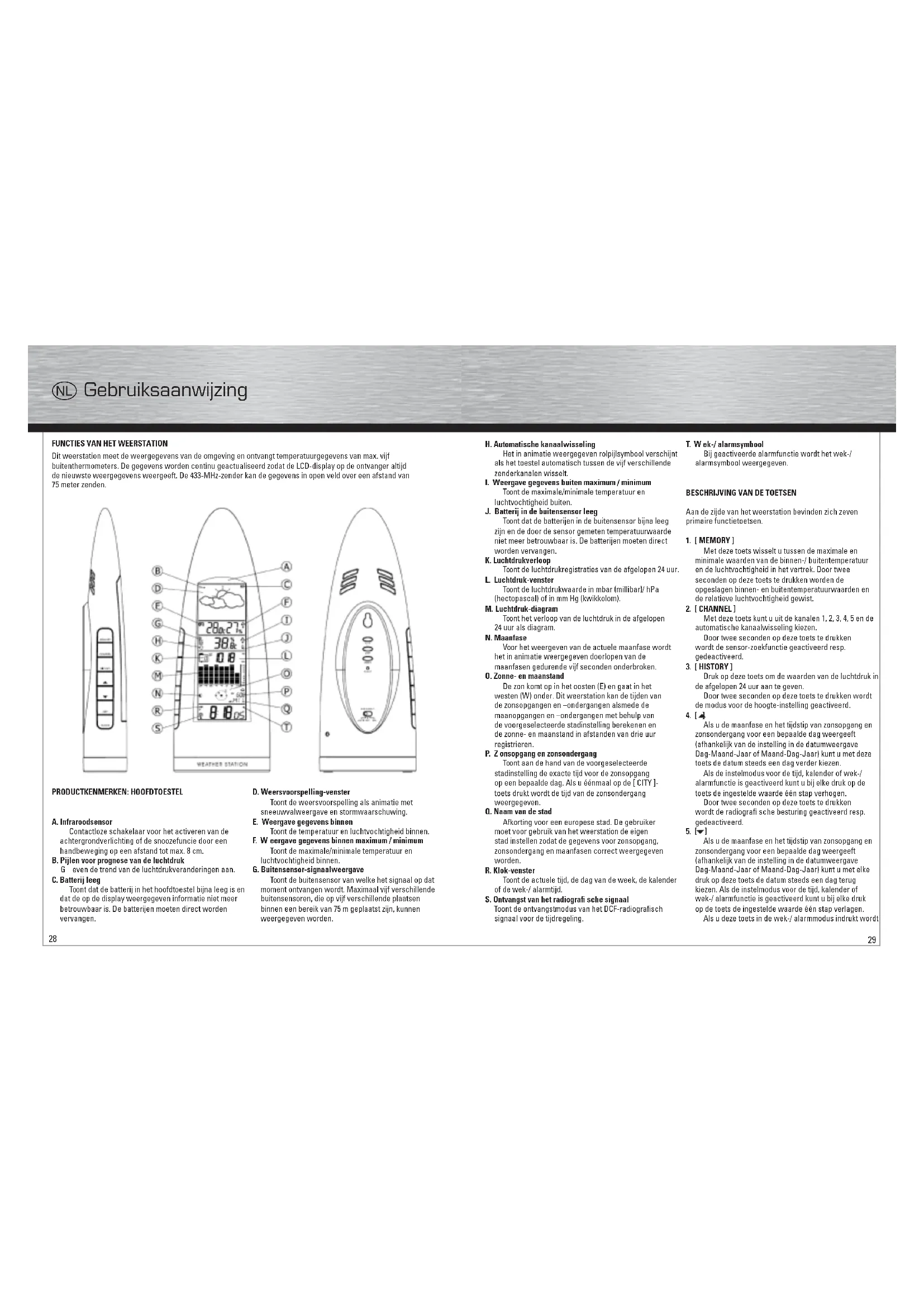 Operating Instruction PRODUCTKENMERKEN: HOOFDTOESTEL A. Infraroodsensor Contactloze schakelaar voor het activeren van de achtergrondverlichting of de snoozefuncie door een handbeweging op een afstand tot max. 8 cm. B. Pijlen voor prognose van de luchtdruk Geven de trend van de luchtdrukveranderingen aan. C. Batterij leeg Toont dat de batterij in het hoofdtoestel bijna leeg is en dat de op de display weergegeven informatie niet meer betrouwbaar is. De batterijen moeten direct worden vervangen. D. Weersvoorspelling-venster Toont de weersvoorspelling als animatie met sneeuwvalweergave en stormwaarschuwing. E. Weergave gegevens binnen Toont de temperatuur en luchtvochtigheid binnen. F. Weergave gegevens binnen maximum / minimum Toont de maximale/minimale temperatuur en luchtvochtigheid binnen. G. Buitensensor-signaalweergave Toont de buitensensor van welke het signaal op dat moment ontvangen wordt. Maximaal vijf verschillende buitensensoren, die op vijf verschillende plaatsen binnen een bereik van 75 m geplaatst zijn, kunnen weergegeven worden.
