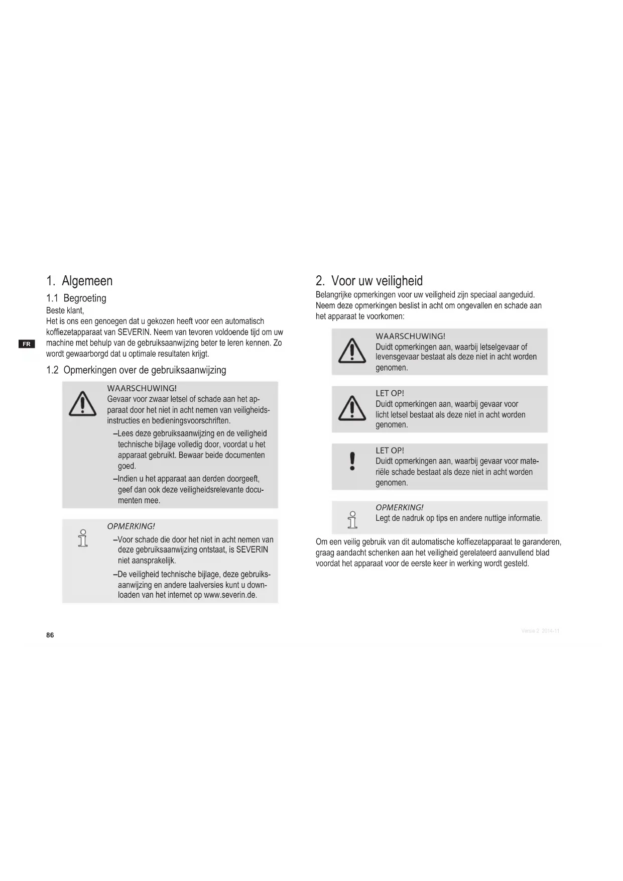 Belangrijke opmerkingen voor uw veiligheid zijn speciaal aangeduid. Neem deze opmerkingen beslist in acht om ongevallen en schade aan het apparaat te voorkomen: WAARSCHUWING! Duidt opmerkingen aan, waarbij letselgevaar of levensgevaar bestaat als deze niet in acht worden genomen. LET OP! Duidt opmerkingen aan, waarbij gevaar voor licht letsel bestaat als deze niet in acht worden genomen. LET OP! Duidt opmerkingen aan, waarbij gevaar voor mate- riële schade bestaat als deze niet in acht worden genomen. OPMERKING! Legt de nadruk op tips en andere nuttige informatie. Om een veilig gebruik van dit automatische kofezetapparaat te garanderen, graag aandacht schenken aan het veiligheid gerelateerd aanvullend blad voordat het apparaat voor de eerste keer in werking wordt gesteld.87 Versie 2 2014-11