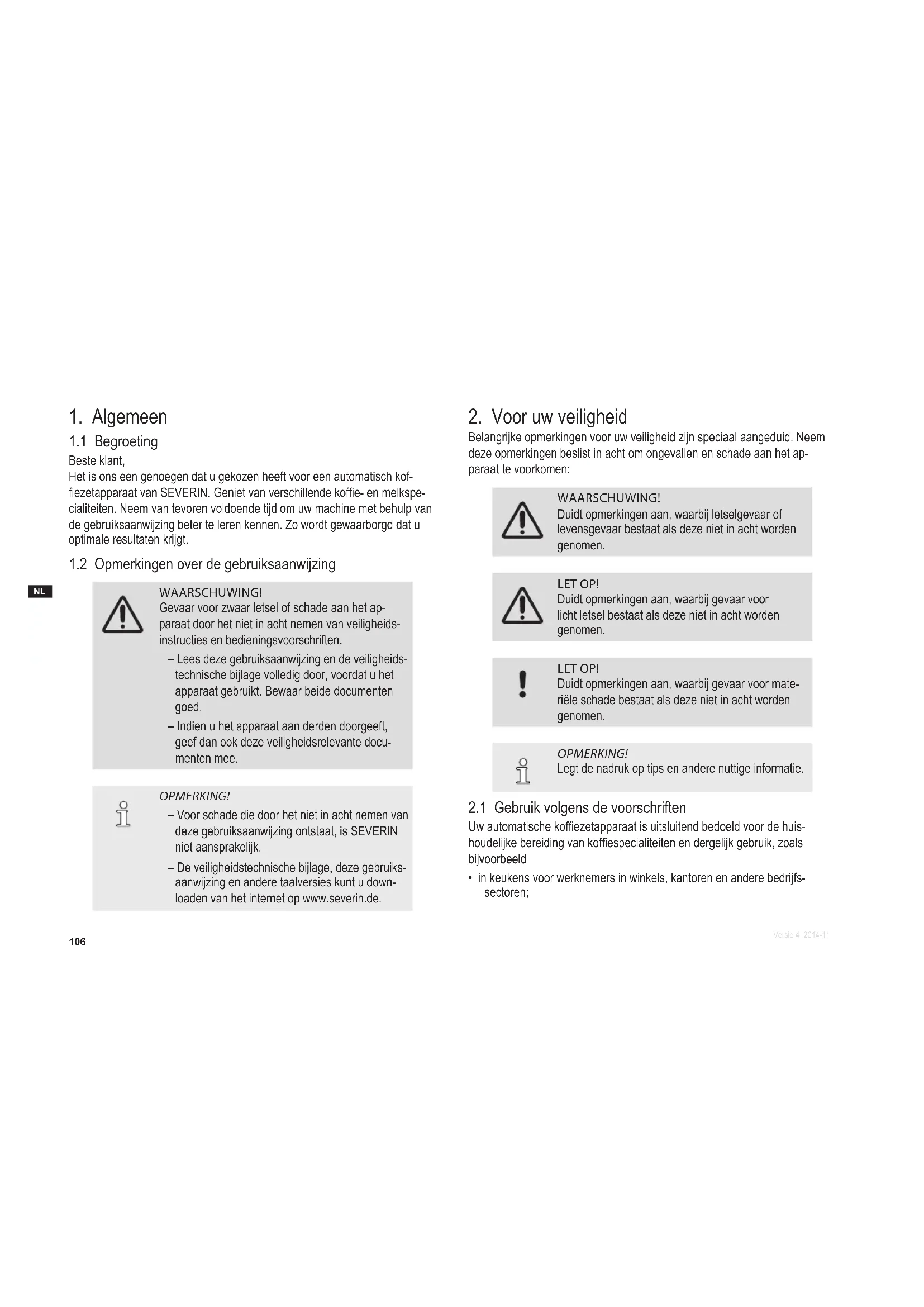 Beste klant, Het is ons een genoegen dat u gekozen heeft voor een automatisch kof- ezetapparaat van SEVERIN. Geniet van verschillende kofe- en melkspe- cialiteiten. Neem van tevoren voldoende tijd om uw machine met behulp van de gebruiksaanwijzing beter te leren kennen. Zo wordt gewaarborgd dat u optimale resultaten krijgt.