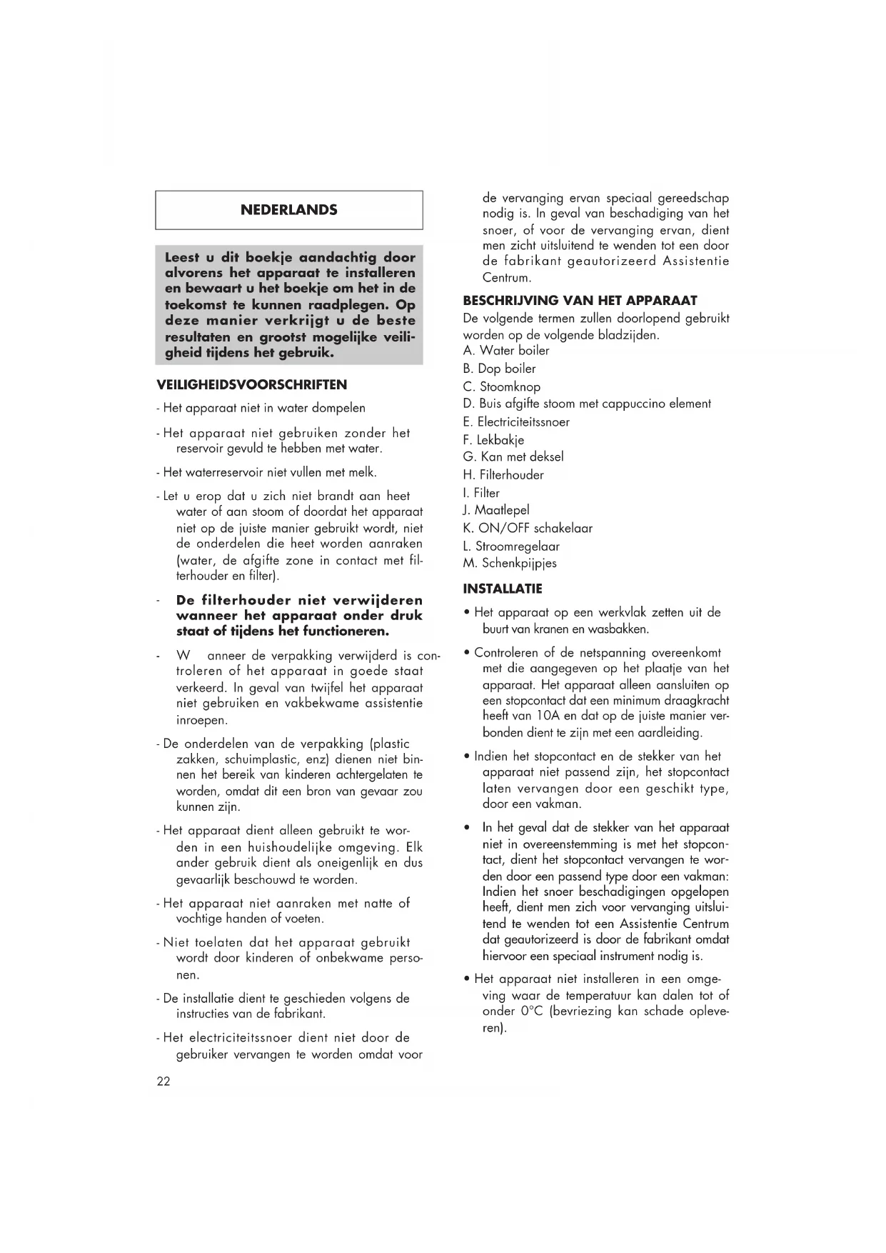 Per fare 2 espresso 2 cappuccini 4 espresso 4 cappuccini Quantità d’acqua nella caraffa Quantità di caffé nel filtro Quantità di latte nella caraffa Il livello dell’acqua deve coincidere con la linea del simbolo vapore impresso nella caraffa Il livello dell’acqua deve coincidere con il limite inferiore della fascetta metallica Utilizzare max 1 caraffa riempite fino alla linea 4 Utilizzare max 2 caraffe riempite fino alla linea 422 Leest u dit boekje aandachtig door alvorens het apparaat te installeren en bewaart u het boekje om het in de toekomst te kunnen raadplegen. Op deze manier verkrijgt u de beste resultaten en grootst mogelijke veili- gheid tijdens het gebruik. VEILIGHEIDSVOORSCHRIFTEN - Het apparaat niet in water dompelen - Het apparaat niet gebruiken zonder het reservoir gevuld te hebben met water. - Het waterreservoir niet vullen met melk. - Let u erop dat u zich niet brandt aan heet water of aan stoom of doordat het apparaat niet op de juiste manier gebruikt wordt, niet de onderdelen die heet worden aanraken (water, de afgifte zone in contact met fil- terhouder en filter).