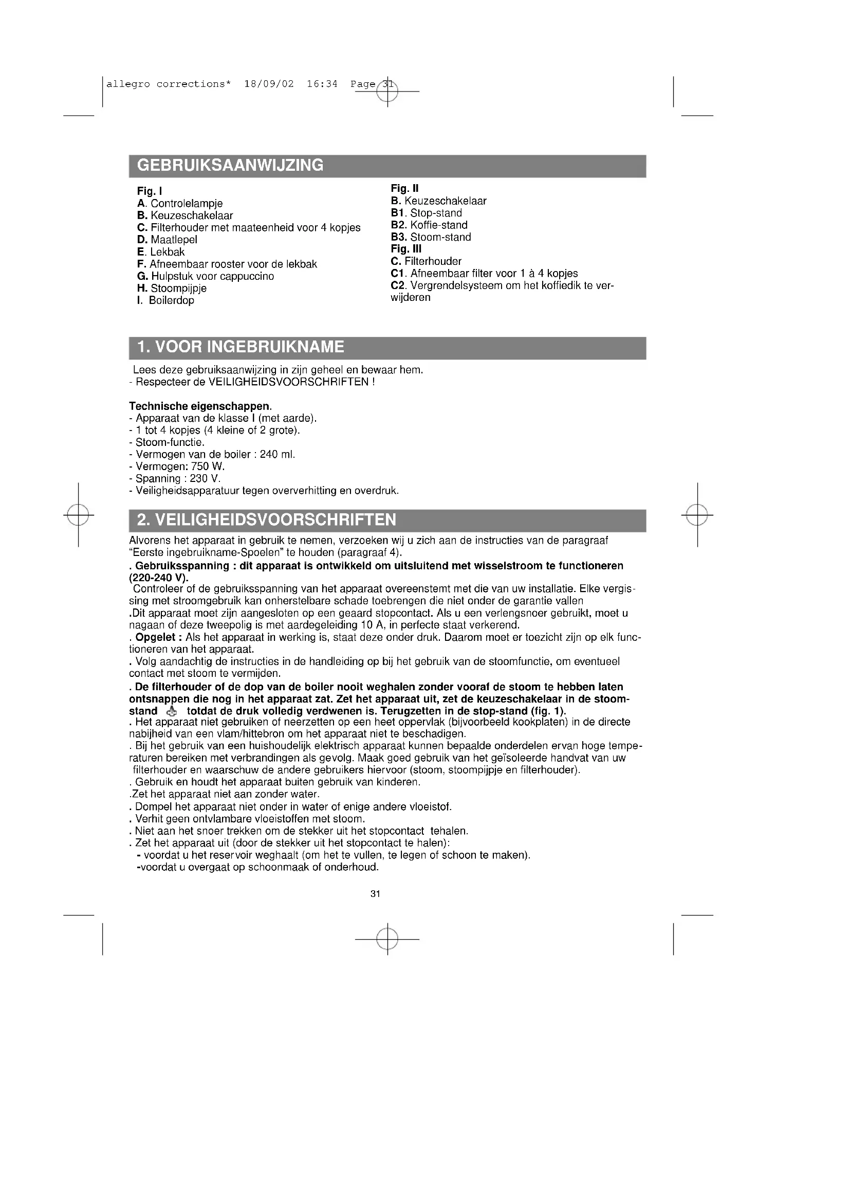 Alvorens het apparaat in gebruik te nemen, verzoeken wij u zich aan de instructies van de paragraaf “Eerste ingebruikname-Spoelen” te houden (paragraaf 4). . Gebruiksspanning : dit apparaat is ontwikkeld om uitsluitend met wisselstroom te functioneren (220-240 V). Controleer of de gebruiksspanning van het apparaat overeenstemt met die van uw installatie. Elke vergis- sing met stroomgebruik kan onherstelbare schade toebrengen die niet onder de garantie vallen .Dit apparaat moet zijn aangesloten op een geaard stopcontact. Als u een verlengsnoer gebruikt, moet u nagaan of deze tweepolig is met aardegeleiding 10 A, in perfecte staat verkerend. . Opgelet : Als het apparaat in werking is, staat deze onder druk. Daarom moet er toezicht zijn op elk func- tioneren van het apparaat. . Volg aandachtig de instructies in de handleiding op bij het gebruik van de stoomfunctie, om eventueel contact met stoom te vermijden. . De filterhouder of de dop van de boiler nooit weghalen zonder vooraf de stoom te hebben laten ontsnappen die nog in het apparaat zat. Zet het apparaat uit, zet de keuzeschakelaar in de stoom- stand totdat de druk volledig verdwenen is. Terugzetten in de stop-stand (fig. 1). . Het apparaat niet gebruiken of neerzetten op een heet oppervlak (bijvoorbeeld kookplaten) in de directe nabijheid van een vlam/hittebron om het apparaat niet te beschadigen. . Bij het gebruik van een huishoudelijk elektrisch apparaat kunnen bepaalde onderdelen ervan hoge tempe- raturen bereiken met verbrandingen als gevolg. Maak goed gebruik van het geïsoleerde handvat van uw filterhouder en waarschuw de andere gebruikers hiervoor (stoom, stoompijpje en filterhouder). . Gebruik en houdt het apparaat buiten gebruik van kinderen. .Zet het apparaat niet aan zonder water. . Dompel het apparaat niet onder in water of enige andere vloeistof. . Verhit geen ontvlambare vloeistoffen met stoom. . Niet aan het snoer trekken om de stekker uit het stopcontact tehalen. . Zet het apparaat uit (door de stekker uit het stopcontact te halen): - voordat u het reservoir weghaalt (om het te vullen, te legen of schoon te maken). -voordat u overgaat op schoonmaak of onderhoud. allegro corrections* 18/09/02 16:34 Page 3132 - na gebruik. - in geval van onregelmatigheid in het functioneren. . Een huishoudelijk elektrisch apparaat mag niet gebruikt worden als : - het snoer of het apparaat kennelijk beschadigd is. - het apparaat gevallen is of duidelijk een lek vertoont; onzichtbare schade zou de veiligheid kunnen aantasten. - Als de voedingskabel (het snoer) beschadigd is, moet deze vervangen worden door de fabrikant, de dichtst bijzijnde servicedienst of een persoon met vergelijkbare kwalificatie, om gevaar te vermijden. - Dit apparaat kan alleen gerepareerd worden met behulp van speciaal gereedschap. Bij beschadiging van het elektriciteitssnoer of voor enig ander probleem, gelieve contact op te nemen met uw gebruikelijke leve- rancier of met een erkend serviceadres (zie bijgevoegde lijst).
