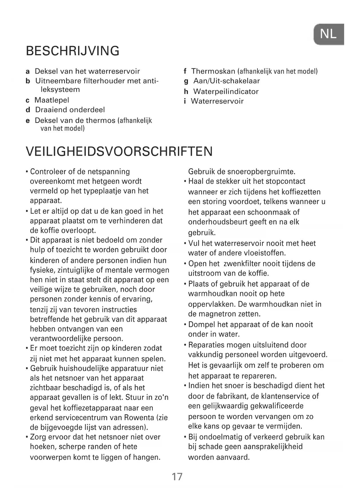 - Gebruik huishoudelijke apparatuur niet als het netsnoer van het apparaat zichtbaar beschadigd is, of als het apparaat gevallen is of lekt. Stuur in zo'n geval het koffiezetapparaat naar een erkend servicecentrum van Rowenta (zie de bijgevoegde lijst van adressen).
