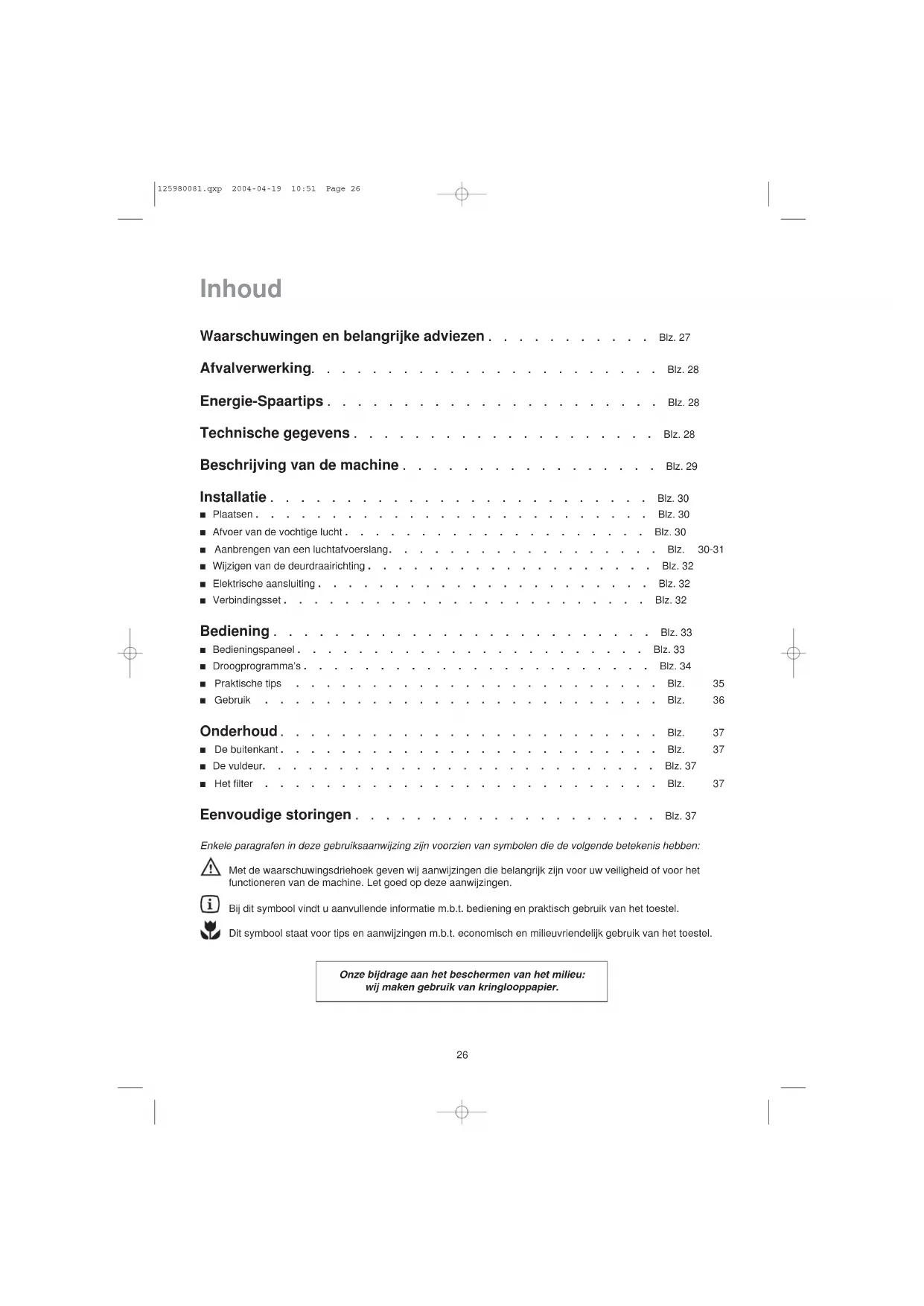 le local où le sèche-linge est installé a-t-il une aération suffisante? Lorsque vous contactez le service après-vente, indiquez-lui le type et le numéro de série de votre appareil. Ces indications figurent sur la plaque signalétique (voir fig. ci-dessous). La liste du Service Après-Vente pour la Suisse est à page 38. P0307Mod. ...Prod. No. ........Ser. No. ............ Lors de l'étendage sur un séchoir, ces peluches (bouts de fils) sont emporté(e)s par le vent, tandis qu'à l'intérieur du sèche-linge, elles (ils) s'accumulent et se gonflent fortement sous l'action du séchage. Leur poids vous permettra de constater leur faible proportion par rapport à la quantité de linge lavé. 125980081.qxp 2004-04-19 10:51 Page 2526 Inhoud Waarschuwingen en belangrijke adviezen ...........Blz. 27 Afvalverwerking.......................Blz. 28 Energie-Spaartips ......................Blz. 28 Technische gegevens ....................Blz. 28 Beschrijving van de machine .................Blz. 29 Installatie .........................Blz. 30 Plaatsen ..........................Blz. 30 Afvoer van de vochtige lucht ....................Blz. 30 Aanbrengen van een luchtafvoerslang..................Blz. 30-31 Wijzigen van de deurdraairichting ...................Blz. 32 Elektrische aansluiting ......................Blz. 32 Verbindingsset ........................Blz. 32 Bediening .........................Blz. 33 Bedieningspaneel .......................Blz. 33 Droogprogramma’s .......................Blz. 34 Praktische tips ........................Blz. 35 Gebruik ..........................Blz. 36 Onderhoud .........................Blz. 37 De buitenkant .........................Blz. 37 De vuldeur..........................Blz. 37 Het filter ..........................Blz. 37 Eenvoudige storingen ....................Blz. 37 Enkele paragrafen in deze gebruiksaanwijzing zijn voorzien van symbolen die de volgende betekenis hebben: Met de waarschuwingsdriehoek geven wij aanwijzingen die belangrijk zijn voor uw veiligheid of voor het functioneren van de machine. Let goed op deze aanwijzingen. Bij dit symbool vindt u aanvullende informatie m.b.t. bediening en praktisch gebruik van het toestel. Dit symbool staat voor tips en aanwijzingen m.b.t. economisch en milieuvriendelijk gebruik van het toestel. Onze bijdrage aan het beschermen van het milieu: wij maken gebruik van kringlooppapier. 125980081.qxp 2004-04-19 10:51 Page 2627 NEDERLANDS Waarschuwingen en belangrijke adviezen Het is uiterst belangrijk dat het bij het apparaat behorende instructieboekje bewaard blijft. Zou het apparaat door u aan iemand anders gegeven of verkocht worden, of zou het apparaat in het huis van waaruit u verhuist achterblijven, dan dient de nieuwe gebruik(st)er over het instructieboekje en de daarin opgenomen waarschuwingen te kunnen beschikken.