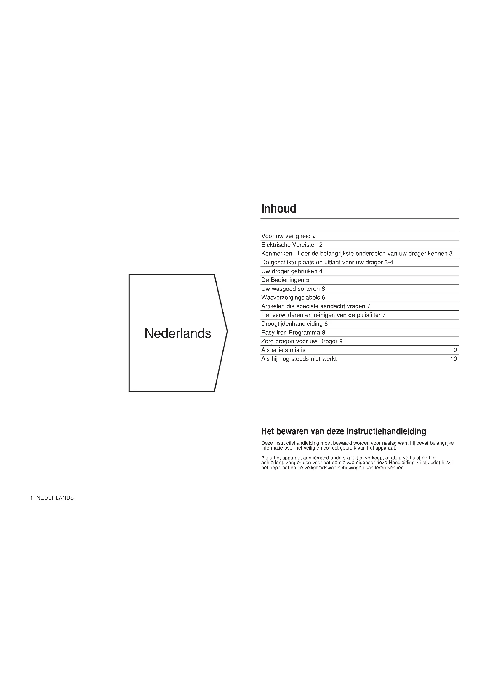 Stellen Sie bitte sicher, daß Sie diese Angaben bereit haben. Denken Sie bitte daran, daß es sich bei Ihrem neuen Wäschetrockner um eine komplizierte Maschine handelt. Selbstreparaturen oder durch unqualifizierte und nicht ausgebildete Leute ausgeführte Reparaturen können Sie in Gefahr bringen, Ihre Maschine beschädigen und können zu einem Verlust Ihrer Teilegarantie führen. Wenn Sie mit Ihrer Maschine Probleme haben, dann gehen Sie bitte keine Risiken ein. Lassen Sie einen unserer Wartungstechniker kom- men. Unsere Ersatzteile sind speziell für Ihre Maschine vorgesehen. Verwenden Sie sie auf keinen Fall für andere Zwecke, da dies eine Sicherheitsgefahr erzeugen könnte. Damit ein Verletzungsrisiko für Kinder minimiert werden kann, müssen Sie Ihre Maschine sicher entsorgen. Tür und Deckel müssen entfernt und das Netzkabel eben mit der Maschine abgeschnitten werden, damit der Netzstecker nicht mehr in die Steckdose gesteckt werden kann. Alle Teile müssen dann sicher entsorgt werden. Dieses Gerät erfüllt die folgenden EWG-Richtlinien Niederspannungsausrüstung 72/23/EEC 93/68/EEC Elektromagnetische Verträglichkeit 89/336/EEC 92/31/EEC 93/68/EEC Setzen Sie sich mit Ihrer Kundendienststelle in Verbindung DEUTSCH 101 NEDERLANDS Voor uw veiligheid 2 Elektrische Vereisten 2 Kenmerken - Leer de belangrijkste onderdelen van uw droger kennen 3 De geschikte plaats en uitlaat voor uw droger 3-4 Uw droger gebruiken 4 De Bedieningen 5 Uw wasgoed sorteren 6 Wasverzorgingslabels 6 Artikelen die speciale aandacht vragen 7 Het verwijderen en reinigen van de pluisfilter 7 Droogtijdenhandleiding 8 Easy Iron Programma 8 Zorg dragen voor uw Droger 9 Als er iets mis is 9 Als hij nog steeds niet werkt 10 Inhoud Het bewaren van deze Instructiehandleiding Deze instructiehandleiding moet bewaard worden voor naslag want hij bevat belangrijke informatie over het veilig en correct gebruik van het apparaat. Als u het apparaat aan iemand anders geeft of verkoopt of als u verhuist en het achterlaat, zorg er dan voor dat de nieuwe eigenaar deze Handleiding krijgt zodat hij/zij het apparaat en de veiligheidswaarschuwingen kan leren kennen. NederlandsVoor uw veiligheid ● Laat kinderen NOOIT met de droger spelen of knoeien. ● Zorg ervoor dat de luchttoevoer aan de achterkant van de droger, de luchtuitlaat of de uitlaatslang NOOIT geblokkeerd raakt. ● Wijs de uitlaatslanguitlaat NOOIT naar de luchtinlaat aan de achterkant van de machine. ● Zorg ervoor dat de droogtrommel NOOIT uitlaatlucht opnieuw gebruikt. ● Schakel de machine NOOIT uit wanneer er nog een hete lading in de trommel zit. ● Gebruik de droogtrommel NOOIT zonder de filter. ● Stop NOOIT meer in de droogtrommel dan aangeraden wordt en stop NOOIT druipendnatte stukken in de trommel. ● Gebruik de droger NOOIT op een tapijt waar de poolhoogte de luchttoevoer onderaan de droger belemmert. ● Zorg ervoor dat pluis zich NOOIT opstapelt rond de droger. ● Voeg NOOIT vloeibare of papieren wasverzachters toe aan de droger maar gebruik een vloeibare wasverzachter in de laatste spoeling van uw was. ● Gebruik de droger NOOIT voor commerciële doeleinden. De droger is alleen geschikt voor huishoudelijk gebruik. ● Droog Acrylvezels NOOIT op de hoge hittestand.. ● Droog NOOIT artikelen die NIET goed gewassen zijn in water en zeep en die goed gespoeld en gecentrifugeerd zijn. ● Droog NOOIT artikelen in de droogtrommel die gebruikt werden met chemische reinigingsproducten. ● Droog NOOIT artikelen die in contact gekomen zijn met vlambare produkten zoals benzine, olie, verf, haarlak, crèmes, bakvet of -olie. ● Droog NOOIT: rubber, schuimrubber, plastic, plasticschuim, luier- broekjes of luiervoering, polyethyleen of papier. Grote, omvangrijke artikelen met inbegrip van donsdekens en slaapzakken. ● Probeer NOOIT bovenop uw droger te staan. Hij werd niet ontwor- pen voor dergelijk gebruik en uw zou zich kunnen kwetsen en de droger kunnen beschadigen. ● Schakel de elektriciteit NOOIT Aan of Uit met natte handen. BELANGRIJK Het gebruik van uw Droogtrommel is gemakkelijk. Toch is het voor uw eigen veiligheid en voor de beste resultaten van belang dat u uw Droger kent door deze handleiding volledig te lezen vooraleer u uw droger begint te gebruiken. EEN KIND KAN IN EEN ONBEHEERDE DROOGTROMMEL KRUIPEN OF ERMEE KNOEIEN. WANNEER U DE MACHINE NIET GEBRUIKT, SCHAKEL HEM DAN UIT, TREK DE STEKKER UIT EN SLUIT DE DEUR. BELANGRIJK Voor uw veiligheid ● Schakel de droger ALTIJD uit wanneer u hem niet gebruikt, trek de stekker uit en sluit de deur. ● Voldoe ALTIJD aan de voorgestelde elektrische vereisten. ● Zorg er ALTIJD voor dat uw droger correct geïnstalleerd is en vol- doende ventilatie heeft. (zie “De Geschikte plaats en uitlaat voor uw droger.”) ● Gebruik ALTIJD de ventilatieslang voor een optimale droogprestatie. ● Eindig ieder programma ALTIJD met een koele droogcyclus die voorzien is op de knop. ● Reinig ALTIJD de filter. Het is bijzonder belangrijk dat de filter altijd vrij is van pluisjes. ● Volg ALTIJD de richtlijnen wanneer u kledingstukken droogt. Wollen artikelen mogen nooit in de droogtrommel gedroogd worden tenzij er‘Superwas’, ‘Wasbaar in de machine’ of het ‘Mag in de droogtrommel symbool op het etiket staat. Als u twijfelt, is het best dat u wol niet in de machine stopt. Wol is niet zoals andere stoffen. Eens een artikel gekrompen is, kan het nooit meer tot zijn originele maat en vorm getrokken worden. ● Koop ALTIJD authentieke accessoires en onderdelen. Elektrische Vereisten VERWIJS NAAR DE GEGEVENSPLAATJE VOOR HET VOLTAGE EN HUIDIGE VEREISTEN (zie diagram voor locatie.) De droger moet aan de elektriciteit aangesloten zijn via een geschikt stopcontact dat bereikbaar is na het installeren van uw droger. De draden in de elektrische leiding zijn als volgt gekleurd: