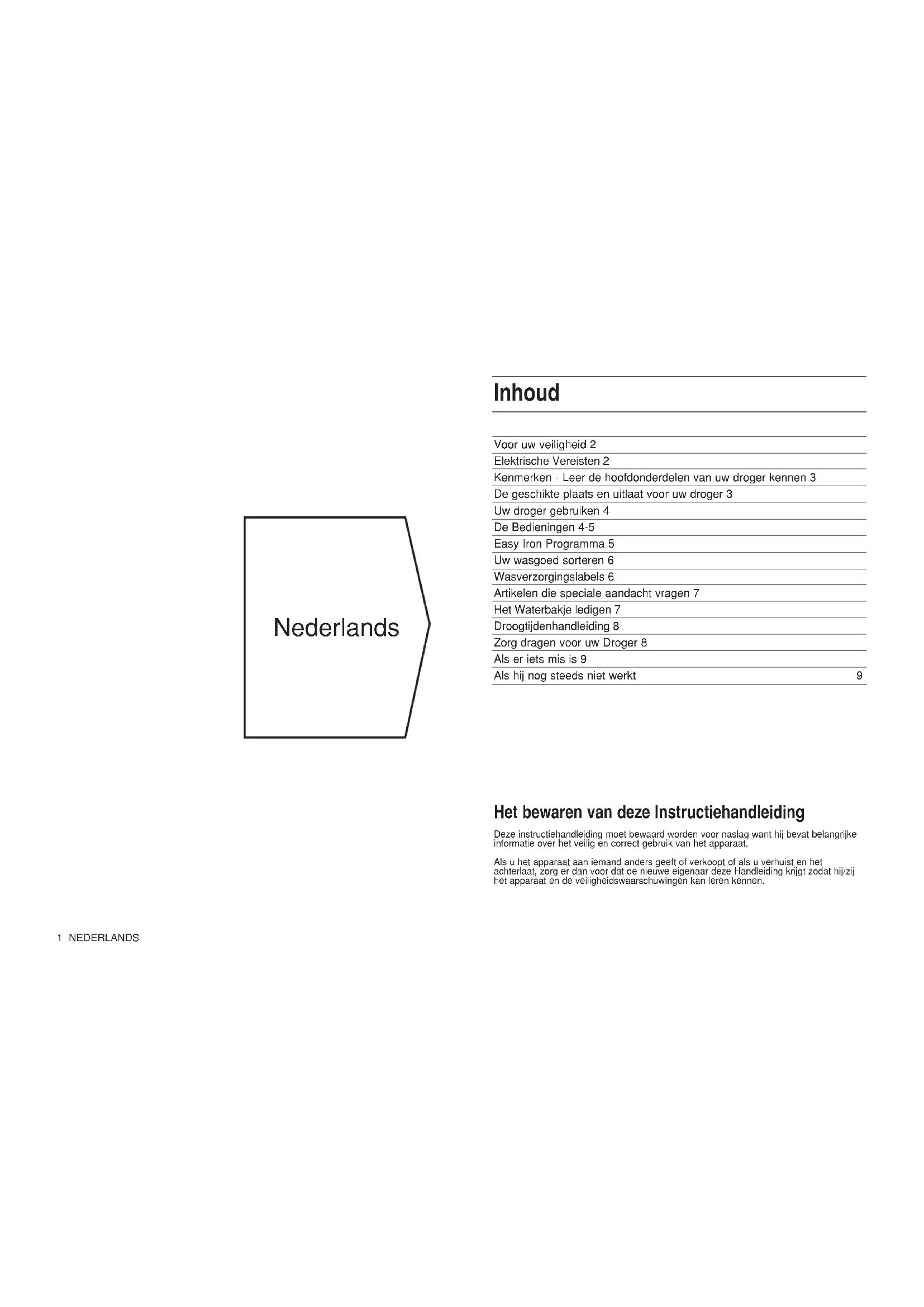 Voor een omschrijving van andere programma's zie de volgende pagina. Druk de START-knop in om met een droogprogramma te beginnen (het droogprogramma moet eerst zijn gekozen). Het lampje voor actief zal dan branden. De alarmoptie wordt gekozen wanneer de toets naar BUITEN staat. Wanneer u deze optie niet nodig heeft, druk de toets dan in de INGEDRUKT positie. Het alarm (indien gekozen) zal dan aan het eind van het programma afgaan, of met tussenpozen tijdens de antikreuk-fase. Instellen van programma Programma-opties Starten van droogautomaat Alarmschakelaar OPMERKING: Wanneer de deur tijdens een programma wordtgeopend, zal de droogautomaat automatisch stoppen. U zult, nadat de deur gesloten is, de START-toets moeten indrukken om het programma opnieuw te starten.5 NEDERLANDS De Bedieningen Lampje voor Actief Lampje voor Drogen Ledig Water Licht Afkoelfase Anti-kreukfase Dit lampje brandt wanneer een programma actief is (draait). Wanneer dit lampje knippert dan heeft een automatische programma de 180 minuten overschreden. Om veiligheidsredenen is dit de maximum beschikbare tijd. Mocht dit gebeuren dan kan de oorzaak het volgende zijn: ● De lading is te groot, of omvangrijk. ● De filter is verstopt ● Een katoenen lading is op lage snelheid gedraaid. ● Er kan een storing zijn. Schakel de droogautomaat UIT, controleer de eerste drie oorzaken en probeer dan opnieuw. Dit lampje brandt tijdens de droogcyclus van het programma, behalve voor de korte perioden tijdens het in de andere richting draaien van de trommel. Dit lampje zal branden wanneer het waterreservoir vol is. U moet niet wachten tot dit lampje gaat branden voordat u het water- reservoir leegt, maar leeg het na elke lading (zie de sectie “Legen van waterreservoir”). OPMERKING: Wanneer het lampje brandt moet u de droogautomaat stopzetten en het waterreservoir legen. Wanneer het lampje brandt tijdens een droogcyclus, zal de timer doorlopen naar de koele fase zonder dat de lading wordt gedroogd. Nadat het lege reservoir weer is teruggezet, zal het ongeveer 10 sec- onden duren voordat het lampje uitgaat. U kunt geen nieuw programma starten wanneer dit lampje brandt, het waterreservoir moet eerst worden geleegd. Ongeveer 10 minuten voordat het programma is voltooid zal het verwarmingselement uitgeschakeld worden en zal het programma de laatste cyclus, de 'koele fase', beginnen. Tijdens deze fase wordt de stof afgekoeld. U moet de droogautomaat altijd deze fase laten voltooien. Door de deur te openen kunt u zo vaak als u wilt de droogte van de lading controleren en wanneer u dit wenst een aantal artikelen verwijderen voordat ze volledig droog zijn. (Dit is vooral handig bij een gemengde lading, waar u bepaalde artikelen wilt strijken en andere volledig wilt laten drogen). U zult, nadat de deur gesloten is, de starttoets moeten indrukken om het programma opnieuw te starten. Zie voorgaande pagina. Aan het eind van het droogprogramma kan het zijn dat u geen tijd heeft om de kleding onmiddellijk te verwijderen. Maak u echter niet bezorgd, de droogautomaat beschermt uw kleding tegen kreuken door deze af en toe met een paar omwentelingen van de trommel om te draaien. Tegelijkertijd zal met tussenpozen een alarm (zoemer) (indien niet uitgeschakeld) afgaan, om u eraan te herinneren dat de kleding klaar is om verwijderd te worden. Easy Iron Programma Wanneer wordt 'Easy Iron' gebruikt Belangrijk Geluidssignaal 'Easy Iron' is een kort programma dat bestaat uit ongeveer 8 minuten warmte met een ongeveer 2 minuten durende afkoelperiode. Dit is een kort conditioneringsprogramma dat de vezels verzacht te ontspannen, hetgeen hanteren en strijken gemakkelijker en minder tijdrovend maakt. Op wat voor manier kleding ook wordt gedroogd, buiten op de waslijn, binnen op een radiator, ergens opgehangen in huis of met gebruik van een droogautomaat, wanneer ze droog zijn blijven ze meestal een lange tijd in dezelfde positie/plaats. Dit veroorzaakt vezelstijfheid van de kleding wat de strijktijd langer maakt. Kleding die wordt gedroogd op een van de hierboven staande manieren en niet worden verwijderd, zullen profiteren van het 'Easy Iron'- programma. ● De 'Easy Iron' cyclus is geen droogprogramma. Het is ontworpen om de kleding die reeds droog is en lange tijd in deze toestand is gelaten te conditioneren/verzachten. ● Stoffen gedragen zich niet allemaal op precies dezelfde manier wanneer ze worden verwarmd. Voorbeeld: onze tests hebben uit gewezen dat stoffen zoals Tencel® en Acryl zich niet zo effectief ontspannen wanneer de 'Easy Iron' cyclus wordt toegepast dan de meer traditionele katoen en polyester/katoen. ● Om te beste resultaten te behalen met 'Easy Iron' is het belangrijk dat de onderstaande gewichten niet worden overschreden. ● Voor de beste resultaten bevelen wij aan dat kledingstukken onmiddellijk na het 'Easy Iron' programma uit de droogau tomaat worden gehaald om te worden opgehangen, netjes te worden opgevouwen of te worden gestreken. Wanneer dit niet mogelijk is dan dient het 'Easy Iron' pro gramma te worden herhaald. Aanbevolen gewichten en stoffen Wanneer het programma beëindigd is zal een geluidssignaal (indien gekozen) te horen zijn, om u eraan te herinneren de kledingstukken uit de droogautomaat te halen. Stoffen Maximum lading Katoen en katoenmengsels 2,5 kg 2 kg 2 kg Synthetische stoffen DenimNEDERLANDS 6 Uw wasgoed sorteren