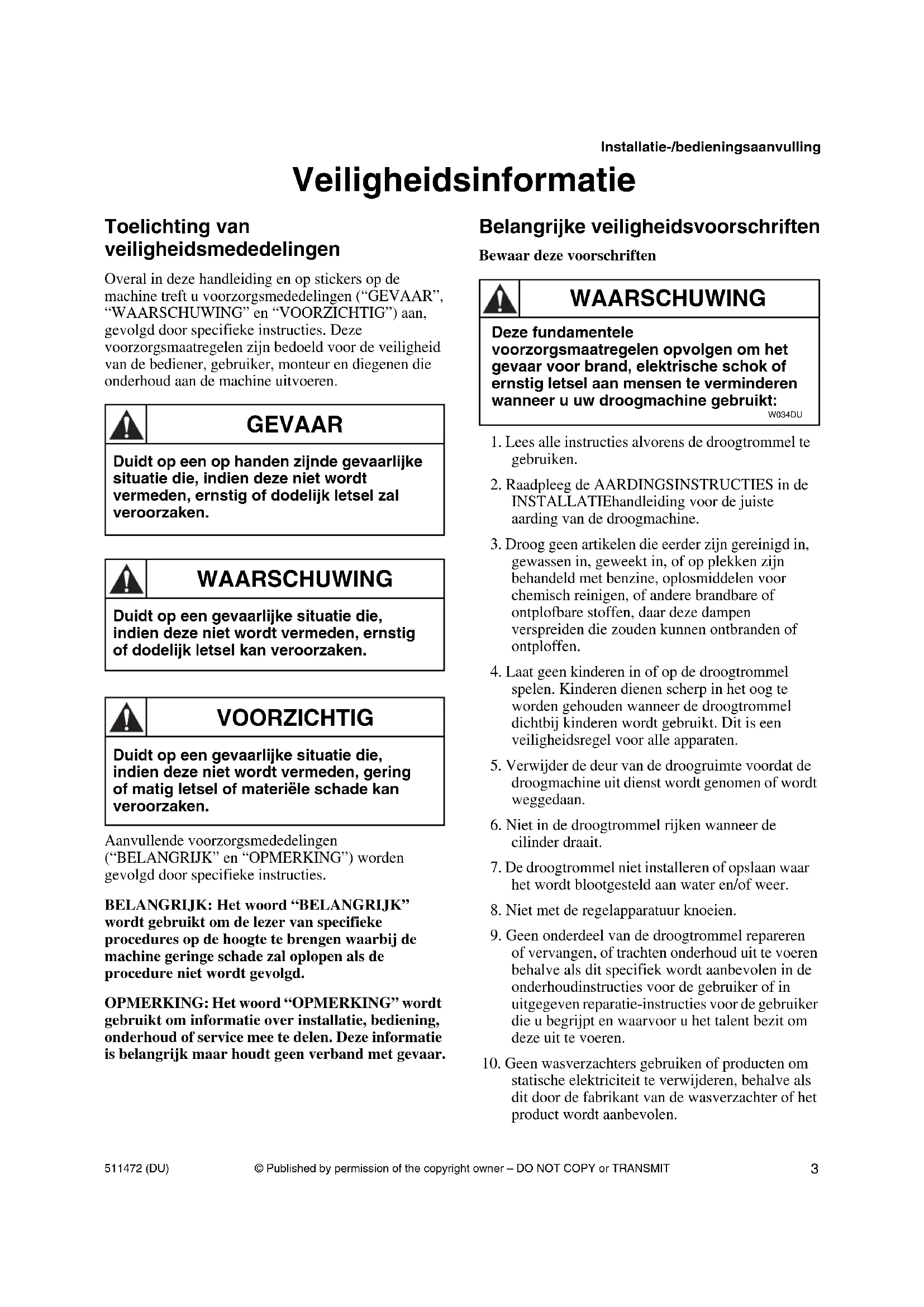 statische elektriciteit te verwijderen, behalve als dit door de fabrikant van de wasverzachter of het product wordt aanbevolen. Duidt op een op handen zijnde gevaarlijke situatie die, indien deze niet wordt vermeden, ernstig of dodelijk letsel zal veroorzaken. GEVAAR Duidt op een gevaarlijke situatie die, indien deze niet wordt vermeden, ernstig of dodelijk letsel kan veroorzaken. WAARSCHUWING Duidt op een gevaarlijke situatie die, indien deze niet wordt vermeden, gering of matig letsel of materiële schade kan veroorzaken. VOORZICHTIG Deze fundamentele voorzorgsmaatregelen opvolgen om het gevaar voor brand, elektrische schok of ernstig letsel aan mensen te verminderen wanneer u uw droogmachine gebruikt: W034DU WAARSCHUWING© Published by permission of the copyright owner – DO NOT COPY or TRANSMIT Installatie-/bedieningsaanvulling 511472 (DU)