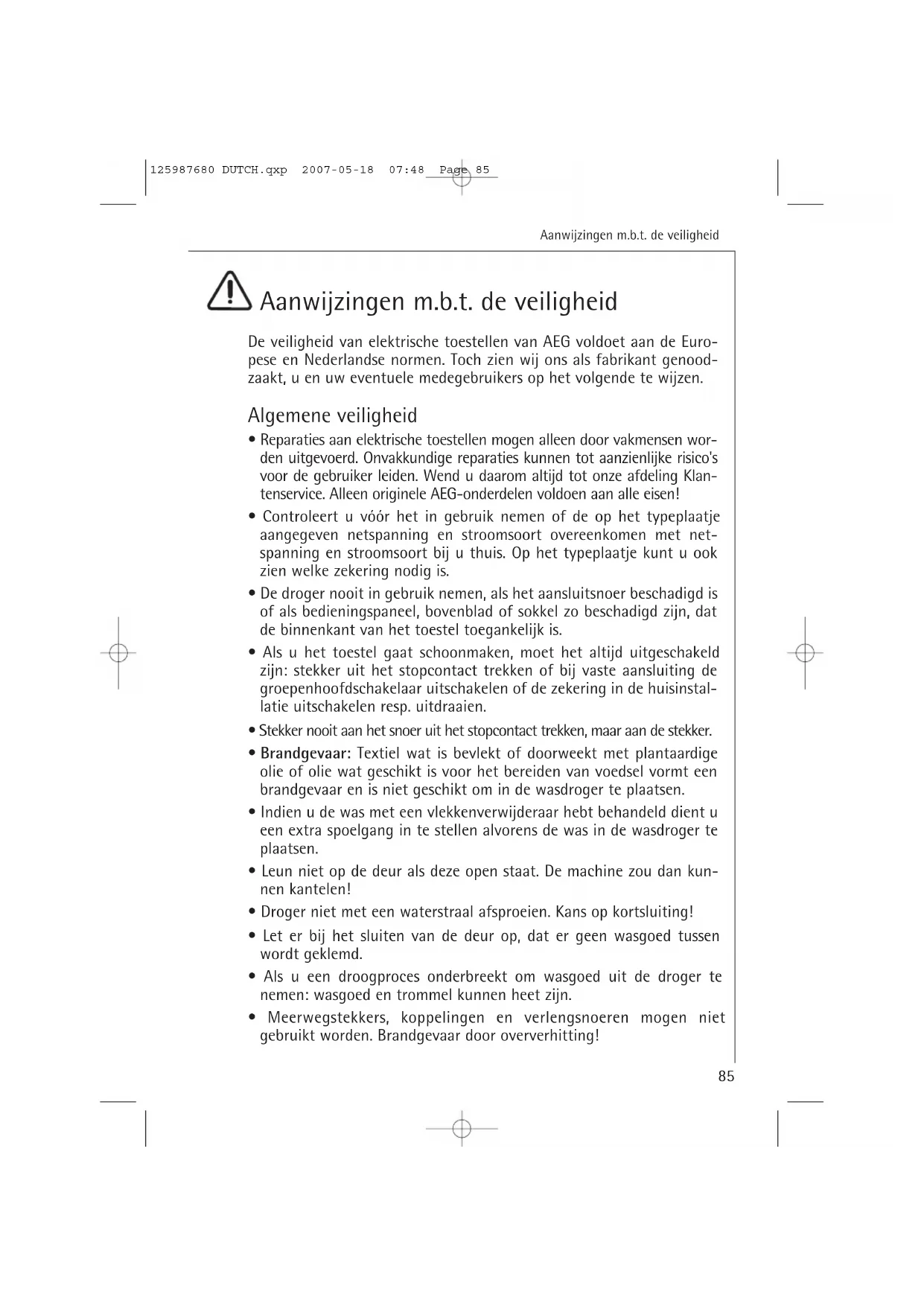 - Garantiebepalingen 125987680 DUTCH.qxp 2007-05-18 07:48 Page 8485 Aanwijzingen m.b.t. de veiligheid Aanwijzingen m.b.t. de veiligheid De veiligheid van elektrische toestellen van AEG voldoet aan de Euro- pese en Nederlandse normen. Toch zien wij ons als fabrikant genood- zaakt, u en uw eventuele medegebruikers op het volgende te wijzen. Algemene veiligheid p. 108