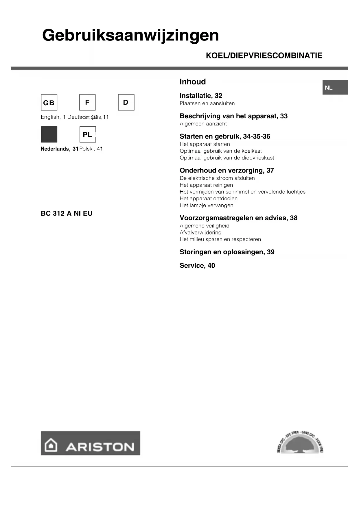 Net Util UtileGrossBruto Brut Freez. CapacPoder de Cong Made in Italy 13918 Test P.S-I.PressureHIGH-235LOW 140kg/24 h 4,0 ClassClase ClasseModell ModellnummerNL KOEL/DIEPVRIESCOMBINATIE Inhoud Installatie, 32 Plaatsen en aansluiten Beschrijving van het apparaat, 33 Algemeen aanzicht Starten en gebruik, 34-35-36 Het apparaat starten Optimaal gebruik van de koelkast Optimaal gebruik van de diepvrieskast Onderhoud en verzorging, 37 De elektrische stroom afsluiten Het apparaat reinigen Het vermijden van schimmel en vervelende luchtjes Het apparaat ontdooien Het lampje vervangen Voorzorgsmaatregelen en advies, 38 Algemene veiligheid Afvalverwijdering Het milieu sparen en respecteren Storingen en oplossingen, 39 Service, 40 Gebruiksaanwijzingen English, 1 Deutsch, 21 Polski, 41 Nederlands , 31 Français,11