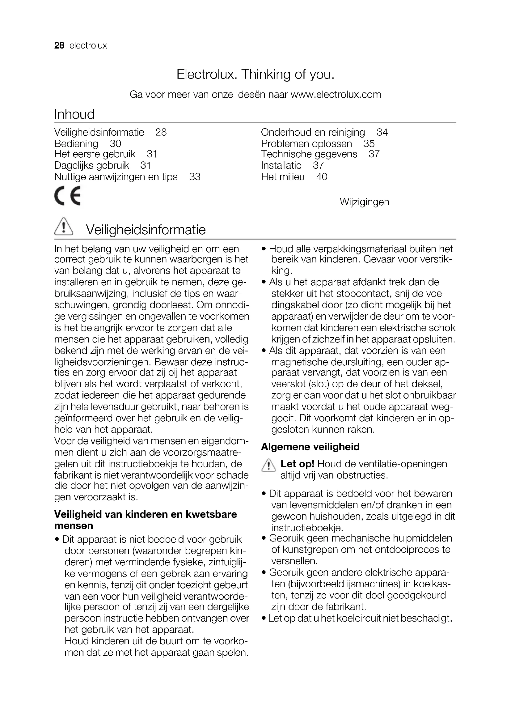 - The door opens and closes correctly. If the ambient temperature is cold (i.e. in Win- ter), the gasket may not fit perfectly to the cabinet. In that case, wait for the natural fit- ting of the gasket or accelerate this process by heating up the part involved with a normal hair drier. In case you do not want to carry out the above mentioned operations, contact the nearest After Sales Service Force. The After Sales Service specialist will carry out the re- versibility of the doors at your cost. 26 electroluxEnvironmental concerns The symbol on the product or on its packaging indicates that this product may not be treated as household waste. Instead it should be taken to the appropriate collection point for the recycling of electrical and electronic equipment. By ensuring this product is disposed of correctly, you will help prevent potential negative consequences for the environment and human health, which could otherwise be caused by inappropriate waste handling of this product. For more detailed information about recycling of this product, please contact your local council, your household waste disposal service or the shop where you purchased the product. electrolux 27Electrolux. Thinking of you. Ga voor meer van onze ideeën naar www.electrolux.com Inhoud Veiligheidsinformatie 28 Bediening 30 Het eerste gebruik 31 Dagelijks gebruik 31 Nuttige aanwijzingen en tips 33 Onderhoud en reiniging 34 Problemen oplossen 35 Technische gegevens 37 Installatie 37 Het milieu 40 Wijzigingen voorbehouden Veiligheidsinformatie In het belang van uw veiligheid en om een correct gebruik te kunnen waarborgen is het van belang dat u, alvorens het apparaat te installeren en in gebruik te nemen, deze ge- bruiksaanwijzing, inclusief de tips en waar- schuwingen, grondig doorleest. Om onnodi- ge vergissingen en ongevallen te voorkomen is het belangrijk ervoor te zorgen dat alle mensen die het apparaat gebruiken, volledig bekend zijn met de werking ervan en de vei- ligheidsvoorzieningen. Bewaar deze instruc- ties en zorg ervoor dat zij bij het apparaat blijven als het wordt verplaatst of verkocht, zodat iedereen die het apparaat gedurende zijn hele levensduur gebruikt, naar behoren is geïnformeerd over het gebruik en de veilig- heid van het apparaat. Voor de veiligheid van mensen en eigendom- men dient u zich aan de voorzorgsmaatre- gelen uit dit instructieboekje te houden, de fabrikant is niet verantwoordelijk voor schade die door het niet opvolgen van de aanwijzin- gen veroorzaakt is. Veiligheid van kinderen en kwetsbare mensen