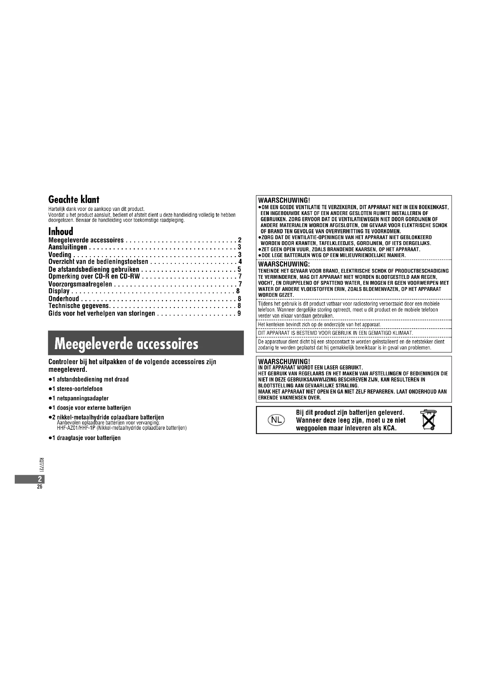- Gids voor het verhelpen van storingen WAARSCHUWING! IN DIT APPARAAT WORDT EEN LASER GEBRUIKT.HET GEBRUIK VAN REGELAARS EN HET MAKEN VAN AFSTELLINGEN OF BEDIENINGEN DIENIET IN DEZE GEBRUIKSAANWIJZING BESCHREVEN ZIJN, KAN RESULTEREN INBLOOTSTELLING AAN GEVAARLIJKE STRALING.MAAK HET APPARAAT NIET OPEN EN GA NIET ZELF REPAREREN. LAAT ONDERHOUD AANERKENDE VAKMENSEN OVER. Controleer bij het uitpakken of de volgende accessoires zijn meegeleverd. ≥1 afstandsbediening met draad≥1 stereo-oortelefoon≥1 netspanningsadapter≥1 doosje voor externe batterijen≥2 nikkel-metaalhydride oplaadbare batterijenAanbevolen oplaadbare batterijen voor vervanging:HHF-AZ01/HHF-1P (Nikkel-metaalhydride oplaadbare batterijen)≥1 draagtasje voor batterijen Bij dit product zijn batterijen geleverd. Wanneer deze leeg zijn, moet u ze niet weggooien maar inleveren als KCA. p. 9