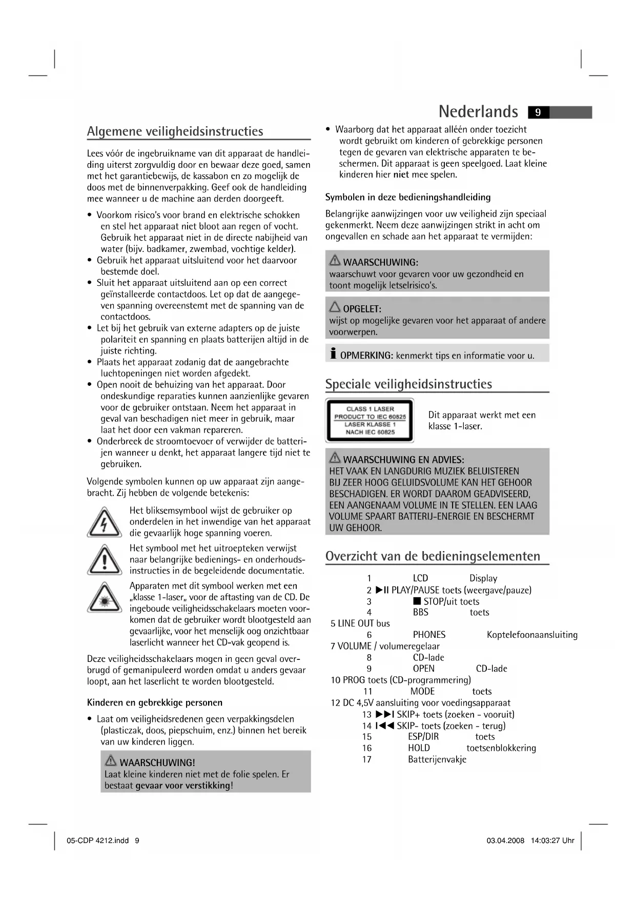UW GEHOOR. Overzicht van de bedieningselementen 1 LCD Display 2 왘II PLAY/PAUSE toets (weergave/pauze) 3 왎 STOP/uit toets 4 BBS toets 5 LINE OUT bus 6 PHONES Koptelefoonaansluiting 7 VOLUME / volumeregelaar 8 CD-lade 9 OPEN CD-lade 10 PROG toets (CD-programmering) 11 MODE toets 12 DC 4,5V aansluiting voor voedingsapparaat 13 왘왘I SKIP+ toets (zoeken - vooruit) 14 I왗왗 SKIP- toets (zoeken - terug) 15 ESP/DIR toets 16 HOLD toetsenblokkering 17 Batterijenvakje 05-CDP 4212.indd 905-CDP 4212.indd 9 03.04.2008 14:03:27 Uhr03.04.2008 14:03:27 UhrNederlands