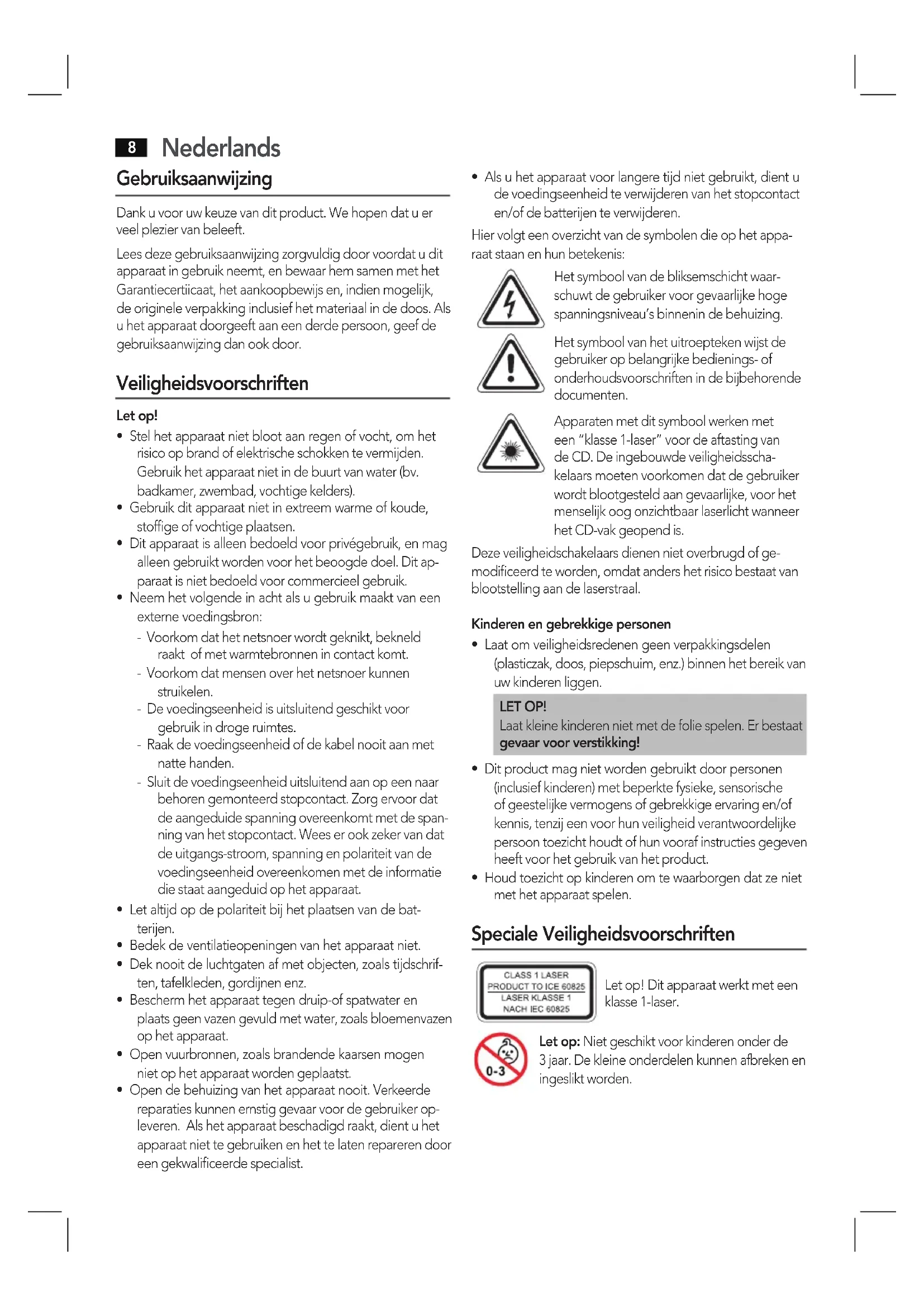 - Houd toezicht op kinderen om te waarborgen dat ze niet met het apparaat spelen. Speciale Veiligheidsvoorschriften Let op! Dit apparaat werkt met een klasse 1-laser. Let op: Niet geschikt voor kinderen onder de 3 jaar. De kleine onderdelen kunnen afbreken en ingeslikt worden.Nederlands