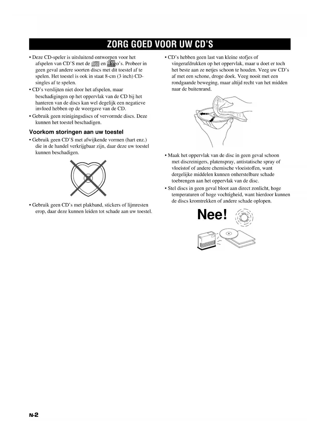 - Gebruik geen CD’S met afwijkende vormen (hart enz.) die in de handel verkrijgbaar zijn, daar deze uw toestel kunnen beschadigen.
