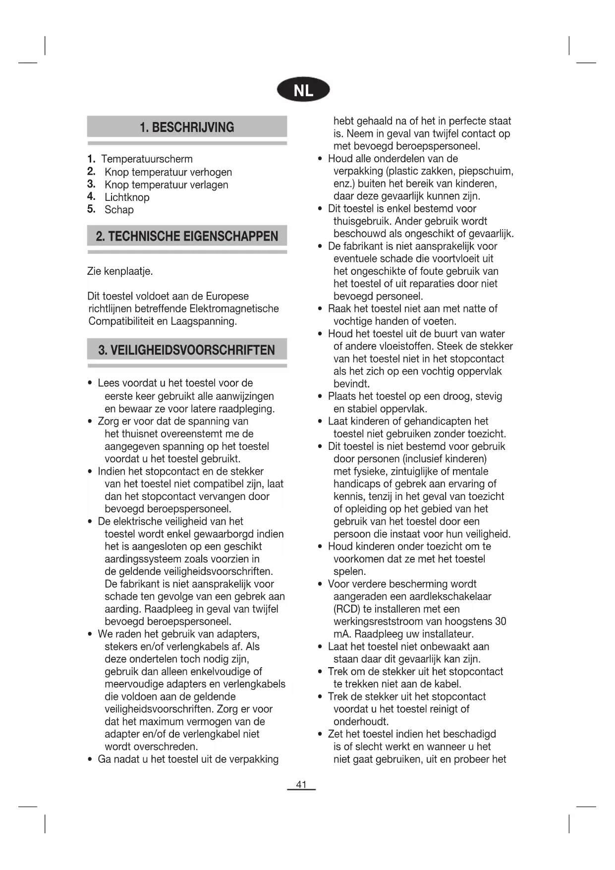 - Dit toestel is niet bestemd voor gebruik door personen (inclusief kinderen) met fysieke, zintuiglijke of mentale handicaps of gebrek aan ervaring of kennis, tenzij in het geval van toezicht of opleiding op het gebied van het gebruik van het toestel door een persoon die instaat voor hun veiligheid.