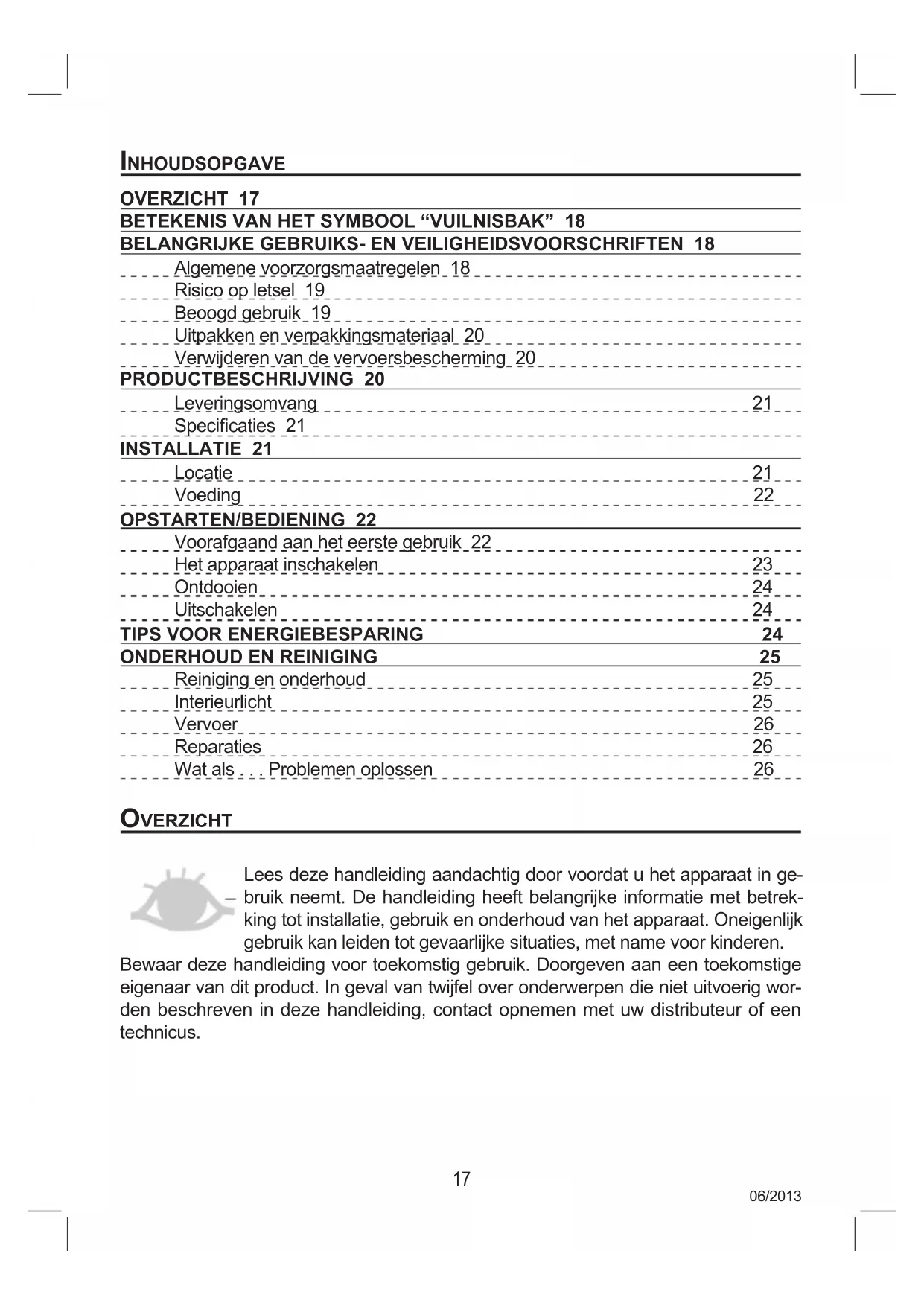 inhOUDsOPGave Overzicht 17 BeteKenis van het sYMBOOl “vUilnisBaK” 18 BelanGriJKe GeBrUiKs- en veiliGheiDsvOOrschriFten 18 Algemene voorzorgsmaatregelen 18 Risico op letsel 19 Beoogd gebruik 19 Uitpakken en verpakkingsmateriaal 20 Verwijderen van de vervoersbescherming 20 PrODUctBeschriJvinG 20 Leveringsomvang 21 Specicaties 21 installatie 21 Locatie 21 Voeding 22 OPstarten/BeDieninG 22 Voorafgaand aan het eerste gebruik 22 Het apparaat inschakelen 23 Ontdooien 24 Uitschakelen 24 tiPs vOOr enerGieBesParinG 24 OnDerhOUD en reiniGinG 25 Reiniging en onderhoud 25 Interieurlicht 25 Vervoer 26 Reparaties 26 Wat als . . . Problemen oplossen 26