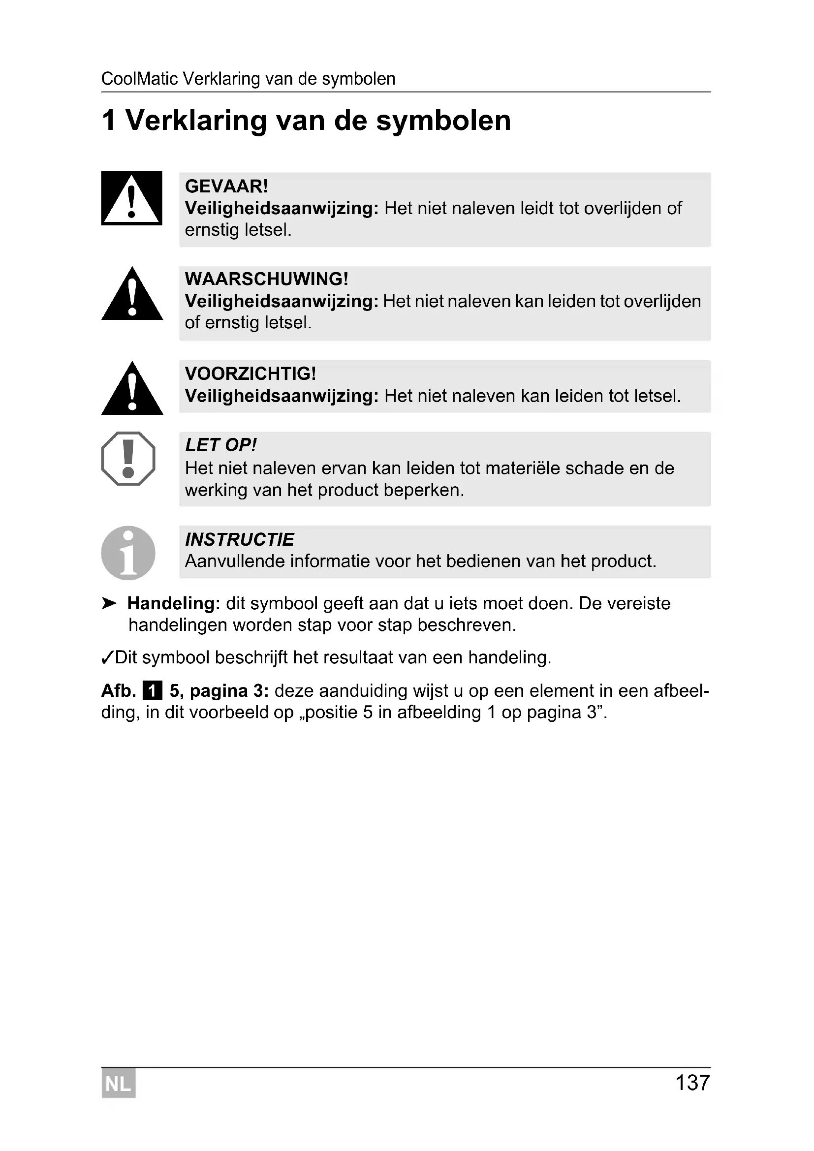 ➤ Handeling: dit symbool geeft aan dat u iets moet doen. De vereiste handelingen worden stap voor stap beschreven. ✓ Dit symbool beschrijft het resultaat van een handeling. Afb. 1 5, pagina 3: deze aanduiding wijst u op een element in een afbeel- ding, in dit voorbeeld op „positie 5 in afbeelding 1 op pagina 3”. GEVAAR! Veiligheidsaanwijzing: Het niet naleven leidt tot overlijden of ernstig letsel. WAARSCHUWING! Veiligheidsaanwijzing: Het niet naleven kan leiden tot overlijden of ernstig letsel. VOORZICHTIG! Veiligheidsaanwijzing: Het niet naleven kan leiden tot letsel. LET OP! Het niet naleven ervan kan leiden tot materiële schade en de werking van het product beperken. INSTRUCTIE Aanvullende informatie voor het bedienen van het product.NL Veiligheidsinstructies CoolMatic