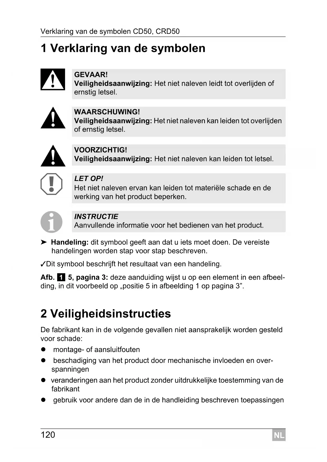 ➤ Handeling: dit symbool geeft aan dat u iets moet doen. De vereiste handelingen worden stap voor stap beschreven. ✓ Dit symbool beschrijft het resultaat van een handeling. Afb. 1 5, pagina 3: deze aanduiding wijst u op een element in een afbeel- ding, in dit voorbeeld op „positie 5 in afbeelding 1 op pagina 3”. 2 Veiligheidsinstructies De fabrikant kan in de volgende gevallen niet aansprakelijk worden gesteld voor schade: montage- of aansluitfouten beschadiging van het product door mechanische invloeden en over- spanningen veranderingen aan het product zonder uitdrukkelijke toestemming van de fabrikant gebruik voor andere dan de in de handleiding beschreven toepassingen GEVAAR! Veiligheidsaanwijzing: Het niet naleven leidt tot overlijden of ernstig letsel. WAARSCHUWING! Veiligheidsaanwijzing: Het niet naleven kan leiden tot overlijden of ernstig letsel. VOORZICHTIG! Veiligheidsaanwijzing: Het niet naleven kan leiden tot letsel. LET OP! Het niet naleven ervan kan leiden tot materiële schade en de werking van het product beperken. INSTRUCTIE Aanvullende informatie voor het bedienen van het product.NL CD50, CRD50 Veiligheidsinstructies