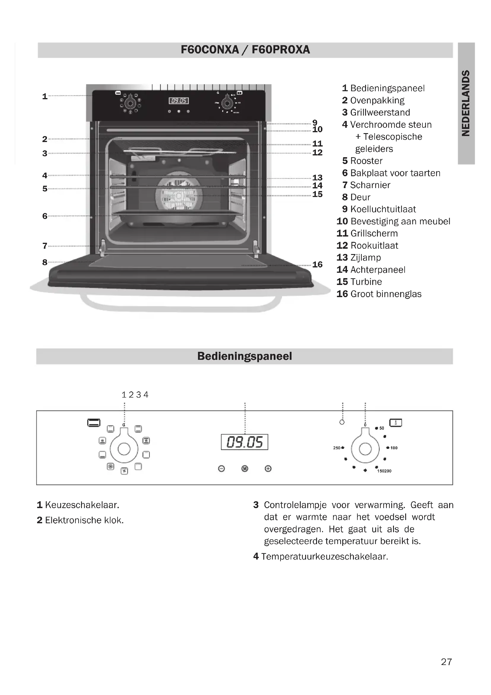 Bedieningspaneel 1 Bedieningspaneel 2 Ovenpakking 3 Grillweerstand 4 Verchroomde steun + Telescopische geleiders 5 Rooster 6 Bakplaat voor taarten 7 Scharnier 8 Deur 9 Koelluchtuitlaat 10 Bevestiging aan meubel 11 Grillscherm 12 Rookuitlaat 13 Zijlamp 14 Achterpaneel 15 Turbine 16 Groot binnenglas 1 Keuzeschakelaar. 2 Elektronische klok. 3 Controlelampje voor verwarming. Geeft aan dat er warmte naar het voedsel wordt overgedragen. Het gaat uit als de geselecteerde temperatuur bereikt is. 4 Temperatuurkeuzeschakelaar.