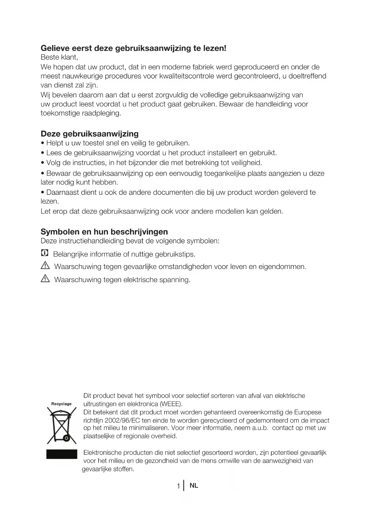 Gelieve eerst deze gebruiksaanwijzing te lezen! Beste klant, We hopen dat uw product, dat in een moderne fabriek werd geproduceerd en onder de meest nauwkeurige procedures voor kwaliteitscontrole werd gecontroleerd, u doeltreffend van dienst zal zijn. Wij bevelen daarom aan dat u eerst zorgvuldig de volledige gebruiksaanwijzing van uw product leest voordat u het product gaat gebruiken. Bewaar de handleiding voor toekomstige raadpleging. Deze gebruiksaanwijzing