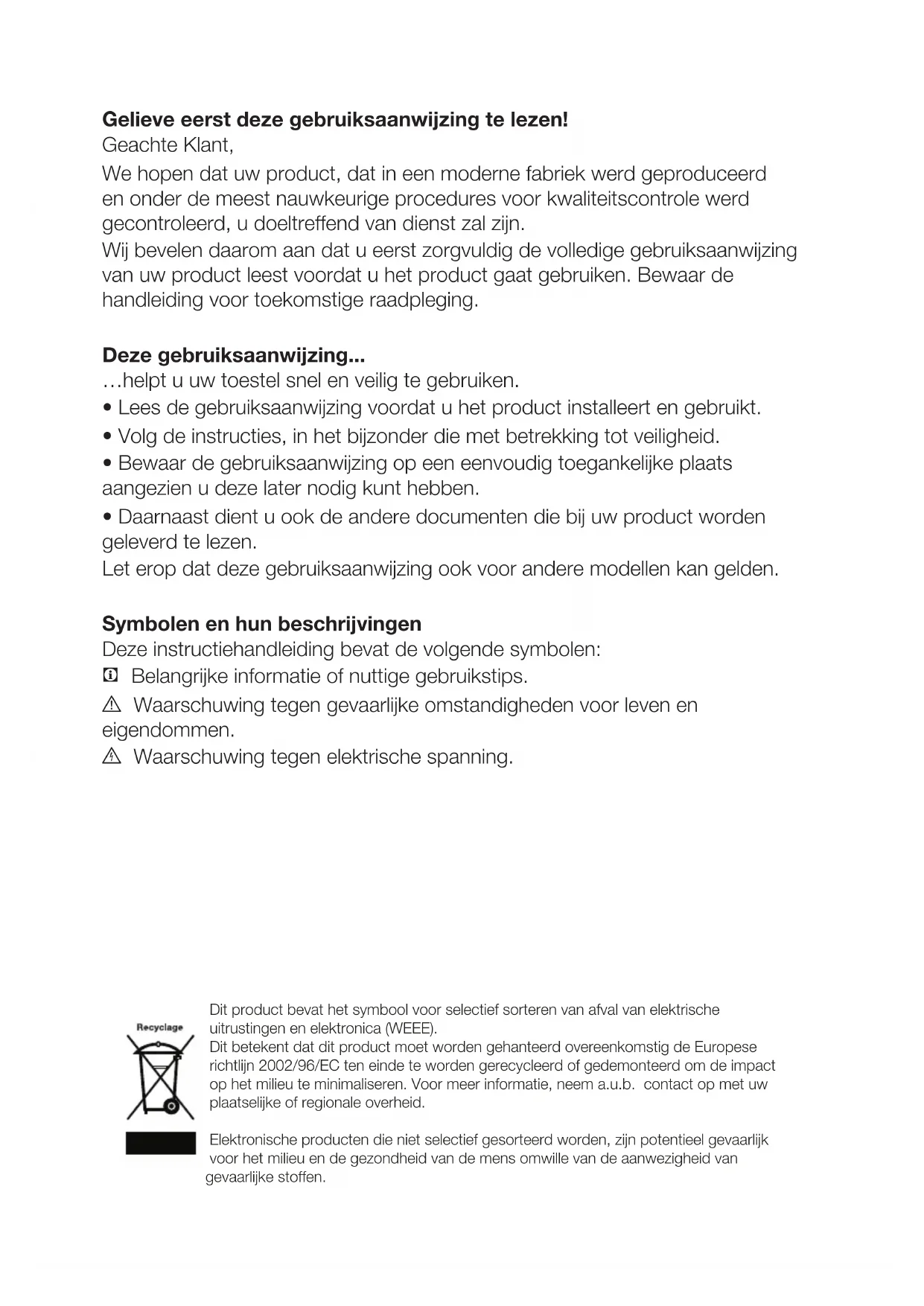 - Daarnaast dient u ook de andere documenten die bij uw product worden geleverd te lezen. Let erop dat deze gebruiksaanwijzing ook voor andere modellen kan gelden. Symbolen en hun beschrijvingen Deze instructiehandleiding bevat de volgende symbolen: C Belangrijke informatie of nuttige gebruikstips. A Waarschuwing tegen gevaarlijke omstandigheden voor leven en eigendommen. B Waarschuwing tegen elektrische spanning. Dit product bevat het symbool voor selectief sorteren van afval van elektrische uitrustingen en elektronica (WEEE). Dit betekent dat dit product moet worden gehanteerd overeenkomstig de Europese richtlijn 2002/96/EC ten einde te worden gerecycleerd of gedemonteerd om de impact op het milieu te minimaliseren. Voor meer informatie, neem a.u.b. contact op met uw plaatselijke of regionale overheid. Elektronische producten die niet selectief gesorteerd worden, zijn potentieel gevaarlijk voor het milieu en de gezondheid van de mens omwille van de aanwezigheid van gevaarlijke stoffen.NL