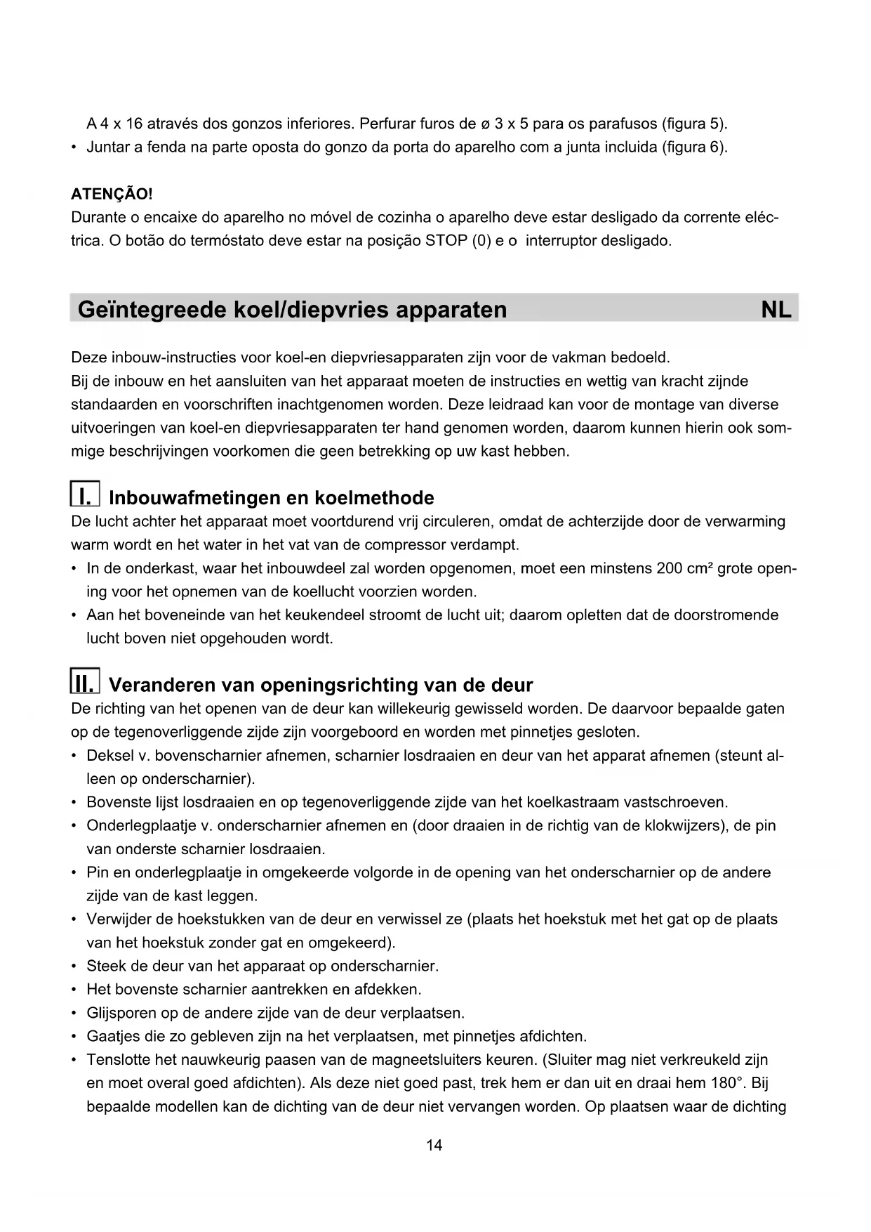 III.14 A 4 x 16 através dos gonzos inferiores. Perfurar furos de ø 3 x 5 para os parafusos (fi gura 5). Juntar a fenda na parte oposta do gonzo da porta do aparelho com a junta incluida (fi gura 6). ATENÇÃO! Durante o encaixe do aparelho no móvel de cozinha o aparelho deve estar desligado da corrente eléc- trica. O botão do termóstato deve estar na posição STOP (0) e o interruptor desligado. Deze inbouw-instructies voor koel-en diepvriesapparaten zijn voor de vakman bedoeld. Bij de inbouw en het aansluiten van het apparaat moeten de instructies en wettig van kracht zijnde standaarden en voorschriften inachtgenomen worden. Deze leidraad kan voor de montage van diverse uitvoeringen van koel-en diepvriesapparaten ter hand genomen worden, daarom kunnen hierin ook som- mige beschrijvingen voorkomen die geen betrekking op uw kast hebben. Inbouwafmetingen en koelmethode De lucht achter het apparaat moet voortdurend vrij circuleren, omdat de achterzijde door de verwarming warm wordt en het water in het vat van de compressor verdampt. In de onderkast, waar het inbouwdeel zal worden opgenomen, moet een minstens 200 cm² grote open- ing voor het opnemen van de koellucht voorzien worden. Aan het boveneinde van het keukendeel stroomt de lucht uit; daarom opletten dat de doorstromende lucht boven niet opgehouden wordt. Veranderen van openingsrichting van de deur De richting van het openen van de deur kan willekeurig gewisseld worden. De daarvoor bepaalde gaten op de tegenoverliggende zijde zijn voorgeboord en worden met pinnetjes gesloten. Deksel v. bovenscharnier afnemen, scharnier losdraaien en deur van het apparat afnemen (steunt al- leen op onderscharnier). Bovenste lijst losdraaien en op tegenoverliggende zijde van het koelkastraam vastschroeven. Onderlegplaatje v. onderscharnier afnemen en (door draaien in de richtig van de klokwijzers), de pin van onderste scharnier losdraaien. Pin en onderlegplaatje in omgekeerde volgorde in de opening van het onderscharnier op de andere zijde van de kast leggen. Verwijder de hoekstukken van de deur en verwissel ze (plaats het hoekstuk met het gat op de plaats van het hoekstuk zonder gat en omgekeerd). Steek de deur van het apparaat op onderscharnier. Het bovenste scharnier aantrekken en afdekken. Glijsporen op de andere zijde van de deur verplaatsen. Gaatjes die zo gebleven zijn na het verplaatsen, met pinnetjes afdichten. Tenslotte het nauwkeurig paasen van de magneetsluiters keuren. (Sluiter mag niet verkreukeld zijn en moet overal goed afdichten). Als deze niet goed past, trek hem er dan uit en draai hem 180°. Bij bepaalde modellen kan de dichting van de deur niet vervangen worden. Op plaatsen waar de dichting