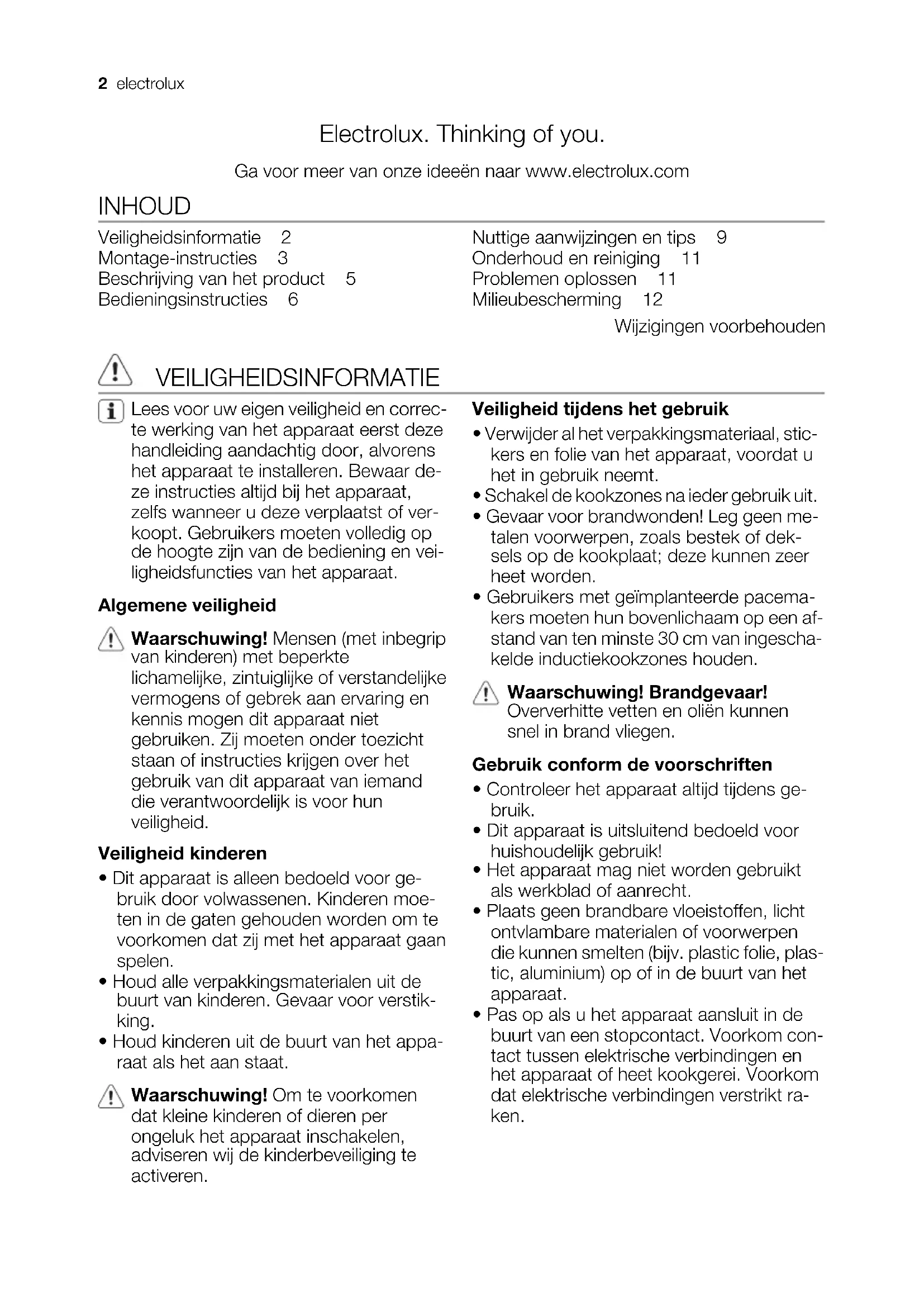 - Oververhittingsbeveiliging voor de kookzone is in werking getre- den. Schakel de kookzone uit. Schakel de kookzone weer in. en een cijfer gaan branden. Het apparaat heeft een storing. Koppel het apparaat enige tijd los van de elektrische voeding. Haal de zekering uit de zekeringenkast in uw huis. Corrigeer op- nieuw. Als weer gaat branden, neem dan contact op met de klantenservice. gaat branden Er is een storing opgetreden in het apparaat, omdat er een pan is drooggekookt of omdat u een ongeschikte pan heeft gebruikt. Oververhittingsbeveiliging voor de kookzone is in werking getre- den. De automatische uitschakeling is in werking getreden. Schakel het apparaat uit. Verwijder de hete pan. Schakel de kook- zone na ongeveer 30 seconden opnieuw in. moet nu verdwij- nen, de restwarmte-indicator kan blijven branden. Laat de pan af- koelen en controleer deze aan de hand van het hoofdstuk "Pan- nen voor de inductiekookzone". Als u door het volgen van de bovenstaande suggesties het probleem niet kunt oplos- sen, dient u contact op te nemen met uw vakhandelaar of de klantenservice. Geef de gegevens door van het typeplaatje, een drie- cijferige code voor de glaskeramische plaat (bevindt zich op de hoek van de kookplaat) en de foutmelding die wordt weergegeven. Bij foutieve bediening van het apparaat wordt het bezoek van de technicus van de klantenservice of de vakhandelaar in reke- ning gebracht, zelfs tijdens de garantieperi- ode. De instructies over de klantenservice en de garantiebepalingen vindt u in het ga- rantieboekje. MILIEUBESCHERMING Het symbool op het product of op de verpakking wijst erop dat dit product niet als huishoudafval mag worden behandeld, maar moet worden afgegeven bij een verzamelpunt waar elektrische en elektronische apparatuur wordt gerecycled. Als u ervoor zorgt dat dit product op de juiste manier wordt verwijderd, voorkomt u mogelijke negatieve gevolgen voor mens en milieu die zich zouden kunnen voordoen in geval van verkeerde afvalverwerking. Voor gedetailleerdere informatie over het recyclen van dit product, kunt u contact opnemen met de gemeente, de gemeentereiniging of de winkel waar u het product hebt gekocht. Verpakkingsmateriaal De verpakkingsmaterialen zijn milieu- vriendelijk en herbruikbaar. De kunst- stof onderdelen zijn gemarkeerd, bijv.: >PE<,>PS<, etc. Gooi het verpakkings- materiaal weg in de juiste afvalcontai- ner bij uw plaatselijke afvalverwerkings- dienst. 12 electroluxElectrolux. Thinking of you. Share more of our thinking at www.electrolux.com CONTENTS Safety information 13 Installation instructions 14 Product description 16 Operating instructions 17 Helpful hints and tips 20 Care and cleaning 21 What to do if… 21 Environment concerns 22 Subject to change without notice SAFETY INFORMATION For your safety and correct operation of the appliance, read this manual care- fully before installation and use. Always keep these instructions with the appli- ance even if you move or sell it. Users must fully know the operation and safe- ty features of the appliance. General safety Warning! Persons (including children) with reduced physical sensory, mental capabilities or lack of experience and knowledge must not use the appliance. They must have supervision or instruction for the operation of the appliance by a person responsible for their safety. Child safety